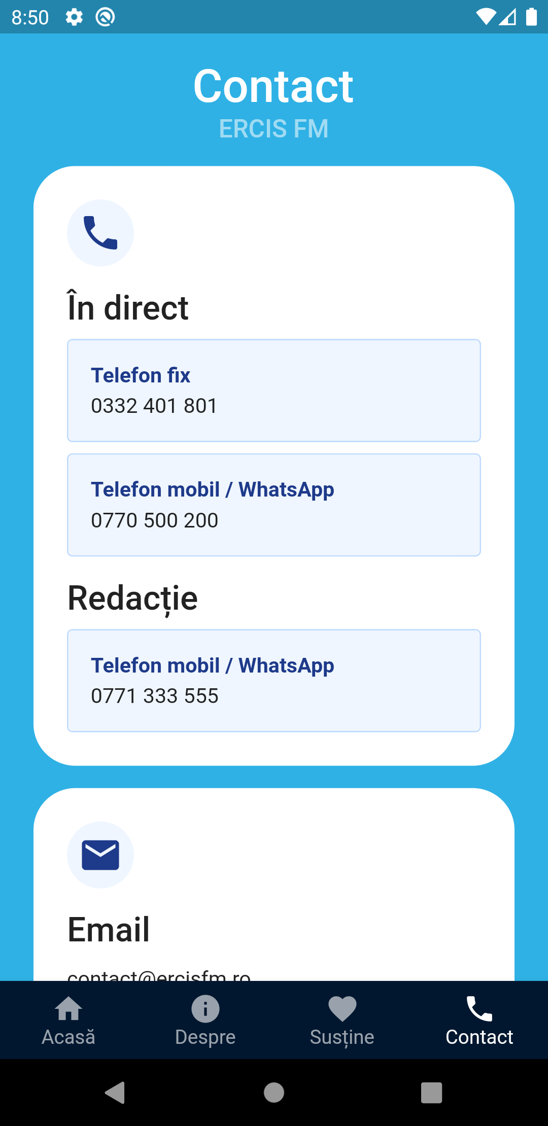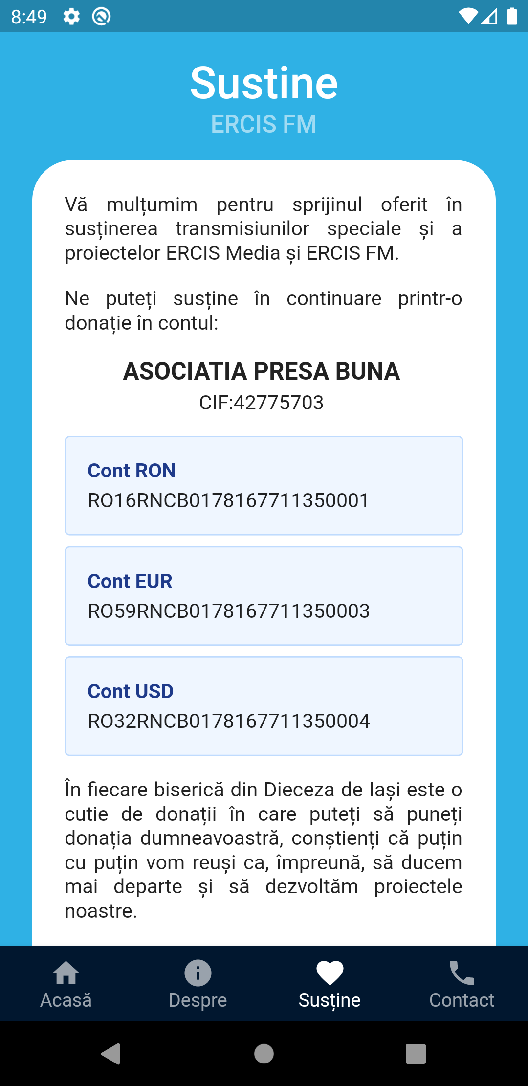 Die Anwendung sendet das Radio ERCIS FM, das Radio der römisch-katholischen Diözese Iași, einen nichtkommerziellen Radiosender, ein Radio mit einem religiös-kulturellen Thema. Es ist ein Kommunikationsmittel zur Unterstützung der Verbreitung von Gottes Wort, das in der Heiligen Schrift zu finden ist und das immer die schönste und hoffnungsvollste Botschaft für Menschen aller Zeiten enthält. Mit dem Slogan "Immer bei dir" möchte ERCIS FM, dass sich alle Zuhörer wirklich begleitet fühlen, wo immer sie sind. Sie geben ihnen nicht nur Informationen, sondern ernähren vor allem ihre Herzen, Seelen durch heilige Messen, Meditationen, Beispiele von Heiligen und Menschen, die entdeckte Gott im Geiste der römisch-katholischen Diözese Iasi und um besser auf die Sensibilität der katholischen Gläubigen in Moldawien zu reagieren.