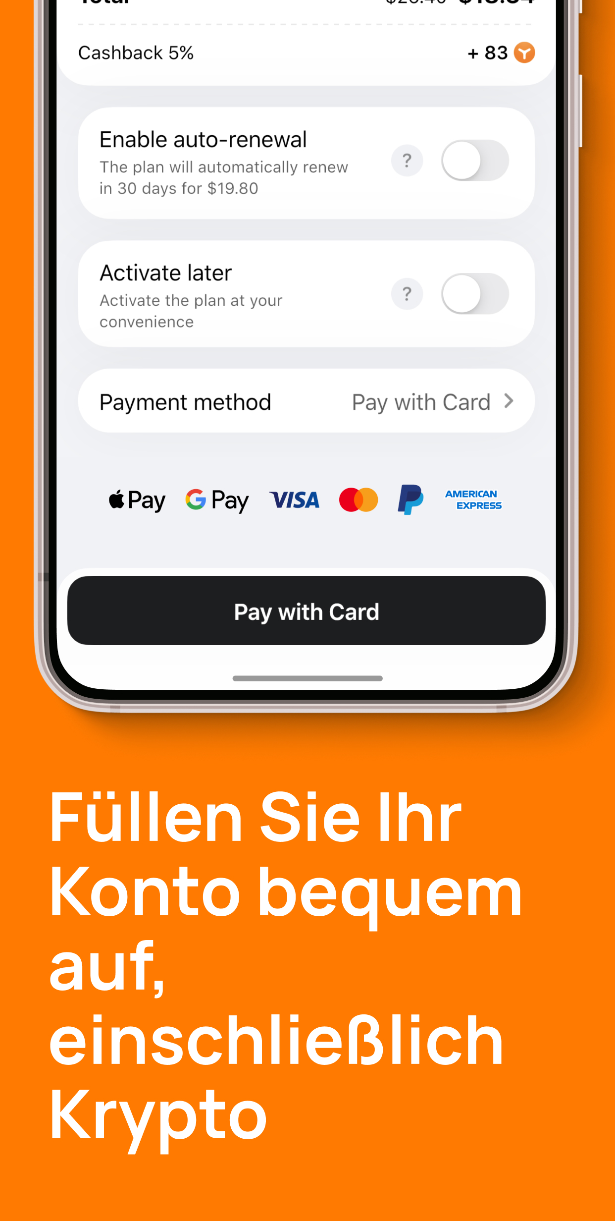 Bleiben Sie mühelos verbunden 🌍, wo immer Sie mit Yesim eSIM reisen. Yesim eSIM bietet zuverlässiges mobiles Internet 📱 in über 200 Reisezielen und ermöglicht es Ihnen, die Welt ohne Roaming-Gebühren oder instabiles Wi-Fi zu erkunden. Bleiben Sie mit schnellem, sicherem und kostengünstigem Internet auf jeder Reise verbunden ✈️. Warum Yesim eSIM wählen? 🌐 Globale Abdeckung: Yesim eSIM bietet Internetabdeckung in über 200 Reisezielen und sorgt so für zuverlässige Konnektivität in großen Städten und abgelegenen Gebieten. Bleiben Sie überall selbstbewusst. 💡 Flexible Datenpläne: Wählen Sie zwischen festen Plänen oder unbegrenztem Internet für bis zu 365 Tage. Yesim eSIM bietet für jede Art von Reise die richtige Option. 💰 Kostengünstige Optionen: Genießen Sie lokale Preise für ausgewählte Reiseziele sowie regelmäßige Rabatte und Sonderangebote. Yesim eSIM bietet eine erschwingliche Möglichkeit, mit wettbewerbsfähigen Tarifen verbunden zu bleiben. 🌟 Unbegrenzte Pläne: Mit Yesim eSIM bedeutet unbegrenzte Daten kontinuierliche Internetverbindung während Ihrer Reise. Bleiben Sie verbunden und navigieren Sie problemlos, während Sie grenzenlos erkunden. 💳 Flexible Zahlungsmethoden: Verwalten Sie Ihre Yesim eSIM ganz einfach mit flexiblen Zahlungsmöglichkeiten, einschließlich Kryptowährungen. Die Yesim-App ermöglicht es Ihnen, schnell einen Plan auszuwählen und sichere Zahlungen für nahtlose Konnektivität zu tätigen. 📱 Universelle Kompatibilität: Yesim eSIM funktioniert mit jedem eSIM-kompatiblen Gerät, einschließlich der neuesten Smartphones und Tablets. 🌍 Internationaler Plan: Bleiben Sie verbunden, wo immer Sie sind, mit Yesims internationalem Plan. Eine eSIM deckt über 140 Länder ab, sodass Sie keine SIM-Karten wechseln müssen. Ideal für Vielreisende und Mehrziel-Reisen! 🛠️ 24/7 Support: Unser engagiertes Support-Team steht Ihnen rund um die Uhr per Live-Chat zur Verfügung, um Ihnen bei der Einrichtung von Yesim eSIM oder bei der Behebung von Internetproblemen zu helfen. So funktioniert Yesim eSIM 📥 Laden Sie die Yesim-App herunter: Laden Sie die App herunter, um Pläne zu durchsuchen und Ihre Verbindung einfach zu verwalten. 🌍 Wählen Sie Ihren eSIM-Plan: Wählen Sie aus über 200 Zielen und Optionen – von minimalen Daten bis zu unbegrenztem Internet. 🔗 Installieren und sofort verbinden: Kaufen und aktivieren Sie Ihre Yesim eSIM mit nur einem Tipp. Nach der Installation werden Sie sofort mit einem lokalen Netzwerk verbunden und haben sofortigen Zugang zu Daten. Warum Reisende Yesim eSIM wählen ⏰ Sofortige Konnektivität: Greifen Sie innerhalb von Minuten mit unserer digitalen eSIM-Aktivierung auf das Internet zu. 🚫 Keine Roaming-Gebühren: Mit Yesim eSIM können Sie hohe Roaming-Gebühren vermeiden, indem Sie erschwingliche Datenpläne wählen. 🆔 Digitale SIM-Aktivierung: Keine physische SIM erforderlich, genießen Sie die digitale Aktivierung für eine unterbrechungsfreie Internetverbindung. 🔧 Flexible Datenpläne: Passen Sie Ihren Datenplan mit verschiedenen Internetoptionen an, die zu Ihrer Reise passen. 📊 Nahtlose Verwaltung: Verwenden Sie eine benutzerfreundliche App zur Verwaltung von Internet, Daten und Ihrer virtuellen SIM. Erleben Sie die Zukunft der mobilen Reisekonnektivität mit Yesim eSIM Reisen Sie ohne Sorgen mit Yesim eSIM, ohne die Notwendigkeit von physischen SIM-Karten. Bleiben Sie verbunden, ohne versteckte Gebühren oder Störungen, verwalten Sie Ihr Internet mühelos und genießen Sie sicheren Zugriff, wo immer Sie sind. Ihr perfekter Reisebegleiter 🗺️. Erfahren Sie mehr über Yesim eSIM Website: https://yesim.app/ Datenschutzrichtlinie: https://yesim.app/privacy-policy/ Nutzungsbedingungen: https://yesim.app/terms-of-service/