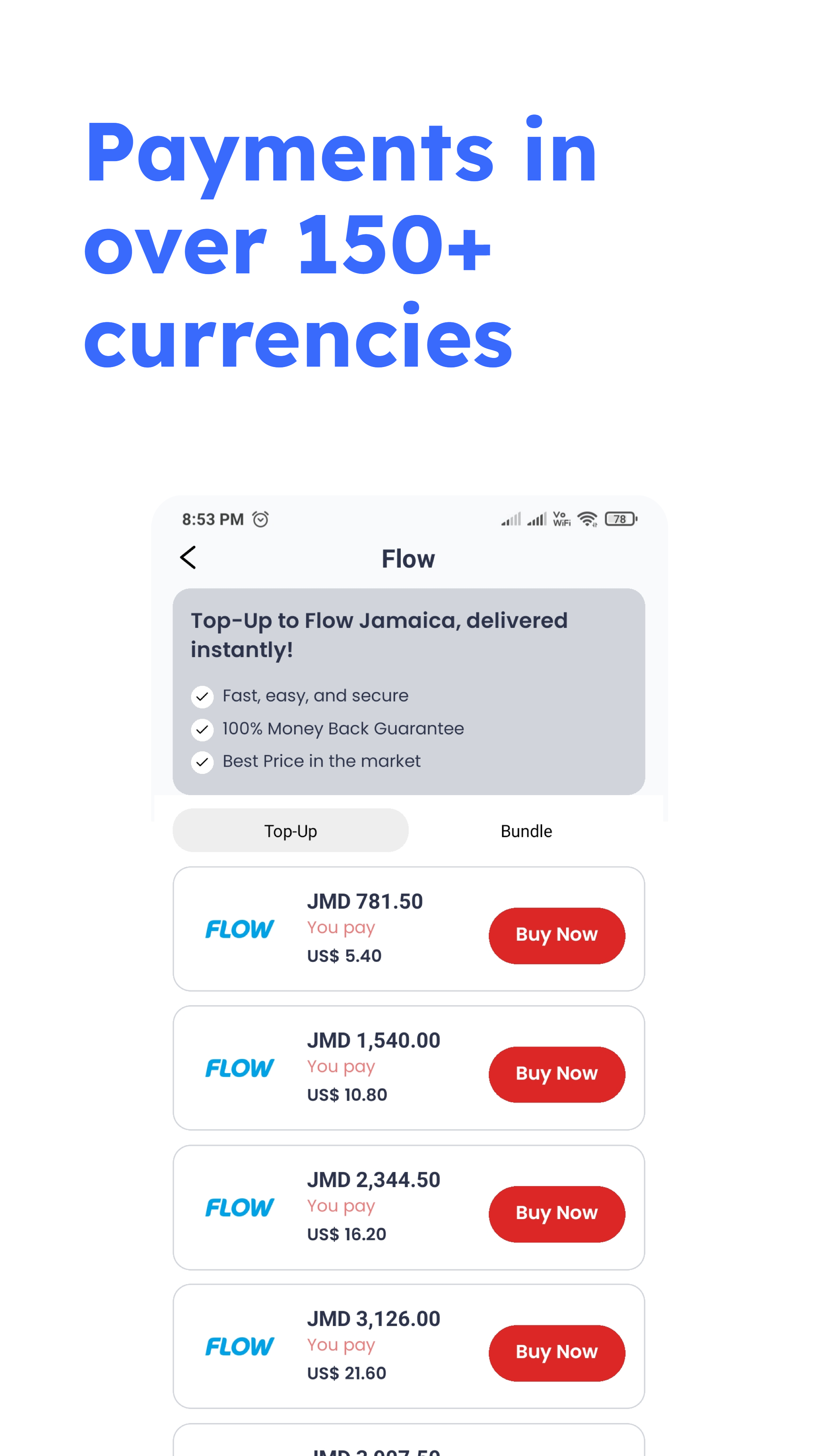 Global: Digicel, Flow, Lycamobile, Movistar, Telcel, Etisalat, Altice, Cubacel, BTC, Ethio Telecom, Ncell, Tigo, Lime, Vodafone, Orange, Airtel, MTN und viele mehr!