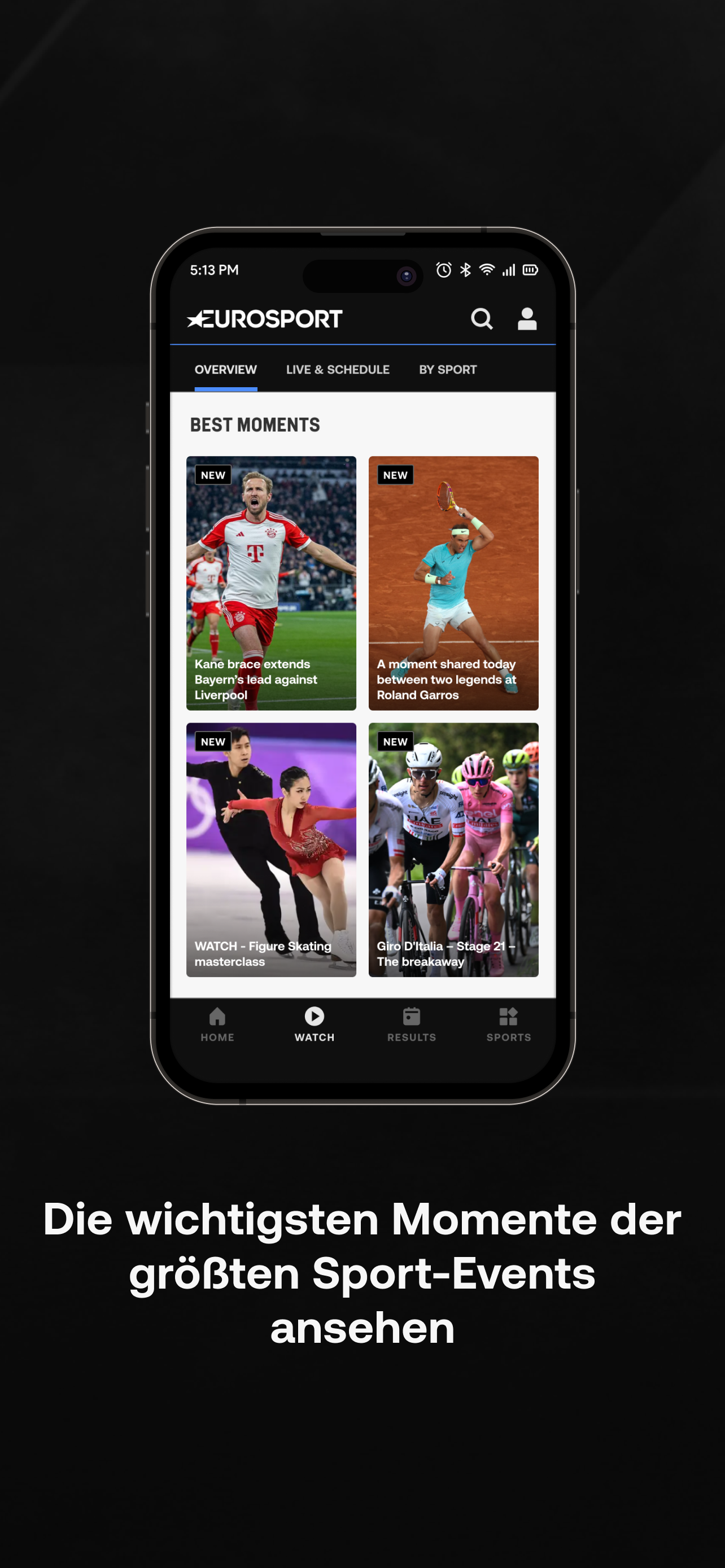 Mit dem kostenlosen Zugang zur Eurosport-App öffnet sich die Tür in die Welt des Sports. Genieße stundenlang Highlights und emotionale Momente im Video. Des Weiteren versorgen wir dich mit einer Vielzahl von Stories rund um Deine Lieblingssportarten. Interviews und Hintergrundberichte runden unser ausführliches Angebot in Fußball, Tennis, Radsport, Snooker, Motorsport, Wintersport und vielen weiteren Sportarten ab.