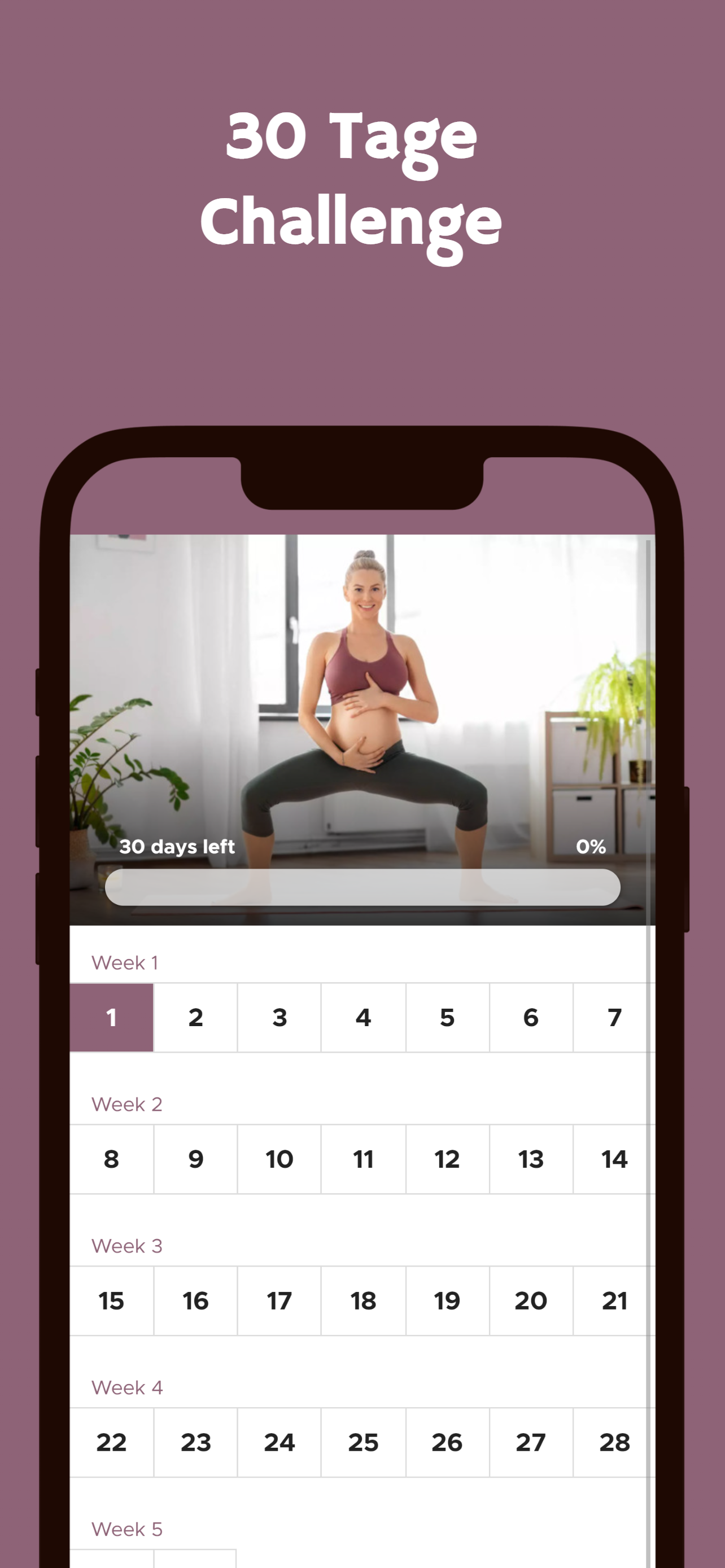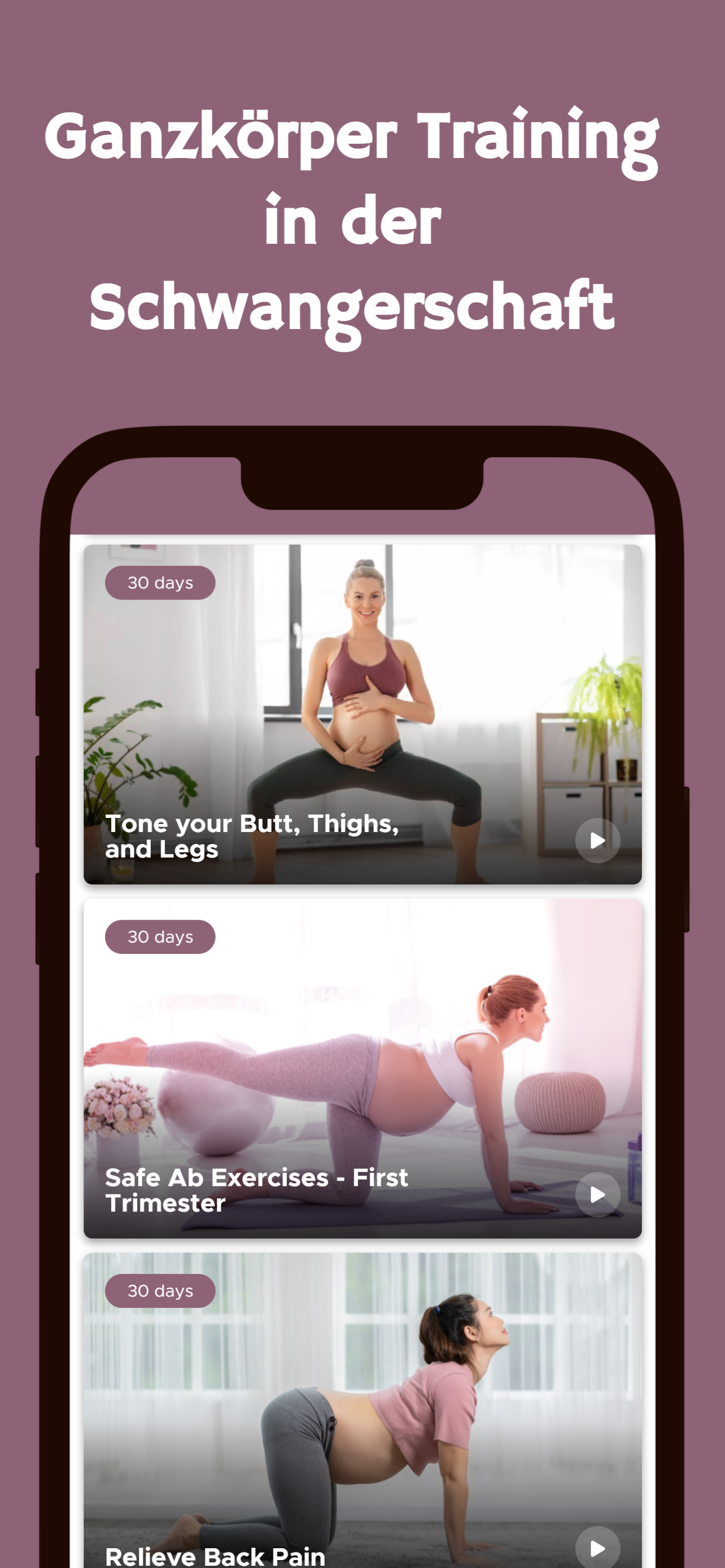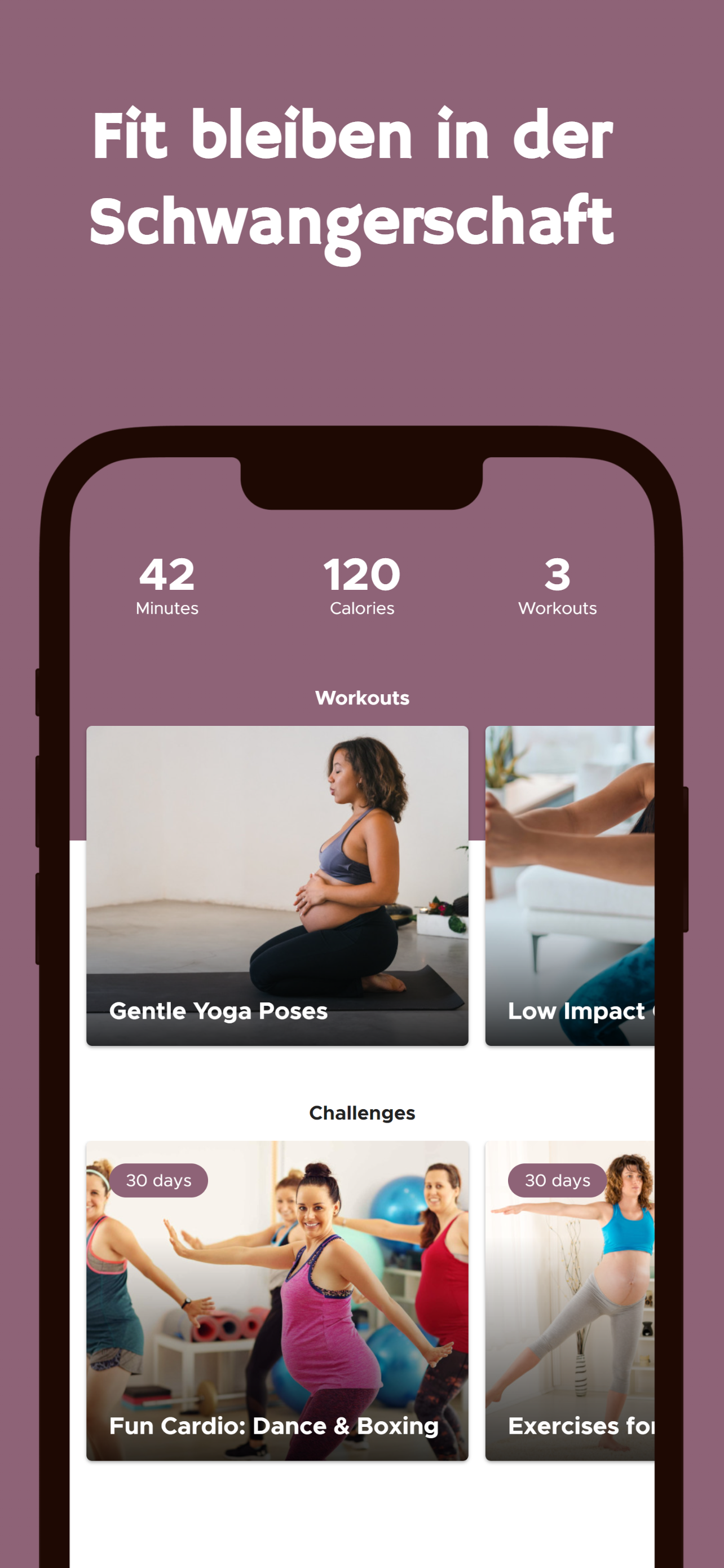 Bewegung in der Schwangerschaft wirkt Wunder - für Sie und Ihr Baby. Wenn Sie schwanger sind, ist es wichtig, dass Sie in Bewegung bleiben. Schwangere Frauen, die sich ausreichend bewegen, haben weniger Rückenschmerzen und mehr Energie. Nach der Entbindung werden Sie schneller wieder zu Ihrer Form von vor der Schwangerschaft zurückfinden. Unsere Cardio-Workouts mit geringer Belastung sind auch während der Schwangerschaft perfekt. Diese vorgeburtlichen Cardio-Übungen bringen Sie ganz schön ins Schwitzen und verbrennen jede Menge Kalorien. Das Training ist für jedes Trimester geeignet, es schont Ihren Beckenboden und trainiert Ihren Kern und Ihre Bauchmuskeln, ohne Sie zu gefährden. Die App enthält Übungen, die für schwangere Frauen geeignet sind. Die Übungen werden zu Hause mit dem eigenen Körpergewicht, Hanteln oder einem Gymnastikball (Swiss Ball) ausgeführt. Selbst als Anfängerin können Sie jede Übung in dieser App ausführen. Wir haben sichere Übungen hinzugefügt, die in jedem Trimester der Schwangerschaft ausgeführt werden können. Stärken Sie Ihren Körper für die Schwangerschaft und darüber hinaus mit diesen sicheren Übungen, die Sie höchstwahrscheinlich bis zum Tag der Entbindung durchführen können. Solange Sie die notwendigen Vorsichtsmaßnahmen treffen und eine gute Technik anwenden (d. h. langsame, kontrollierte Bewegungen), ist Krafttraining eine hervorragende Möglichkeit, Ihre Muskeln zu straffen und zu stärken. Der Aufbau von Kraft während der Schwangerschaft bereitet Sie auf das Heben des Babys vor, das Sie bald tun werden! Pilates kann jede Phase der Schwangerschaft, der Geburt und des Wochenbetts unterstützen. Egal, ob Sie Anfängerin oder begeisterte Sportlerin sind, eine qualifizierte Trainerin kann das Training auf Ihre Bedürfnisse abstimmen und Sie dennoch sicher fordern. Das Training konzentriert sich sowohl auf Kontraktionsübungen als auch auf Kegels, um die Beckenbodenmuskulatur zu entspannen und zu lockern, sowie auf einen vollen Bewegungsumfang während der Bewegungen. Schwangerschaftsdehnungen können Ihnen helfen, sich besser zu fühlen, vor allem, wenn die Schwangerschaft fortschreitet. Übungen für den Rücken, wie z. B. diese Dehnung des unteren Rückens, können Rückenschmerzen lindern. Für schwangere Frauen kann Dehnen viele Vorteile bieten. Es kann Ihnen helfen, fit und entspannt zu bleiben und sich auf die Wehen vorzubereiten. Noch wichtiger ist jedoch, dass sie dazu beitragen können, einige der Schmerzen zu lindern, die Sie möglicherweise haben. Es ist einfach und sicher, Ihre Bauchmuskeln während der Schwangerschaft zu trainieren - mit den richtigen Modifikationen. Hier erfahren Sie, wie Sie Ihre Bauchmuskeln in Topform halten können. Sie können Maßnahmen ergreifen, um Ihre Fitness zu erhalten und Ihre Bauchmuskeln während der Schwangerschaft zu stärken. Regelmäßiges Training in der Schwangerschaft hilft: - Sie helfen Ihnen, das Gewicht zu tragen, das Sie in der Schwangerschaft zunehmen. - Sie bereiten sich auf die körperlichen Herausforderungen von Geburt und Wochenbett vor. - Ihre Stimmung verbessern und Ihnen Energie geben. - Es kann Ihnen helfen, besser zu schlafen. - Sie können nach der Geburt leichter wieder in Form kommen.