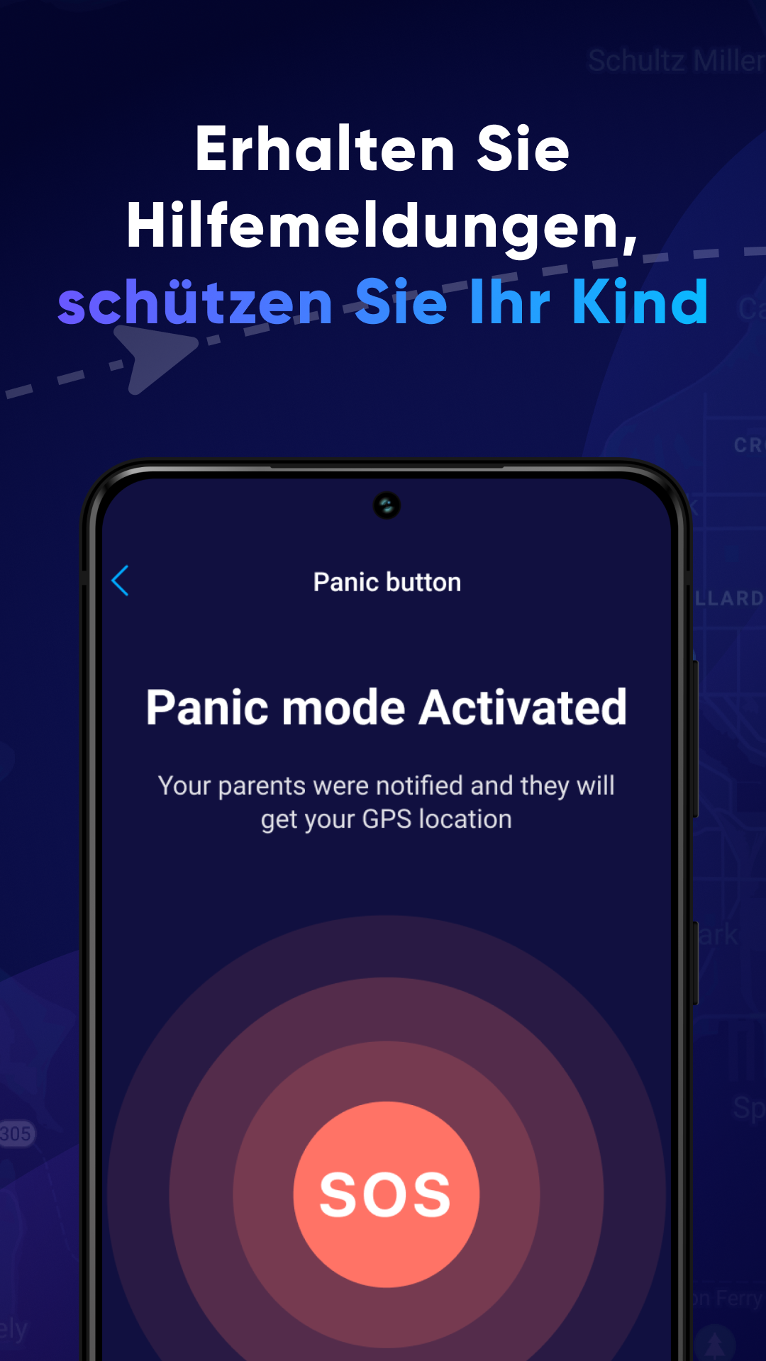 - Wenn Ihr Kind in Gefahr ist, kann es die Paniktaste drücken, um einen sofortigen Alarm zu senden.