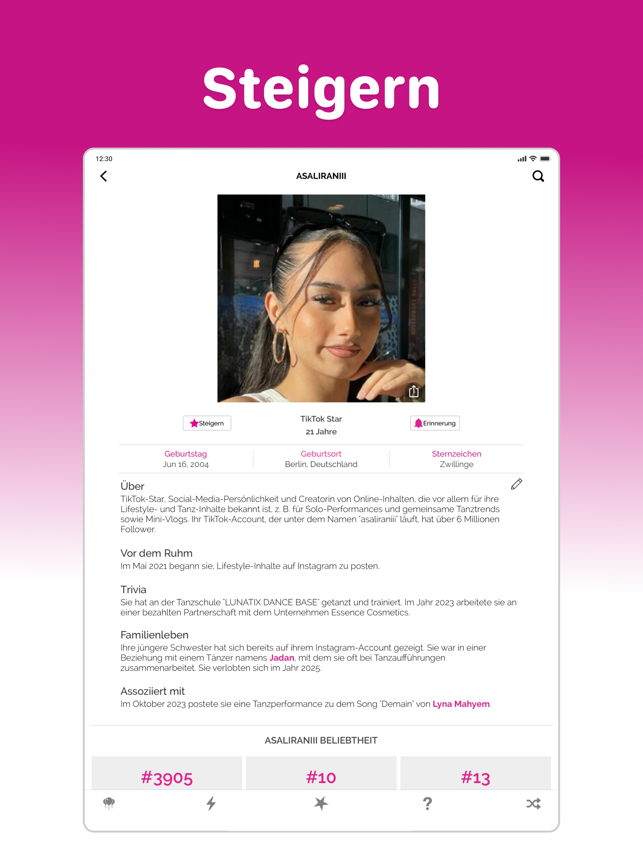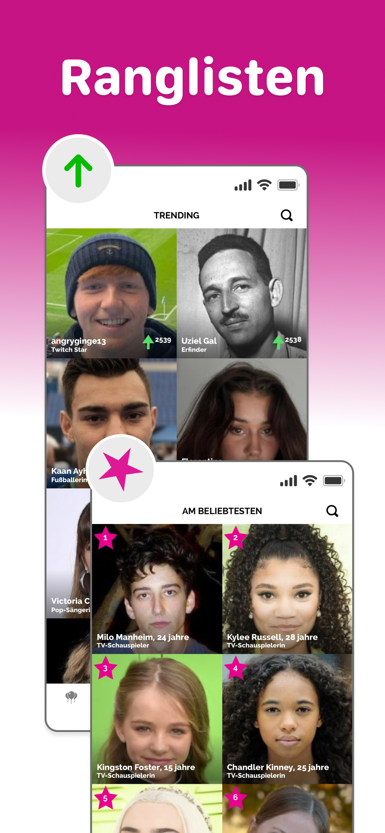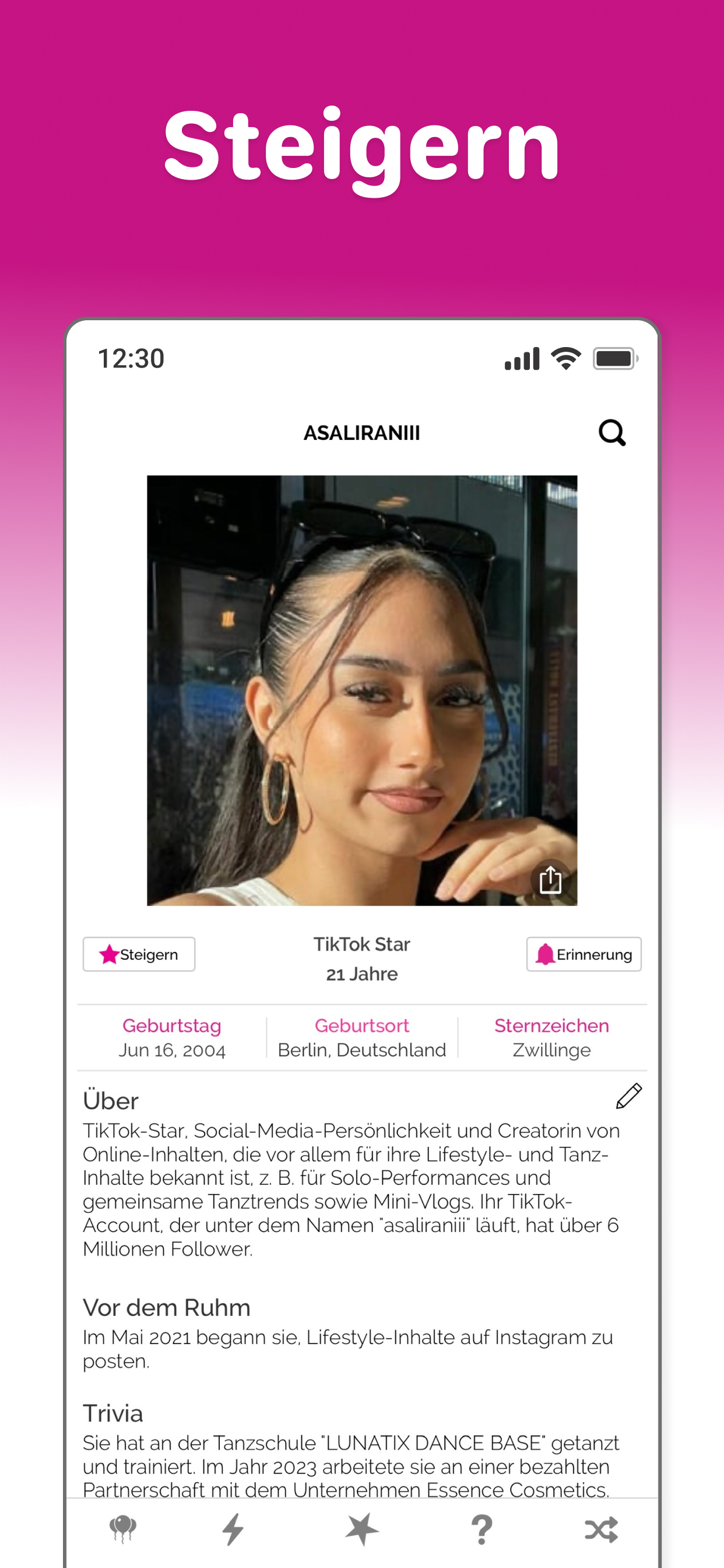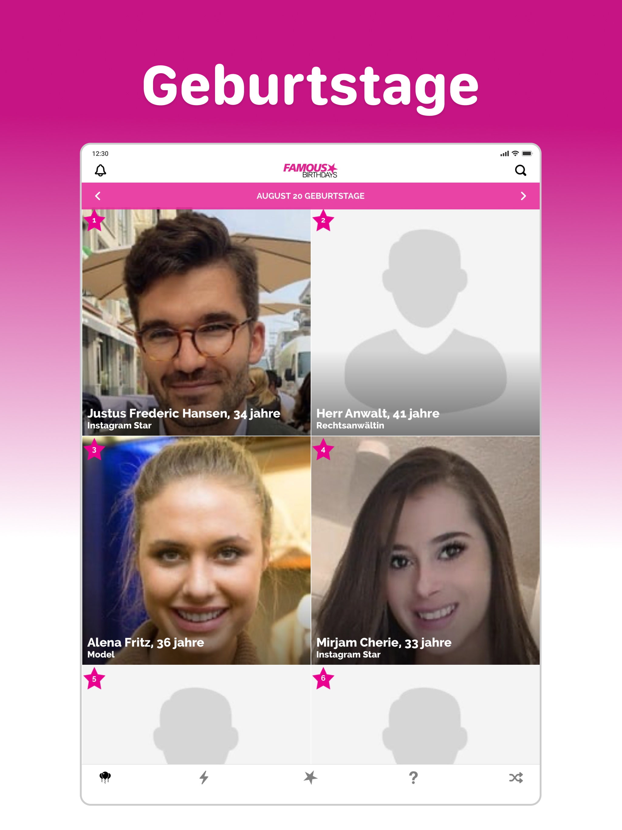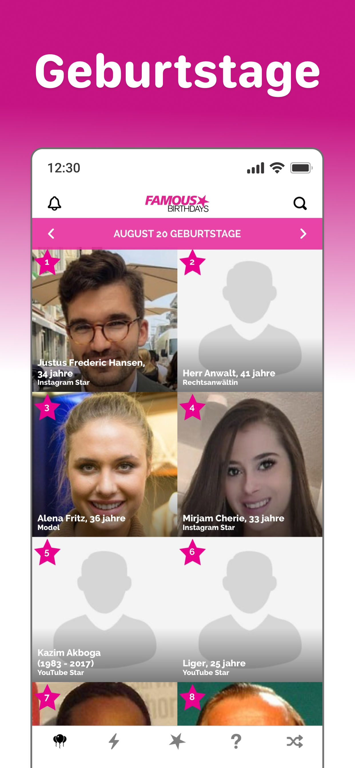 Famous Birthdays ist das ultimative Ziel, um mehr über Prominente und Creator zu erfahren und deine Favoriten zu pushen, um ihre Popularität zu steigern. Starte jeden Tag mit den Top-Geburtstagen und entdecke, wer gerade im Trend liegt – und teste dein Wissen mit spannenden Promi-Quizspielen. Entdecke die Top-Geburtstage von heute Täglich neue Geburtstage und Profile – erfahre alles über ihren Aufstieg zum Ruhm, wichtige Meilensteine und bekannte Verbindungen. Sieh dir Charts der Trends und Beliebtesten an Verfolge tägliche Popularitäts-Charts und entdecke, wer aktuell im Trend liegt und wer am beliebtesten ist. Pushe deine Lieblingsstars Unterstütze deine Lieblingsstars, indem du ihre Popularität steigerst. Erhalte Geburtstags-Erinnerungen Lass dich benachrichtigen, wenn deine Lieblingsstars Geburtstag haben. Schnellsuche Finde Prominente und Creator einfach nach Name, Geburtstag, Geburtsort, Beruf, Filmen, Serien und mehr. Spiele Promi-Quiz Teste dein Wissen über Promis und Creator mit Spielen wie: Wer bin ich?, Errate ihr Alter, Wer ist beliebter?, Wer hat mich gespielt? und Errate den Cast.