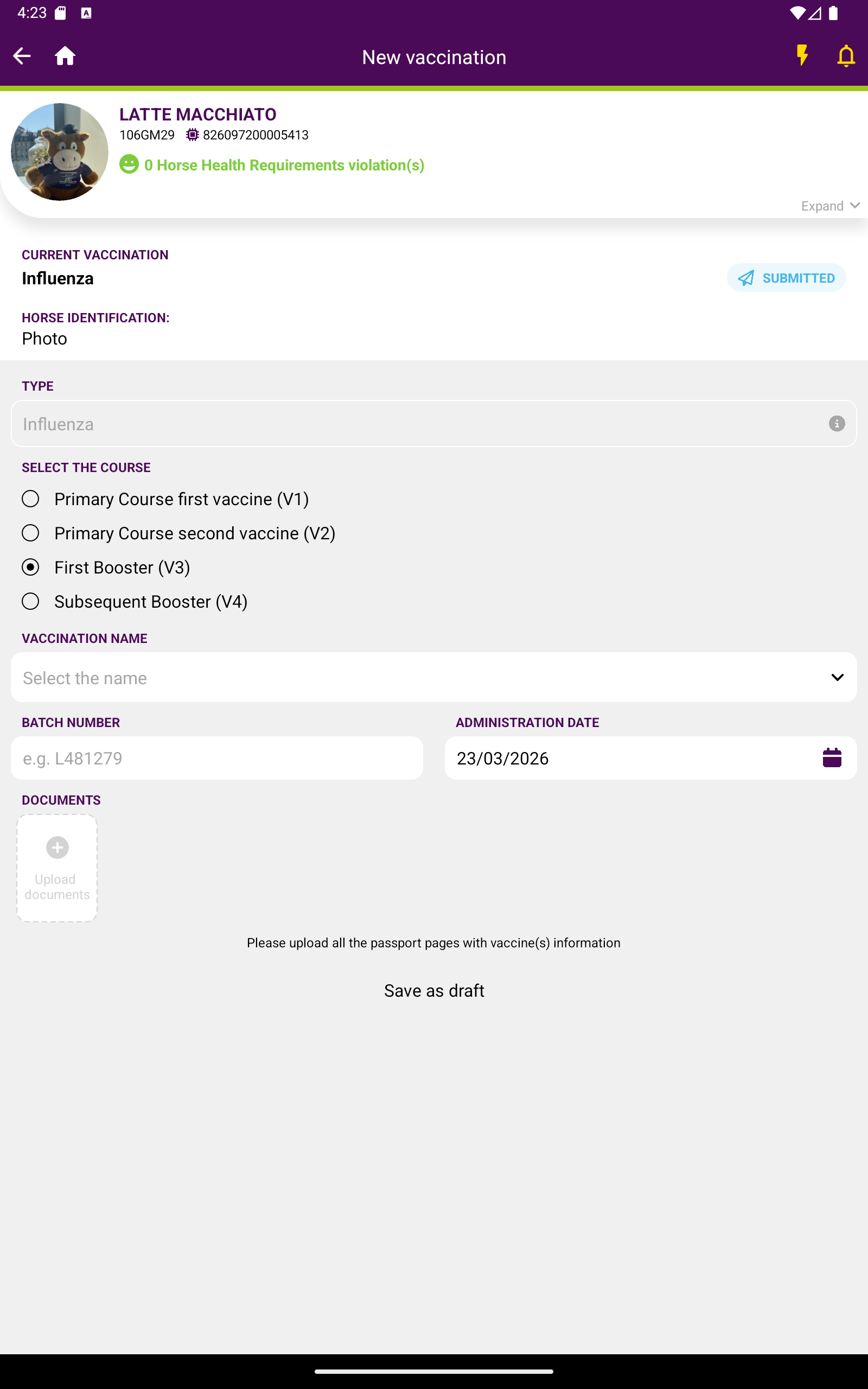 The newly released version 3.23.0 is now available. Features - Design: New horse scan and horse identification pages. - Horse search: Now old microchip numbers are supported. Fixes - Vaccinations: Fixed an issue with refused expired vaccinations. - Camera: Improved camera stability. - Technical: Improved overall app performance and stability.