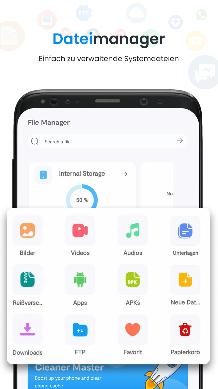 Mit dem kostenlosen file manager können Sie nicht nur Dateien suchen und organisieren, sondern auch den Cache Ihres Mobiltelefons leeren, um Speicherplatz freizugeben. Entfernen Sie Junk-Dateien und genießen Sie mehr Speicherplatz storage. Mit der App "Meine Dateien" files browser, file commander können Sie den Dateispeicher verwalten.