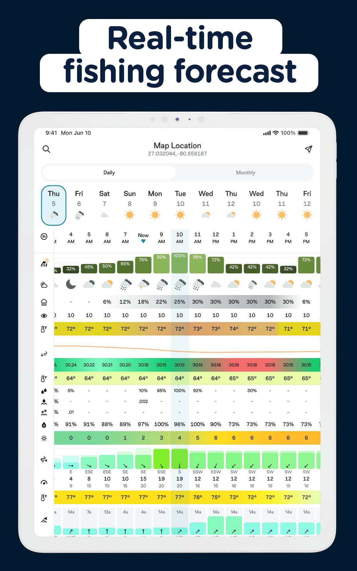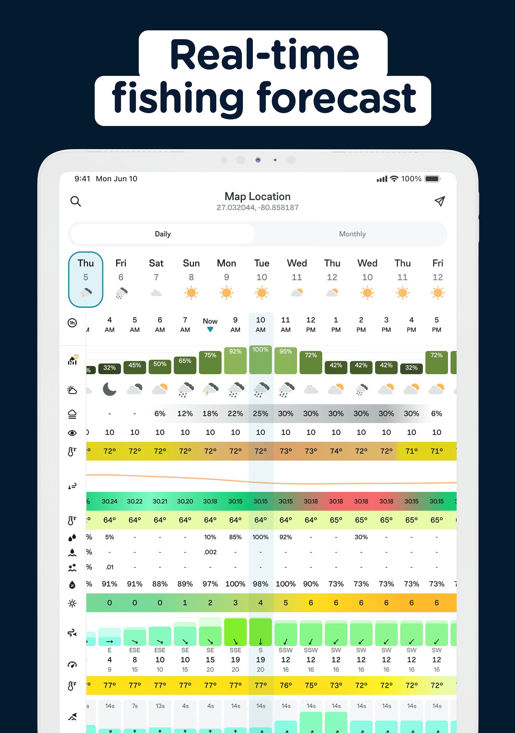 - Angelvorhersagen – Verfolgen Sie stündlich Gezeiten, Wind, Mondphasen, Luftdruck und Fischaktivität.
