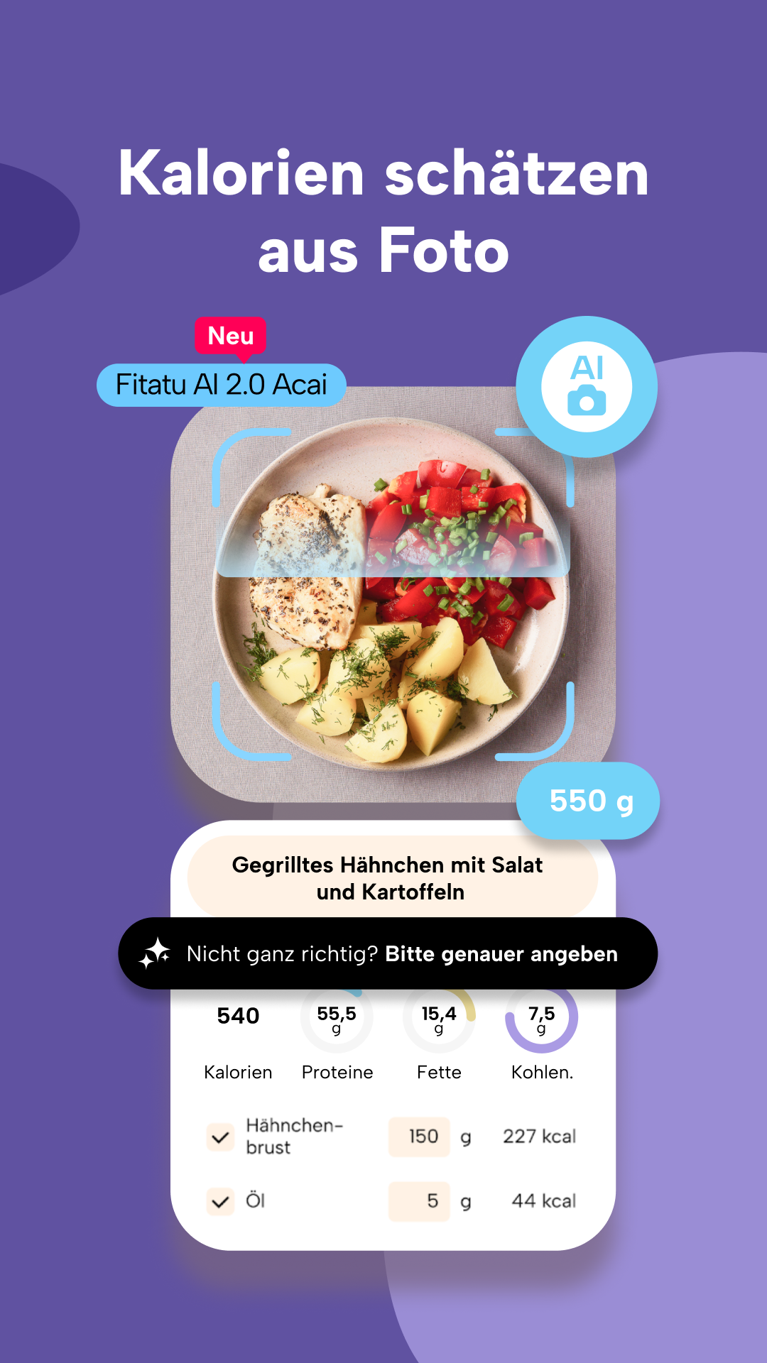 Eine echte Neuheit! Fitatu AI 2.0 Acai läutet eine neue Ära der Kalorienschätzung per Foto ein und setzt einen neuen Maßstab unter Kalorienzählern. Mit der Funktion „Genauer angeben“ hast du volle Kontrolle über jedes Gramm deiner Mahlzeit. Kein Raten mehr - nur höhere Genauigkeit bei Kalorien, Gewicht und Makros. Lass dich von anderen Apps nicht täuschen - setze auf volle Kontrolle mit Fitatu.