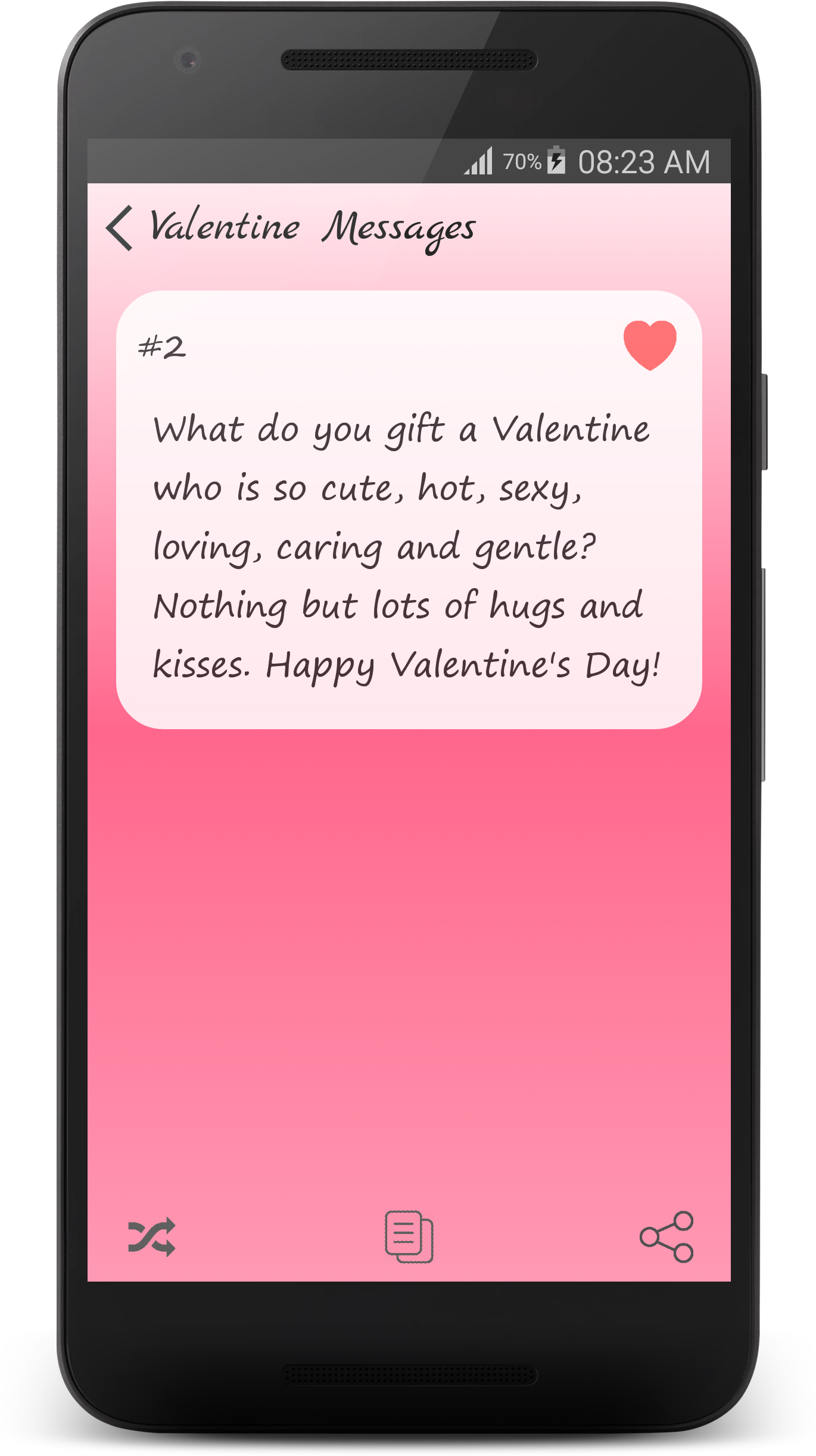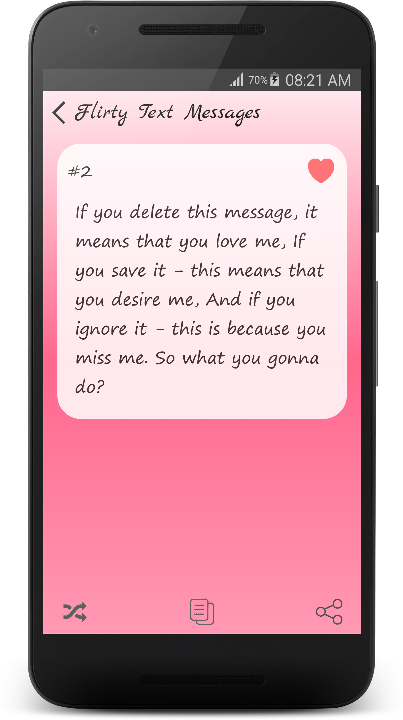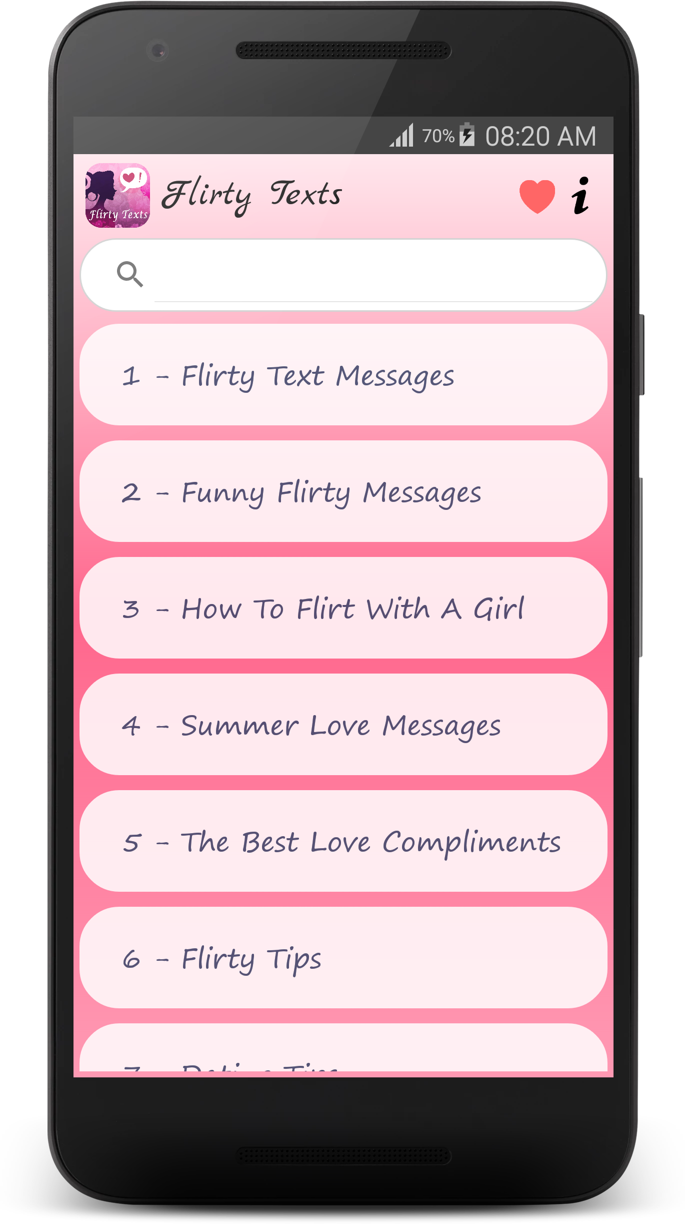 ☆☆☆ Flirty Texts - Special Love Messages Collection ☆☆☆ - Are you looking for Flirty Texts Examples and Love Messages? - Are you want to send a sexy or clever Flirt SMS to him or her? This cool Flirty Texts app can help! This Flirty Texts app is a collection of flirt sms, sweet sms, compliments, sweet text messages and cute flirty texts for him or for her. Pick from a wide selection of the best Flirt SMS messages, and let that special someone know how you feel! Our Flirty Texts is an app developed which contains many flirty tips and love sms to create, maintain and fulfill your love. Flirty Texts is an App that stores many Flirting Text Messages that you can use with the one you love. They are very cute & cool. He or She will love these messages. We will continue adding new messages timely. ☆☆☆ Categories of Messages in this Flirty Texts App ☆☆☆ ♥ [Hot Sms] Flirty Text Messages ♥ [Hot Sms] Sexy Text Messages ♥ [Hot Sms] Romantic Love Messages ♥ [Hot Sms] I Miss You Messages ♥ [Hot Sms] Cute Love Messages ♥ [Special Tips] How To Flirt With A Girl ♥ [Special Tips] Flirty Message Tips ♥ [Special Tips] Pick Up Lines ♥ [Special Tips] Dating Tips ♥ I Love You Messages ♥ The Best Compliments For Lover ♥ Valentine Messages ♥ Kiss Messages ♥ Honey's Birthday Messages ♥ Sweet Love Messages ♥ Heart Touching Messages ♥ Funny Flirty Messages ♥ Good Morning Messages ♥ Good Night Messages ♥ Love Quotes ♥ Lovely Nick Names ♥ Sorry Messages ♥ Break Up Quotes ♥ Sad Love ♥ Broken Heart ♥ Crush Quotes ♥ Funny Love Messages ♥ Christmas Love messages ♥ New Year Love Messages ♥ Love Poems ♥ [New Sms] Summer Love Messages ☆☆☆ App Features ☆☆☆ ★ Absolutely FREE with Impressive & Beautiful design! ★ Completely Offline Database (App can be processed without Internet). ♥♥♥ Ready to win over your sweetheart with love messages in our app ♥♥♥ ★ Copy, Share Flirt Texts and Love Messages to your loved once with only one touch. ★ Various types of flirty texts such as beautiful hug and kiss messages,romantic quote, messages of love, valentine messages, romantic love quotes, cute message, romantic massage to make you cherish and enjoy each and every kiss that comes your way. ★ Romantic Love Messages for girlfriend, boyfriend, husband, wife and all type of true love messages in one app. What a wonderful application! ★ Cute love poems are motivating and inspirational. Inspirational poems about love are the verbal expression of the feeling of people who are falling in love or who have failed in love. ★ If you want to show your love in the most meaningful way, this app is a good way to express your love and happiness will be always around you. "Flirty Texts" is a special love application. It is huge collection of romantic love messages and flirty messages for your loving life Don't be mushy and start to build your love dreams now! HOPEFULLY YOU & YOUR FRIENDS ALWAYS HAVE A LIFE FULFILLED WITH LOVE !! These are just basic features. We plan to have more great features adding on timely and also with more Flirty Texts. Flirty Texts is a nice application. It contains collection of compliments, sweet text message and sexy flirty messages for your LOVE. Get a sample of free flirty text messages and enjoy it today! Disclaimer: All messages are gathered from the web. We do not express any ownership of these messages. In case if any of these messages violated your copyright to remove the discrepancy. please send us an e-mail. We will respond at earliest. If you want to have more apps with high quality design and features, you can Rate 5 stars for the app and give us good comments. - Life Hack Studio - TAG: flirty texts, love texts, love message, flirty messages, flirty sms, hot messages, flirt sms, sexy sms, hot sms, Heart Touching text, lovely texting, Romantic Messages, Flirty Tips, Pick Up Lines, Dating Tips, Love messages, smart love lines, summer love