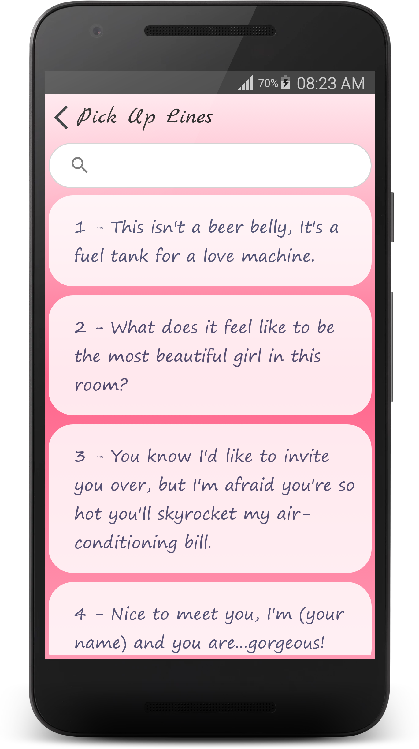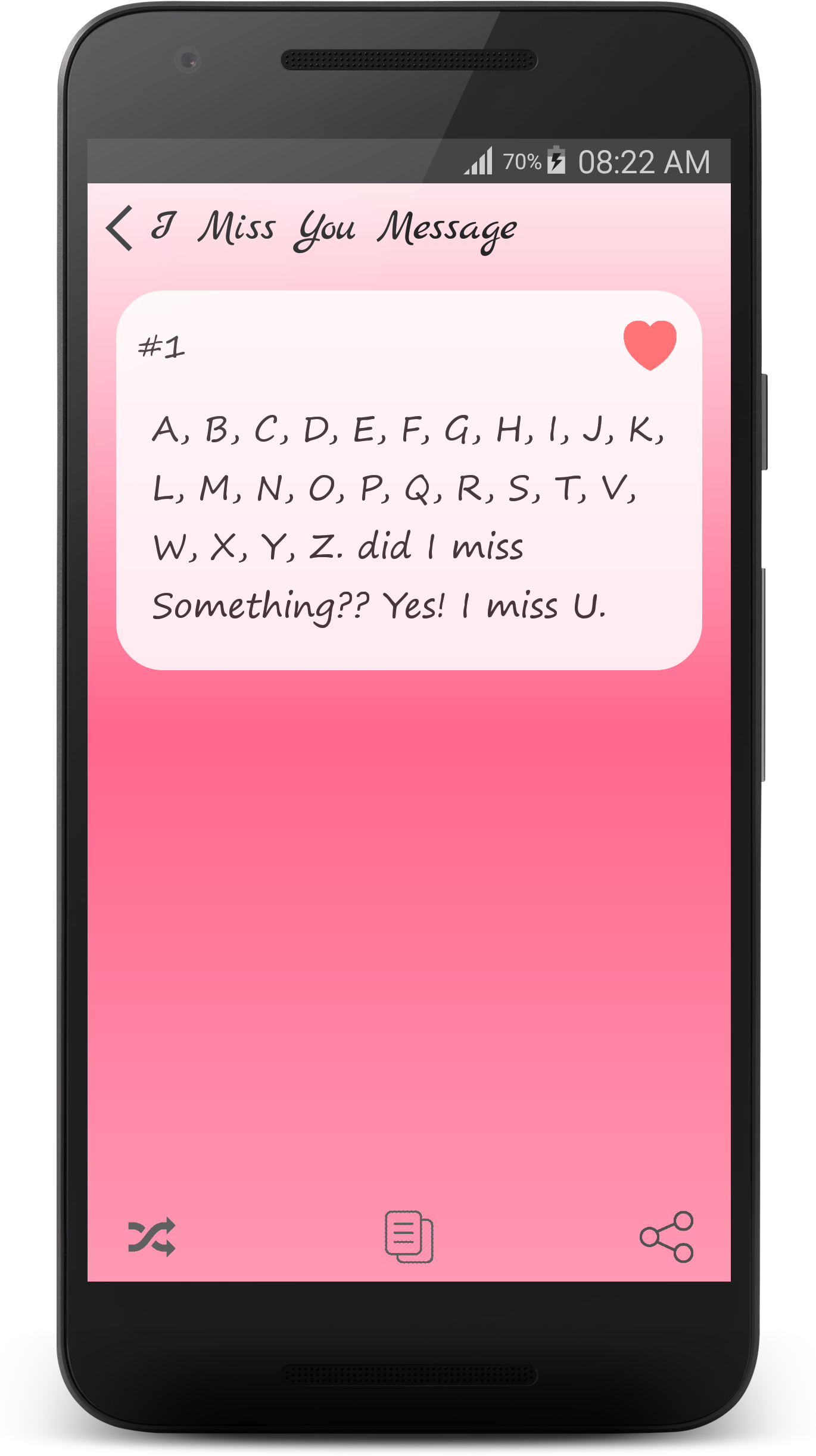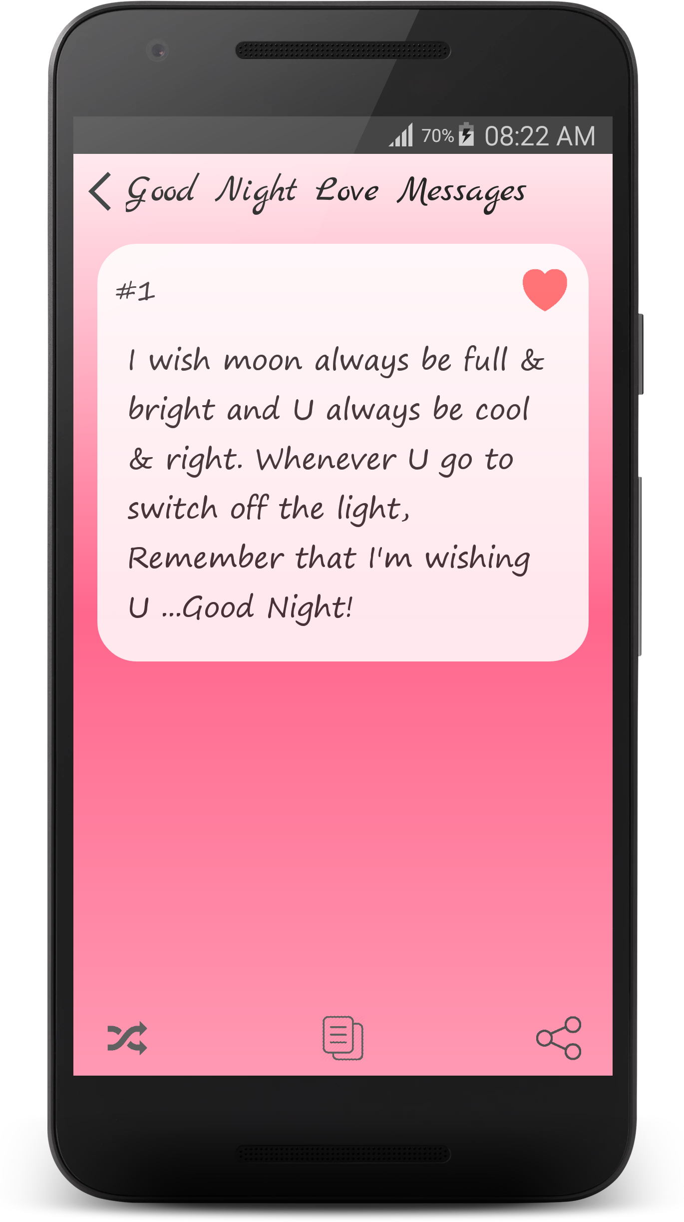 ☆☆☆ Flirty Texts - Special Love Messages Collection ☆☆☆ - Are you looking for Flirty Texts Examples and Love Messages? - Are you want to send a sexy or clever Flirt SMS to him or her? This cool Flirty Texts app can help! This Flirty Texts app is a collection of flirt sms, sweet sms, compliments, sweet text messages and cute flirty texts for him or for her. Pick from a wide selection of the best Flirt SMS messages, and let that special someone know how you feel! Our Flirty Texts is an app developed which contains many flirty tips and love sms to create, maintain and fulfill your love. Flirty Texts is an App that stores many Flirting Text Messages that you can use with the one you love. They are very cute & cool. He or She will love these messages. We will continue adding new messages timely. ☆☆☆ Categories of Messages in this Flirty Texts App ☆☆☆ ♥ [Hot Sms] Flirty Text Messages ♥ [Hot Sms] Sexy Text Messages ♥ [Hot Sms] Romantic Love Messages ♥ [Hot Sms] I Miss You Messages ♥ [Hot Sms] Cute Love Messages ♥ [Special Tips] How To Flirt With A Girl ♥ [Special Tips] Flirty Message Tips ♥ [Special Tips] Pick Up Lines ♥ [Special Tips] Dating Tips ♥ I Love You Messages ♥ The Best Compliments For Lover ♥ Valentine Messages ♥ Kiss Messages ♥ Honey's Birthday Messages ♥ Sweet Love Messages ♥ Heart Touching Messages ♥ Funny Flirty Messages ♥ Good Morning Messages ♥ Good Night Messages ♥ Love Quotes ♥ Lovely Nick Names ♥ Sorry Messages ♥ Break Up Quotes ♥ Sad Love ♥ Broken Heart ♥ Crush Quotes ♥ Funny Love Messages ♥ Christmas Love messages ♥ New Year Love Messages ♥ Love Poems ♥ [New Sms] Summer Love Messages ☆☆☆ App Features ☆☆☆ ★ Absolutely FREE with Impressive & Beautiful design! ★ Completely Offline Database (App can be processed without Internet). ♥♥♥ Ready to win over your sweetheart with love messages in our app ♥♥♥ ★ Copy, Share Flirt Texts and Love Messages to your loved once with only one touch. ★ Various types of flirty texts such as beautiful hug and kiss messages,romantic quote, messages of love, valentine messages, romantic love quotes, cute message, romantic massage to make you cherish and enjoy each and every kiss that comes your way. ★ Romantic Love Messages for girlfriend, boyfriend, husband, wife and all type of true love messages in one app. What a wonderful application! ★ Cute love poems are motivating and inspirational. Inspirational poems about love are the verbal expression of the feeling of people who are falling in love or who have failed in love. ★ If you want to show your love in the most meaningful way, this app is a good way to express your love and happiness will be always around you. "Flirty Texts" is a special love application. It is huge collection of romantic love messages and flirty messages for your loving life Don't be mushy and start to build your love dreams now! HOPEFULLY YOU & YOUR FRIENDS ALWAYS HAVE A LIFE FULFILLED WITH LOVE !! These are just basic features. We plan to have more great features adding on timely and also with more Flirty Texts. Flirty Texts is a nice application. It contains collection of compliments, sweet text message and sexy flirty messages for your LOVE. Get a sample of free flirty text messages and enjoy it today! Disclaimer: All messages are gathered from the web. We do not express any ownership of these messages. In case if any of these messages violated your copyright to remove the discrepancy. please send us an e-mail. We will respond at earliest. If you want to have more apps with high quality design and features, you can Rate 5 stars for the app and give us good comments. - Life Hack Studio - TAG: flirty texts, love texts, love message, flirty messages, flirty sms, hot messages, flirt sms, sexy sms, hot sms, Heart Touching text, lovely texting, Romantic Messages, Flirty Tips, Pick Up Lines, Dating Tips, Love messages, smart love lines, summer love
