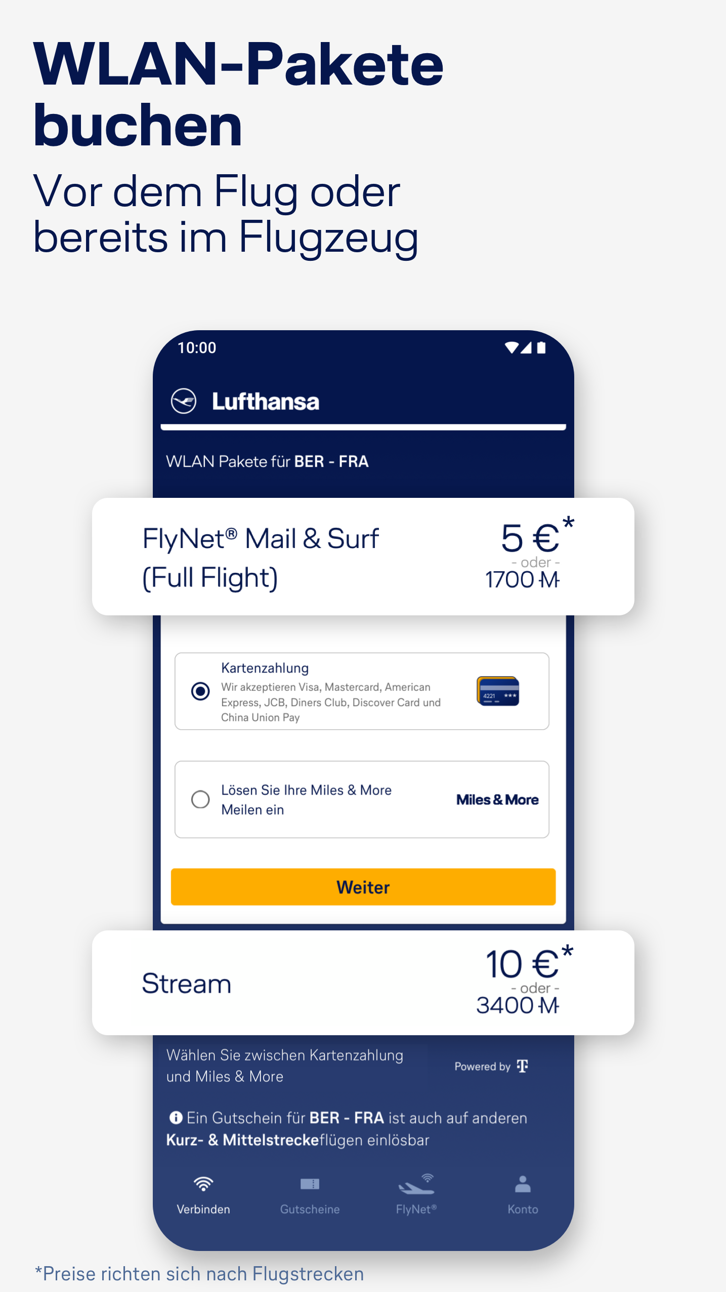 Hinterlegen Sie Ihre Daten, um noch schneller FlyNet® und das Internet an Bord nutzen zu können. Speichern Sie Ihre bevorzugte Bezahlmethode, um Konnektivität per Sofortkauf zu erwerben. Rufen Sie an Bord Ihre gespeicherten Gutscheine ab und lösen Sie sie ein.