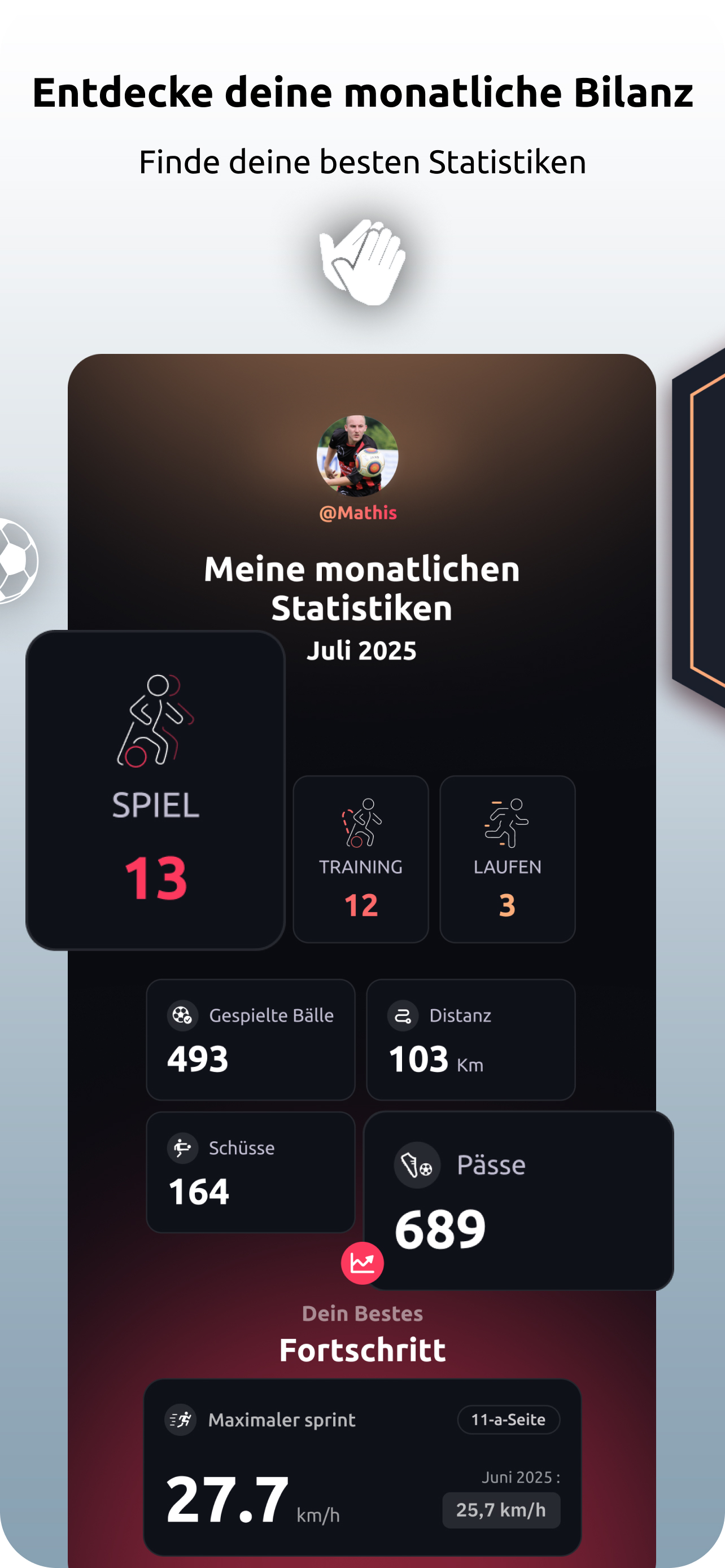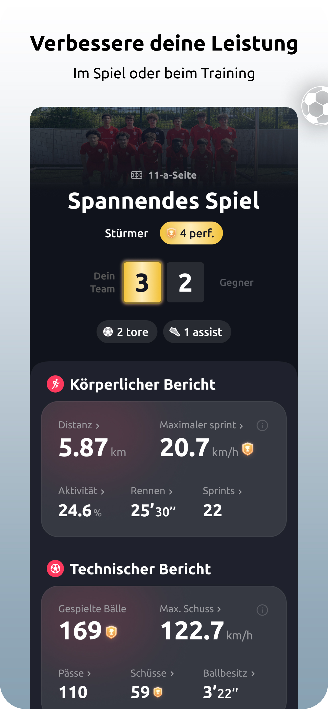 Erhalte deine Statistiken nach jeder Fußballsitzung, vergleiche dich mit Profispielern und deinen Mitspielern.