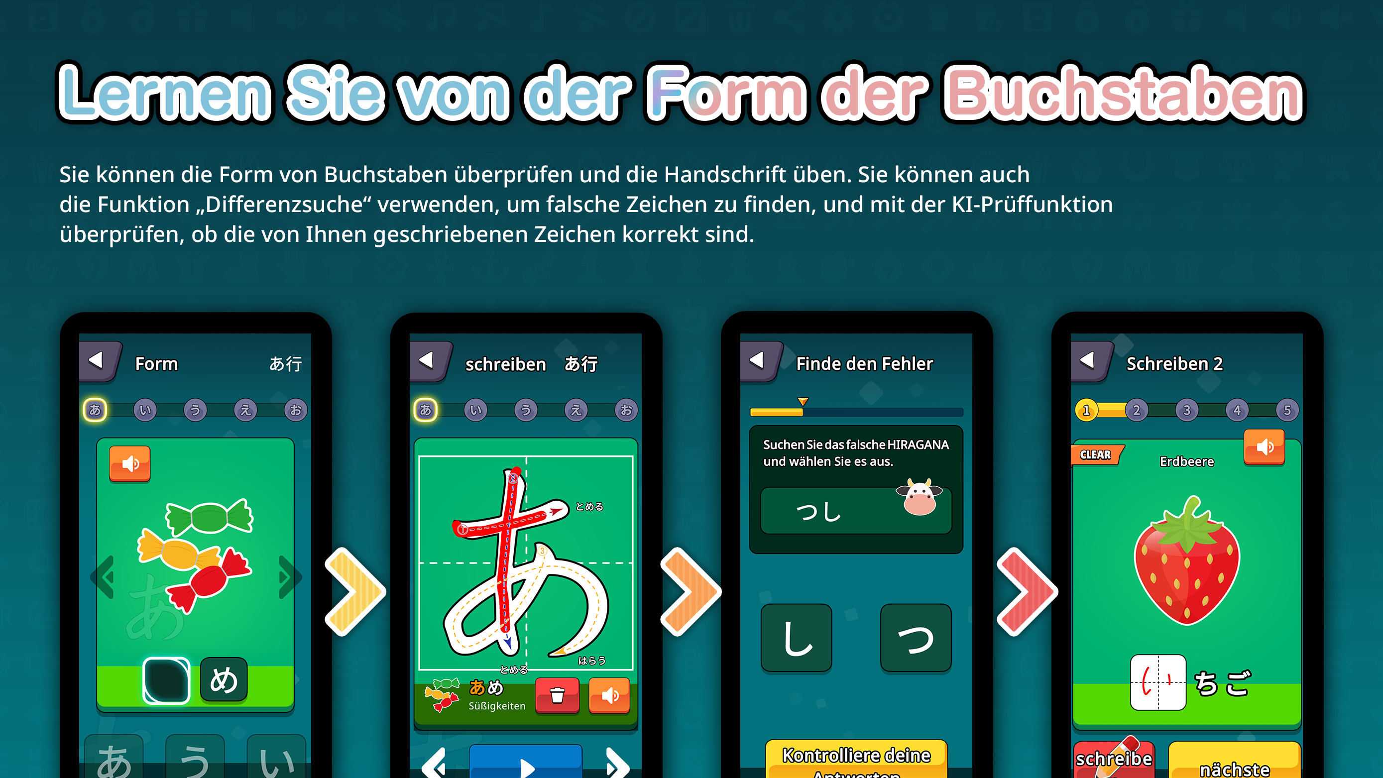 Mit umfangreichen Inhalten wie SHIRITORI, Katakana-Suche und Herausforderungen können Sie Spaß am Lernen haben, ohne sich zu langweilen.
