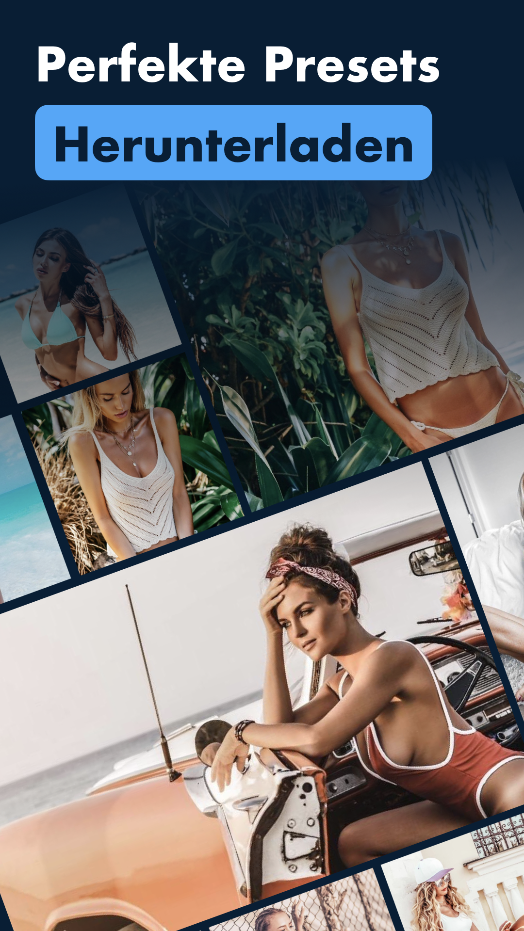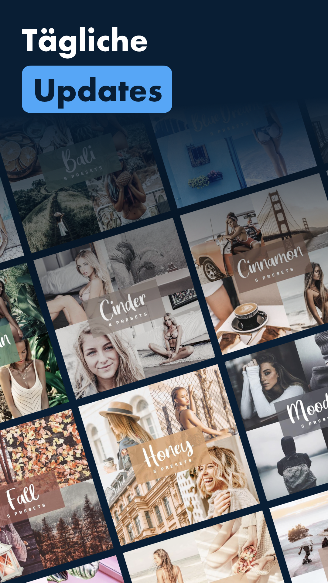 • Mögen sie fotos mit bestimmten farbtönen? Verwenden sie Azure, Bright & Airy, Schwarz & Weiß, Blue Dream, Karamell, Asche, Zimt, Cremig, Mousse, Nude Tones, Pale Rose, Puderpackungen.