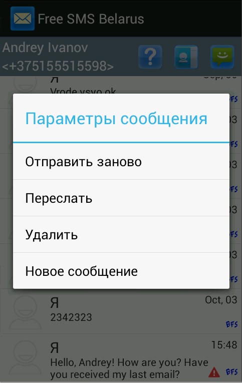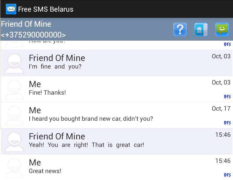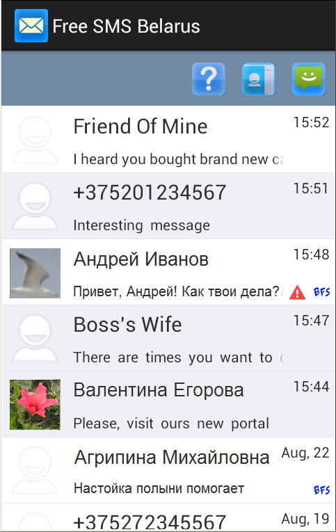 - A full conversation with your partner as regularly (including sent sms by Free SMS Belarus and by default sms application).