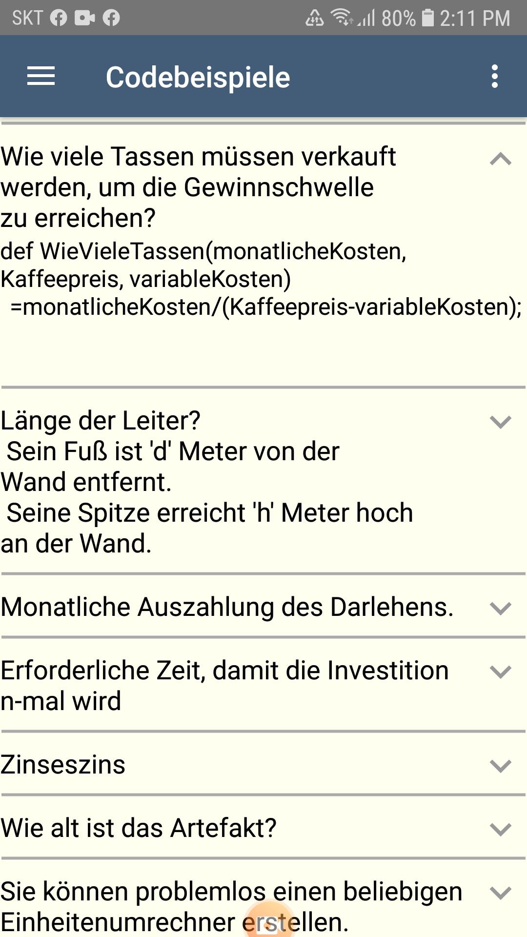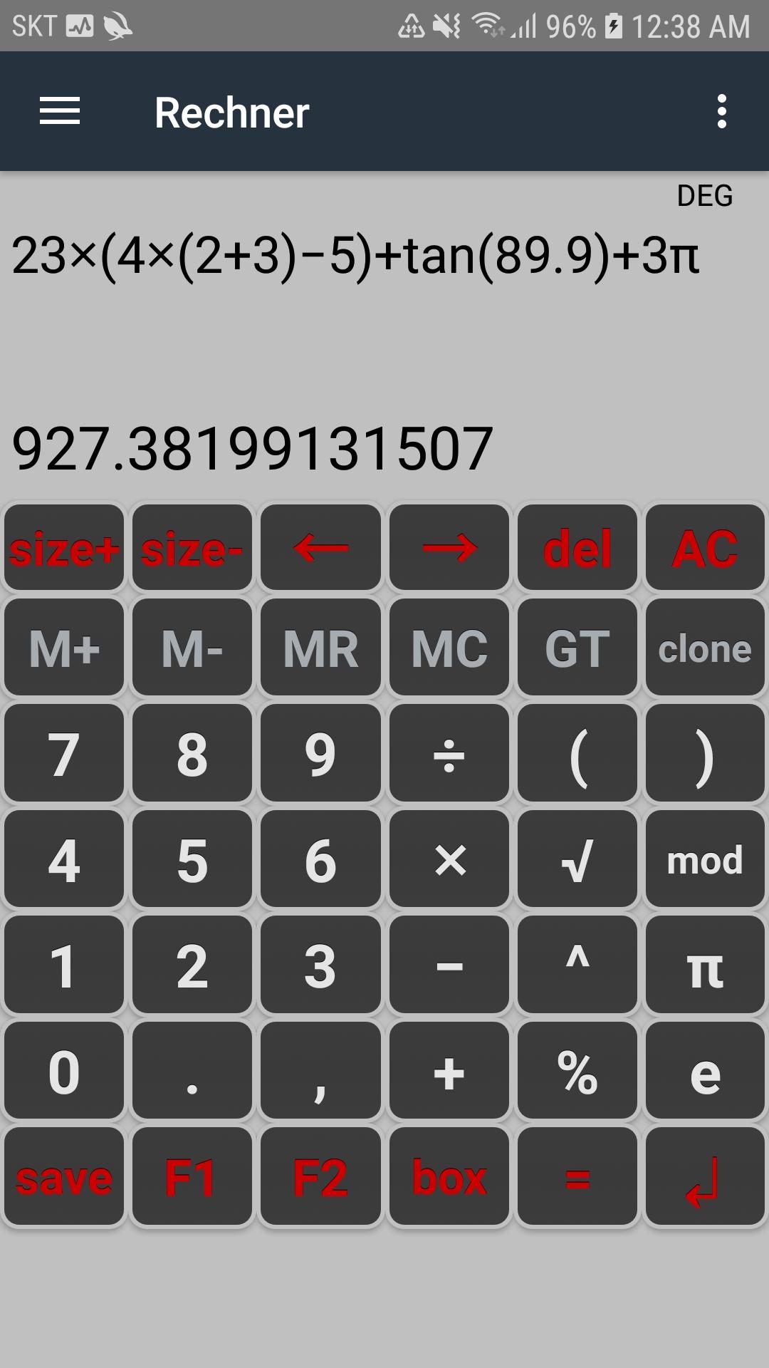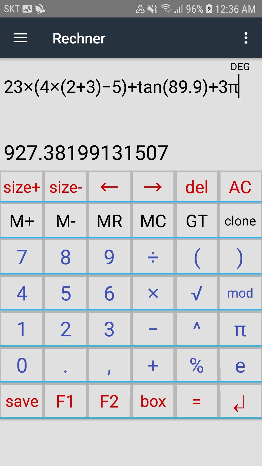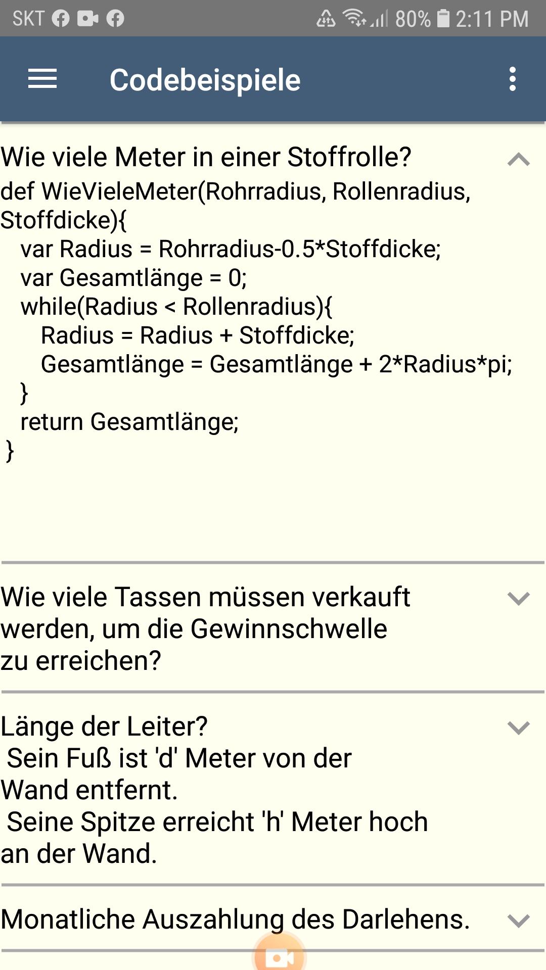 [Allgemeine Taschenrechnerfunktionen] - Unterstützt grundlegende arithmetische Operationen (+, −, ×, ÷) und Klammern - Beinhaltet Potenzrechnung (^), Modulo (), Prozentrechnung (%) und Quadratwurzelberechnung (√) - Unterstützt mathematische Konstanten (π, e) - Enthält technische Funktionen wie sin, cos, tan, log und ln - Taschenrechner-Speicherfunktionen (M+, M-, MR, MC) - Bequeme Gleichungsbearbeitung mit "⌫" und "AC" Tasten - Option zum Aktivieren oder Deaktivieren der Vibration [Programmierfunktionen] - Erstellen Sie benutzerdefinierte mathematische Funktionen (z.B., def summeZwei(zahlEins, zahlZwei) = zahlEins + zahlZwei;) (z.B., def celsiusZuFahrenheit(celsius) = celsius * 9/5 + 32;) - Leistungsstarke rekursive Funktionen (z.B., def fakultaet(n) = n * fakultaet(n-1); fakultaet(0) = 1;) - Komplexe Funktionen mit JavaScript-ähnlicher Syntax - Unterstützt Variablen, if-Anweisungen, for-Schleifen, while-Schleifen und Funktionsdefinitionen (z.B., def fibonacci(n){ if(n<=2){return 1;} return fibonacci(n-1) + fibonacci(n-2); } ) - Erstellen Sie unbegrenzt benutzerdefinierte Funktionen für den Alltag (z.B., def rabattierterPreis(zahlung, rabattSatz) = zahlung * (1 - rabattSatz/100);) - Verwenden Sie Variablen als Einkaufs- oder Preislisten (z.B., var apfel = 500; var birne = 600; var kugelschreiber = 700;) -> (apfel × 3 + birne × 2 = 2700) (z.B., var wechselkurs = 1500;) -> (def usdZuKrw(usd) = usd × wechselkurs;) -> (usdZuKrw(20) = 30.000) - Enthält ein leicht verständliches Coding-Tutorial https://www.blogger.com/blog/post/edit/651122113273196214/983258951231867143
