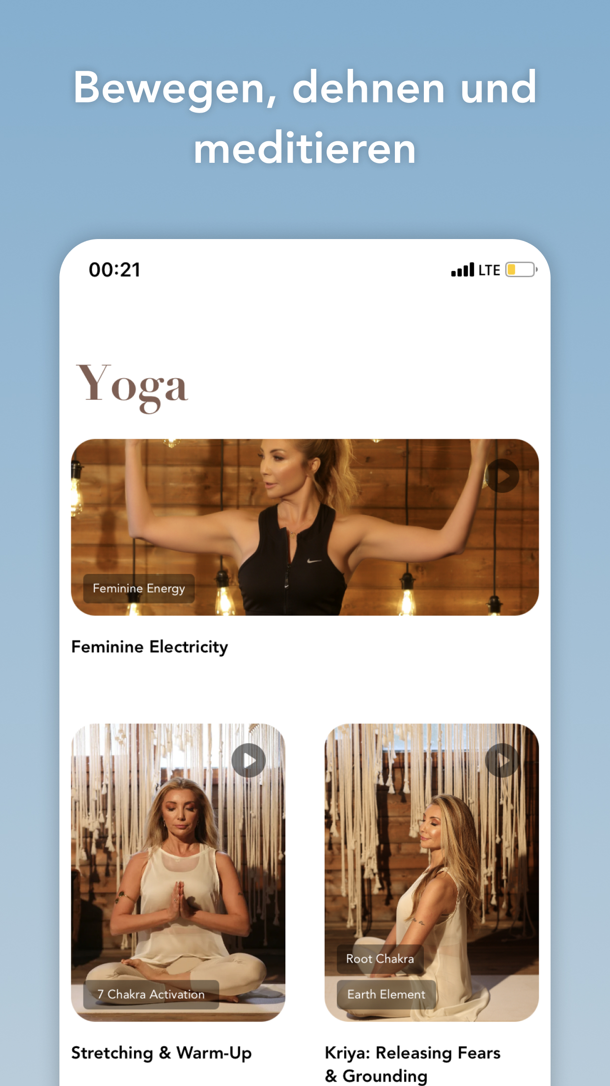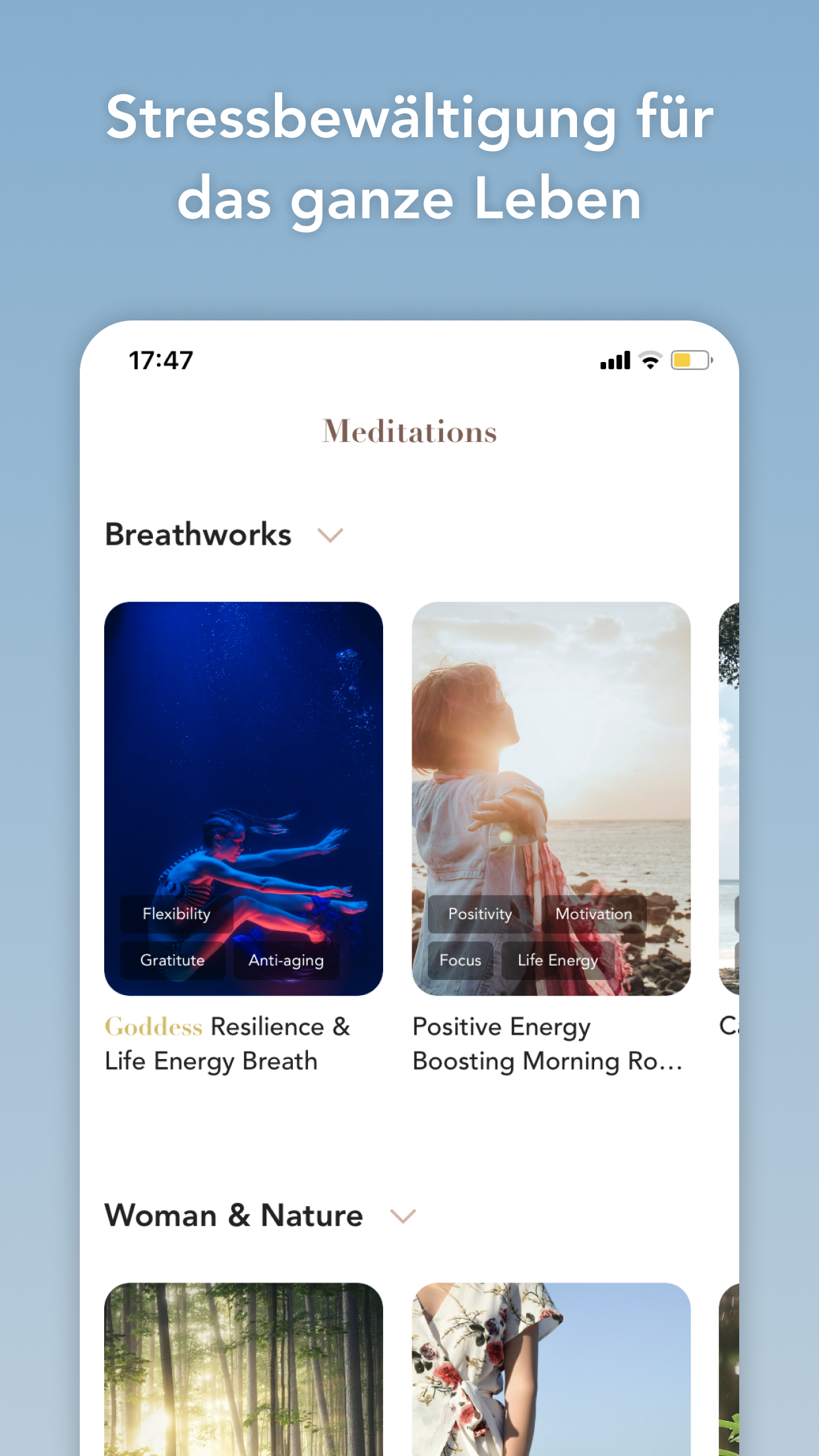 In der App finden Sie mehr als 100 aufgezeichnete Inhalte. Sie reduzieren Stress und Angst durch Atemarbeit und Atemübungen. Schlafen Sie tief, steigern Sie Ihre weibliche Energie und finden Sie Ihre innere Göttin mit geführten Meditationen. Beginnen Sie Ihren Tag mit positiven täglichen Bestätigungen. Holen Sie sich Tipps, um Ihre weiblichen und männlichen Energien und Chakren auszugleichen.