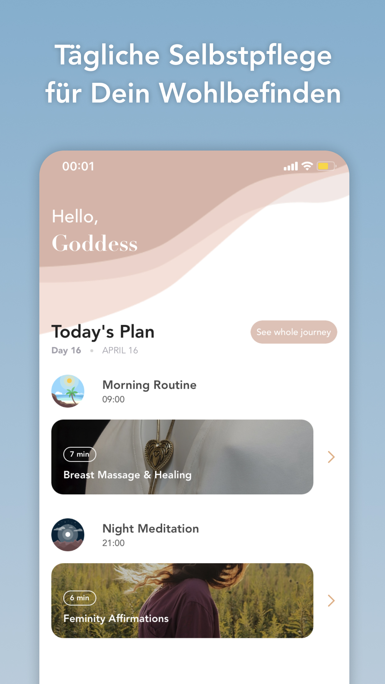 Willkommen in der Goddess App, Ihrem Lebensberater, der die Göttin in sich entfesselt. Erwecke deine weiblichen Energien, verwalte und kontrolliere deine täglichen mentalen und physischen Probleme. Überwinde Stress und Angst. Bauen Sie gute Beziehungen auf.