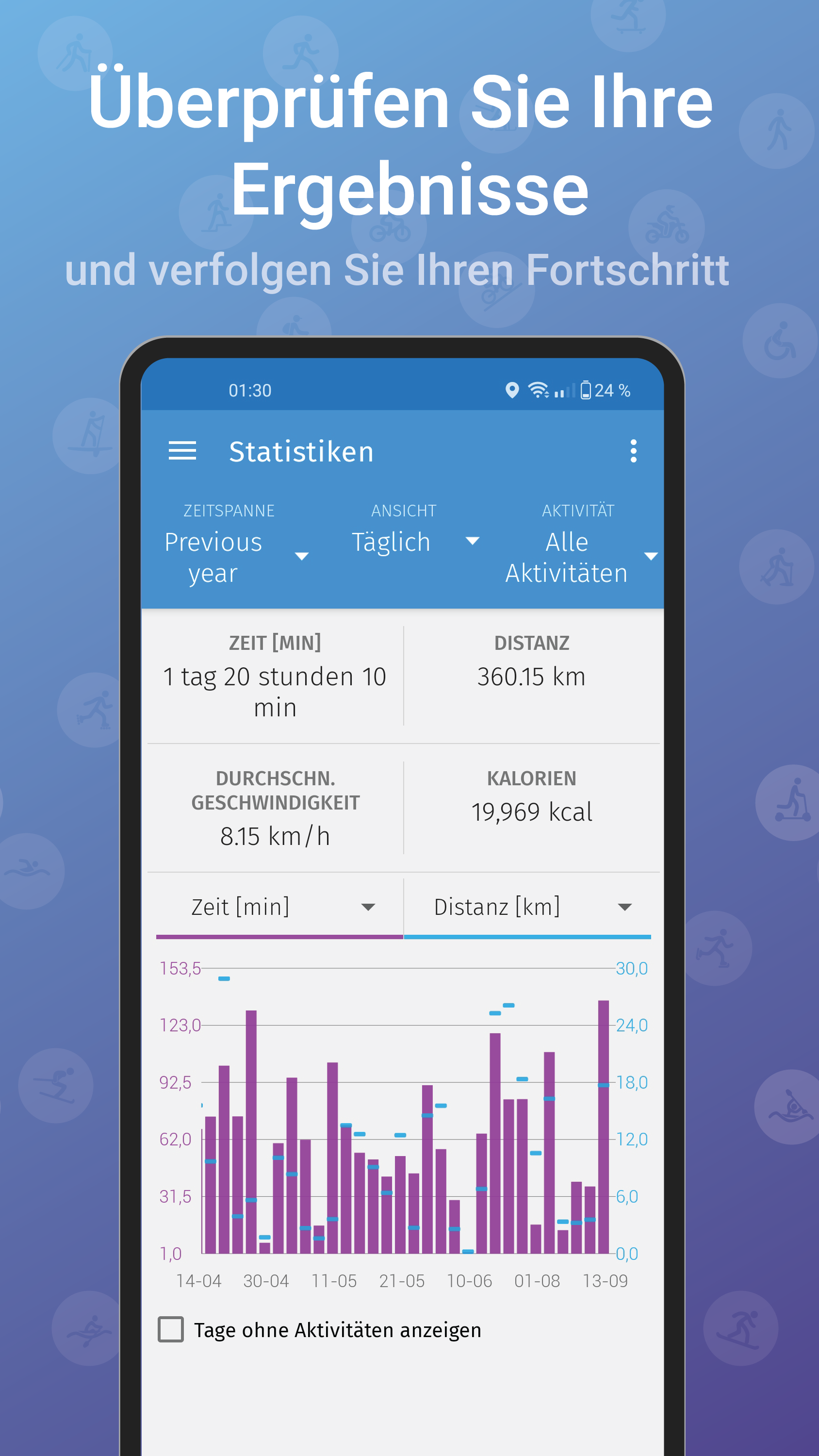 - Statistiken - Überwachen und vergleichen Sie Ihre Ergebnisse in täglichen, wöchentlichen und monatlichen Abständen.