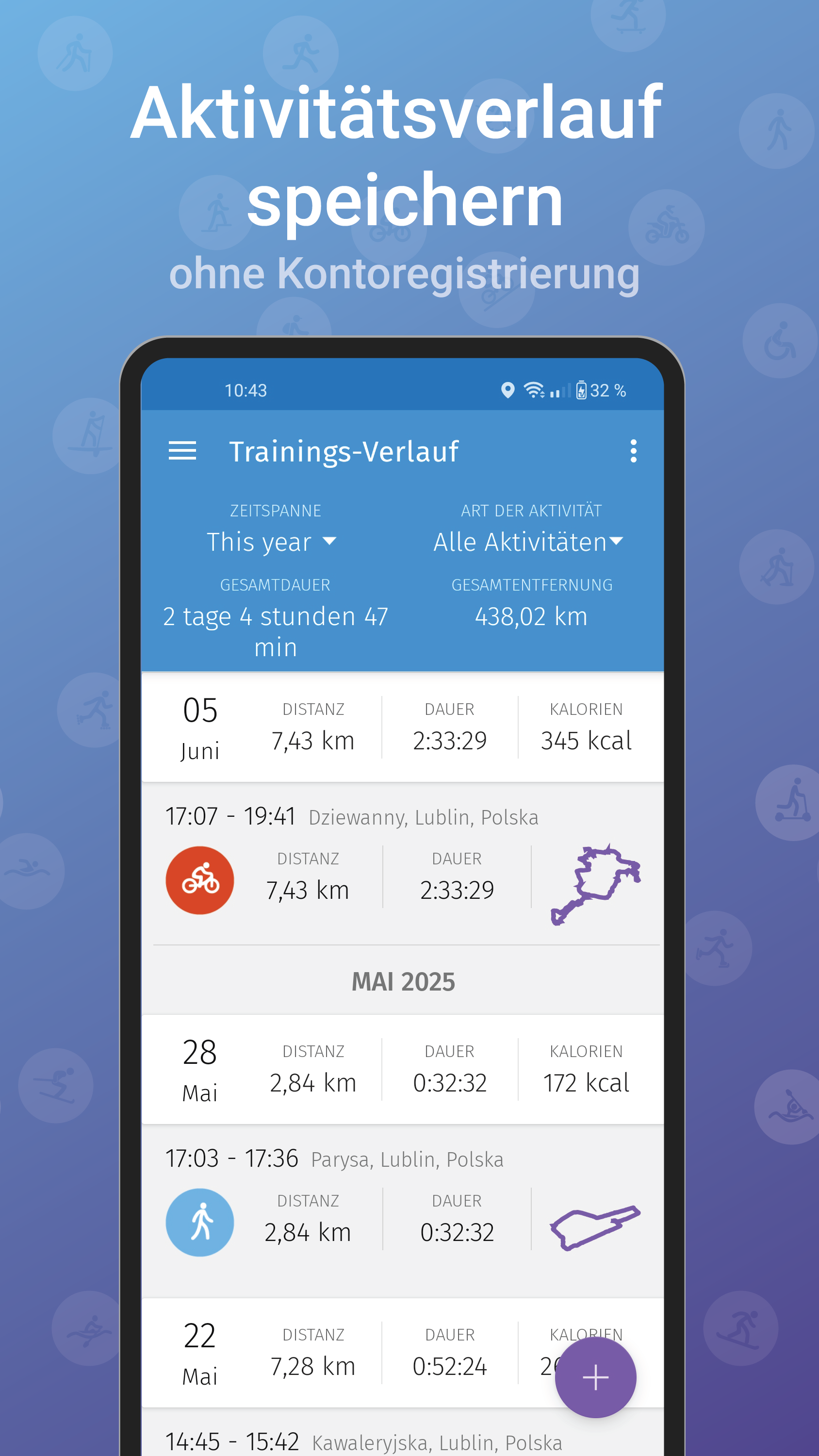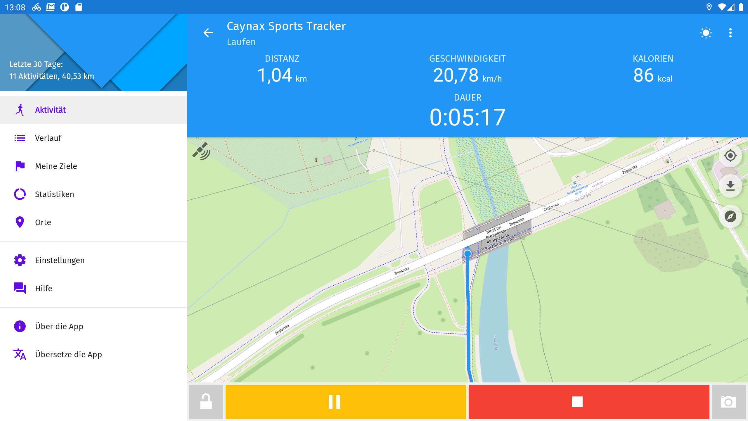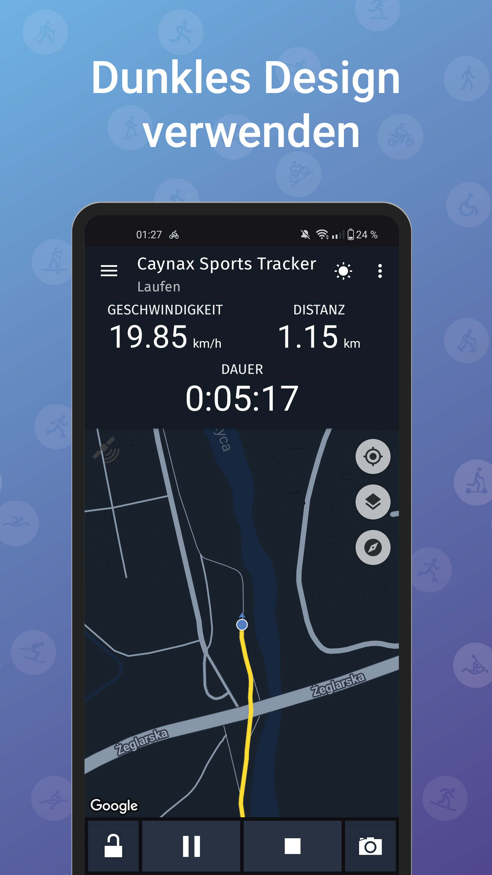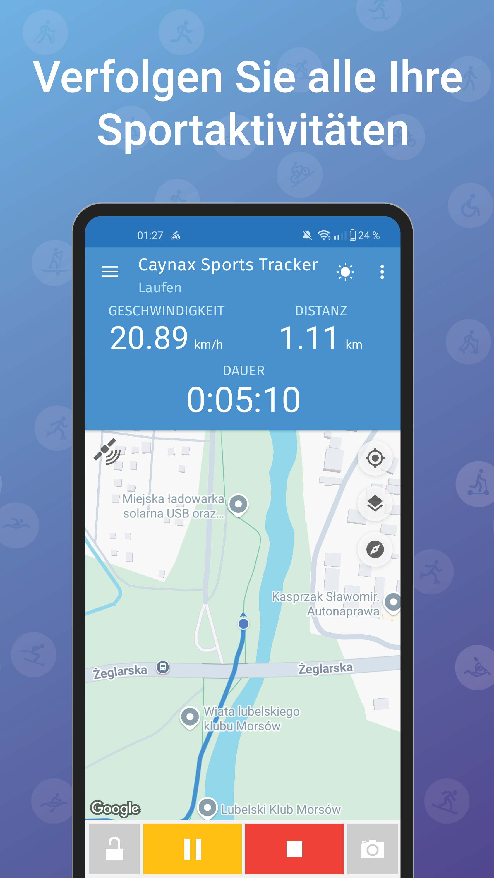 - Live-Karte – Verfolgen Sie Ihren Fortschritt live auf einer Karte (Google Maps oder OpenStreetMap) und zeichnen Sie die Route auf.