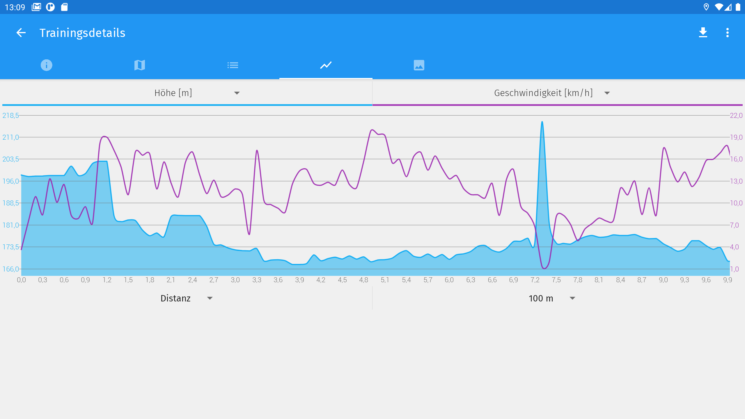 - Mehrere Werte verfolgen - Distanz, Dauer, Geschwindigkeit, Schritte (Schrittzähler), Bewegungszeit, Kalorien, Höhe (Höhenmesser), Tempo, Summe Anstiegshöhenmeter, Summe Höhenmeter, Herzfrequenz, Ortungsgenauigkeit.