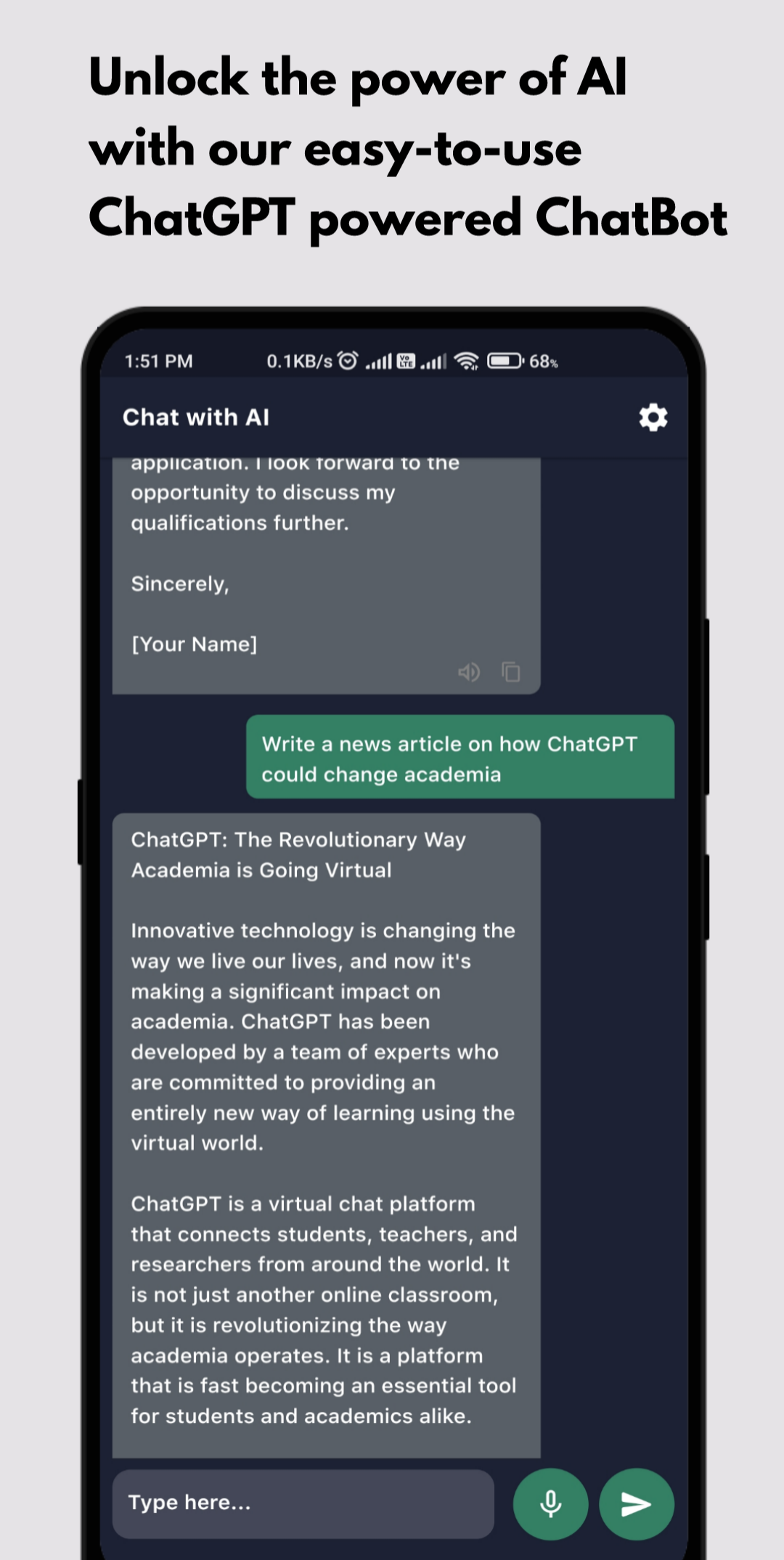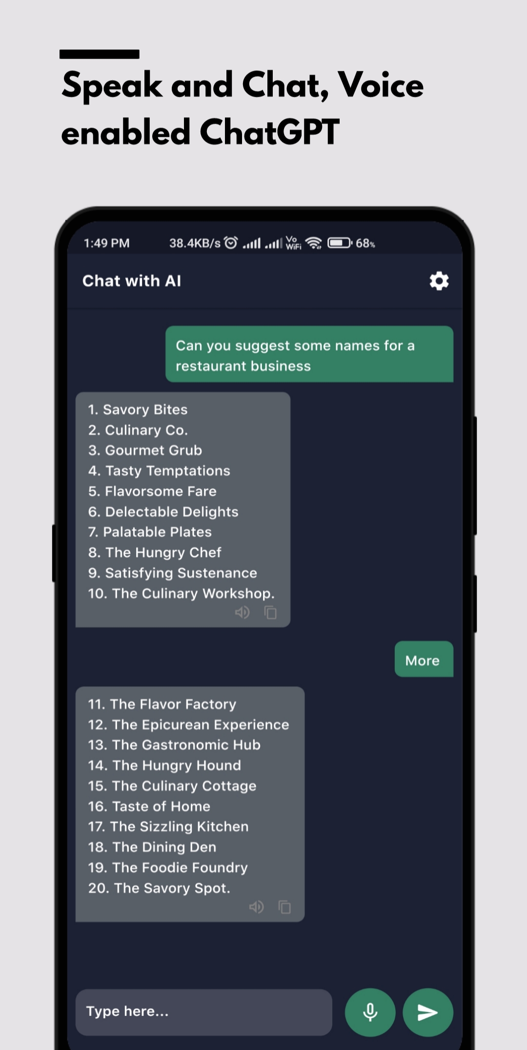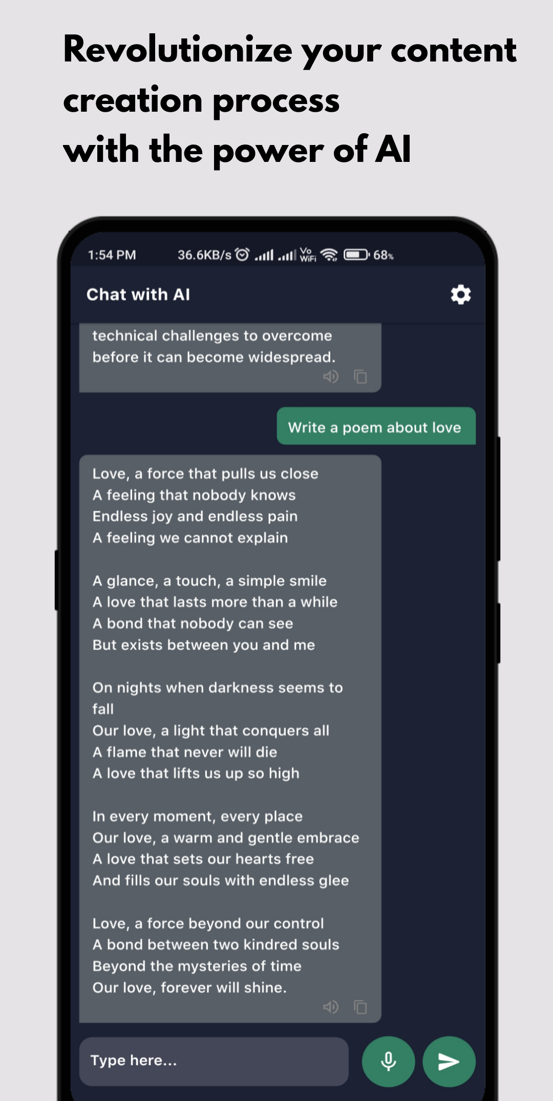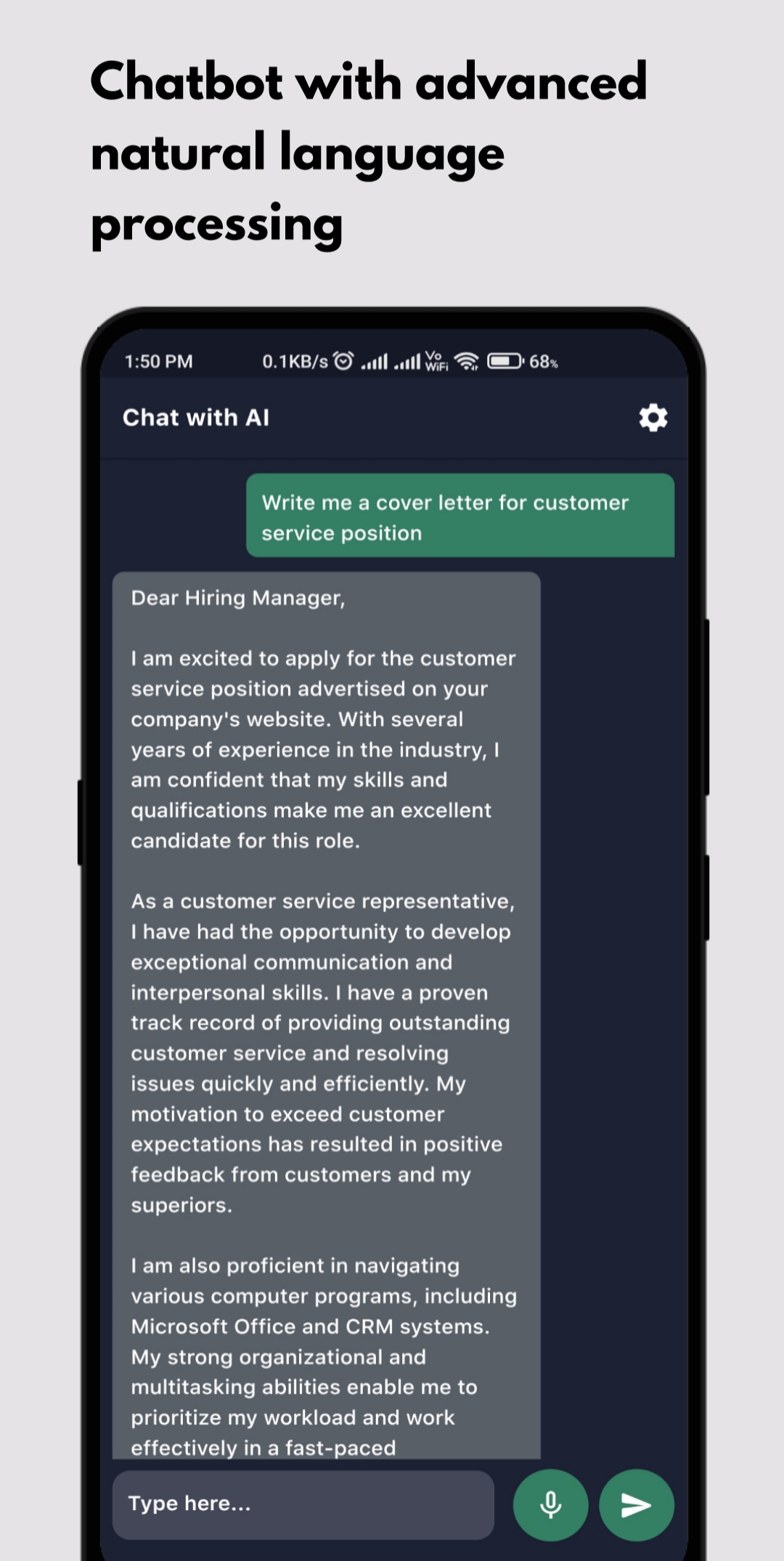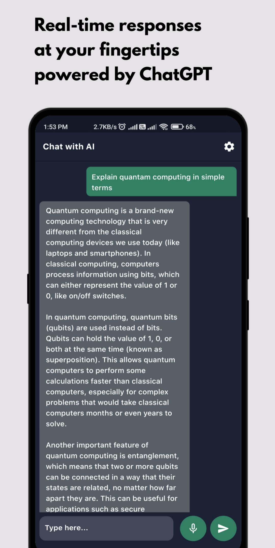 Was Smart Chat AI auszeichnet, sind seine fortschrittlichen Sprachverständnisfunktionen, die auf der ChatGPT-Technologie basieren. Auf diese Weise kann unsere App Ihnen genaue, informative und personalisierte Antworten auf jedes Thema geben, über das Sie chatten möchten. Und während Sie weiterhin mit unserem Chatbot und der Spracheingabefunktion interagieren, lernt und verbessert er sich im Laufe der Zeit und bietet ein noch besseres Gesprächserlebnis.