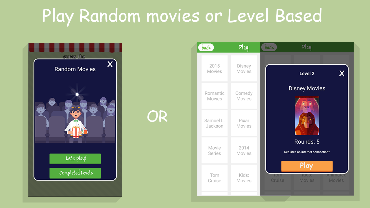 Play category based movies in levels. From Disney's collection, comics to sequel movies! With brand new posters and images.