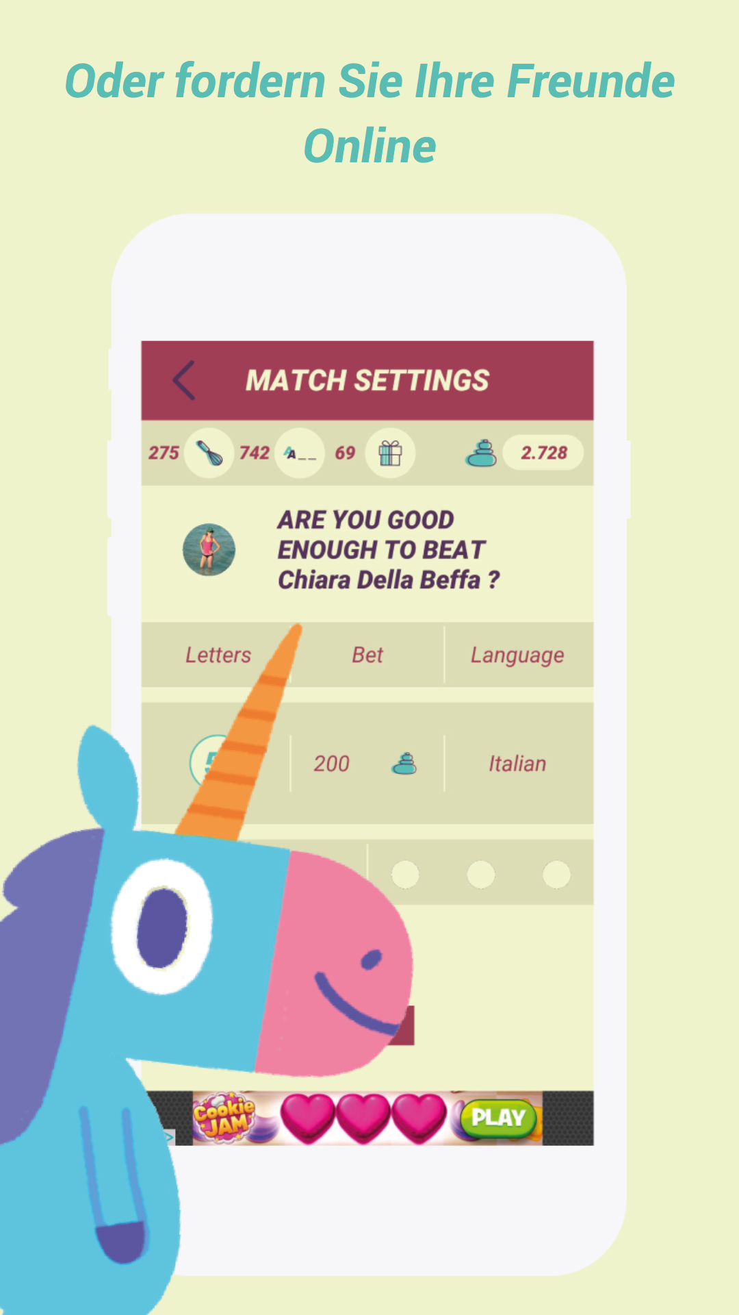 Guess5 ist DAS Wortspiel! Die Spannung, so viele Wörter wie möglich vor Ablauf der Zeit zu erraten, macht so süchtig, dass man gar nicht mehr aufhören mag! Fordere deine Freunde zu Wörterbuch-Wettkämpfen heraus. Möge der Beste gewinnen! Aber sei gewarnt - unsere Challenges sind nichts für schwache Nerven! Was gibt es noch über Guess5 zu sagen? Hier siehst du, was hinter diesen fünf einfachen Erklärzeilen (und 1 Jahr Arbeit) steckt: Algorithmus für künstliche Intelligenz Bei einem Sprachwissensspiel kann man schlecht von „Level“ sprechen. Deshalb haben wir unseren Guess5-Algorithmus für künstliche Intelligenz entwickelt, der unsere Spieler kennenlernt! So kann Guess5 immer schwierige (aber nicht allzu schwierige) Spiele vorschlagen und dir, deiner Familie und deinen Freunden dabei helfen, eure Sprachkenntnisse zu verbessern. Soundtrack Da Sprache gesprochen wird, was würde da mehr Sinn machen als die menschliche Stimme? Das haben wir uns auch gedacht und einen gesamten Soundtrack nur aus Stimme entwickelt! Ja, du hast richtig gelesen. Alles was du bei Guess5 hörst, von der Begleitmusik während des Spiels bis hin zu jedem einzelnen Soundeffekt, wurde nur mit Stimme und Mikro aufgenommen. Keine Synthesizer, keine Tools. Nur die reine menschliche Stimme! Mehrspieler Gibt es etwas Besseres als deine Freunde herauszufordern und ihnen ihre Steine abzuluchsen? (Weisheitssteine sind die offizielle Währung bei Guess5!) Für die Mehrspieler-Option von Guess5 gibt es Einsätze wie beim Poker. Wer mitspielen will, muss seinen Einsatz machen. Und am Ende kriegt der Gewinner alles! Bei Guess5 kannst du all deine Social-Media-Freunde herausfordern! Aber halt... was wenn sie das Spiel noch gar nicht installiert haben? Kein Problem! Du kannst sie jederzeit einladen, mit einem einzigen Klick! Teamwork Wir haben uns bei der Entwicklung von Guess5 mächtig ins Zeug gelegt. Und versucht, nichts dem Zufall zu überlassen. Bei Guess5 wurde jede Animation, die du entdeckst (man sieht nicht gleich alle auf einmal!), in Mauro Gattis Animations- & Designstudio kreiert. Jedes Mal, wenn du ein Wort findest, kannst du die Definition suchen und die Bedeutung des Wortes kennenlernen! Wie oft ist es dir schon passiert, dass du ein Wortspiel gespielt hast und keine Ahnung hattest, was das Wort eigentlich bedeutet (bzw. dass es überhaupt existiert)! Das war einmal! Wir arbeiten mit dem besten Wörterbuch-Hersteller der Welt zusammen: der Oxford-Universität. Jede Definition bei Guess5 stammt aus ihren Wörterbüchern! Unser Original-Soundtrack wurde im Preludio Records Studio aufgenommen und von der berühmten Gesangsgruppe Quattrottave eingesungen. ****ACHTUNG**** Zur Feier des neuen Guess5-Spieles sind alle Spielmodi für kurze Zeit aktiv und freigeschaltet! Diese tolle Gelegenheit darfst du nicht verpassen! Folge uns auf: Facebook: https://www.facebook.com/guess5game Twitter: https://twitter.com/guess5game Website: http://www.guess5.it