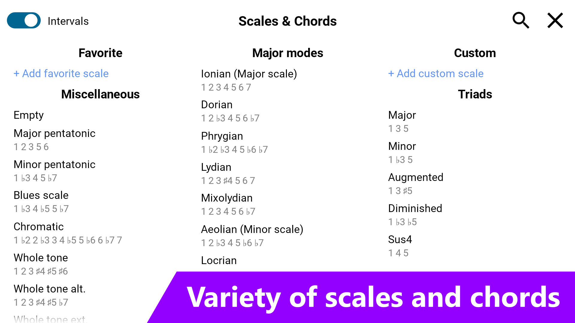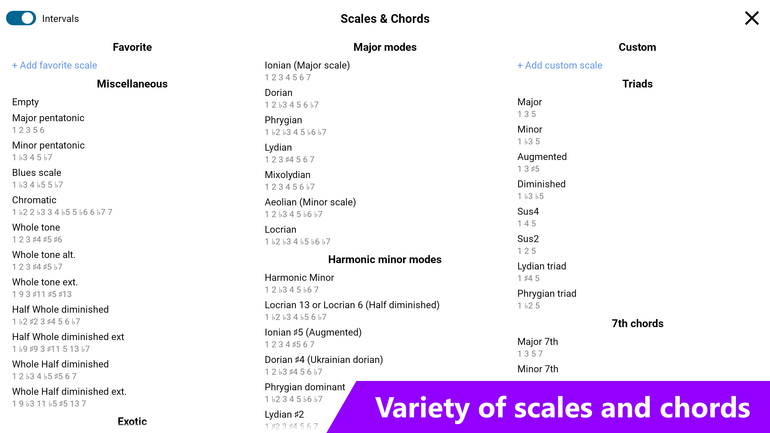 - Über 45 Skalen (Dur-Tonleitermodi, harmonische Moll-Tonleitermodi, melodische Moll-Tonleitermodi, Dur-/Moll-Pentatonik, exotische Tonleitern, Bebop-Tonleitern) und über 35 Akkorde