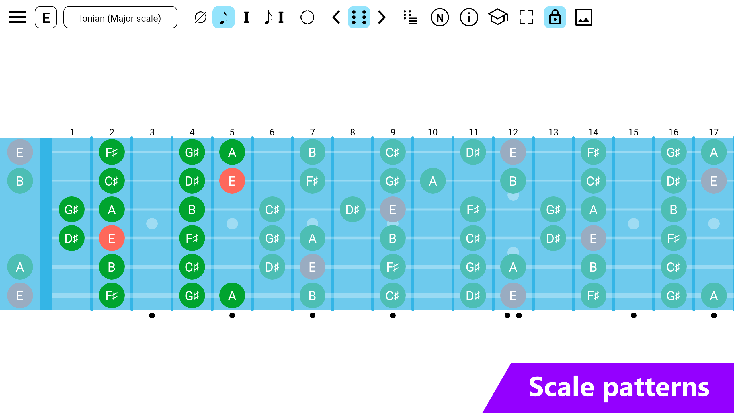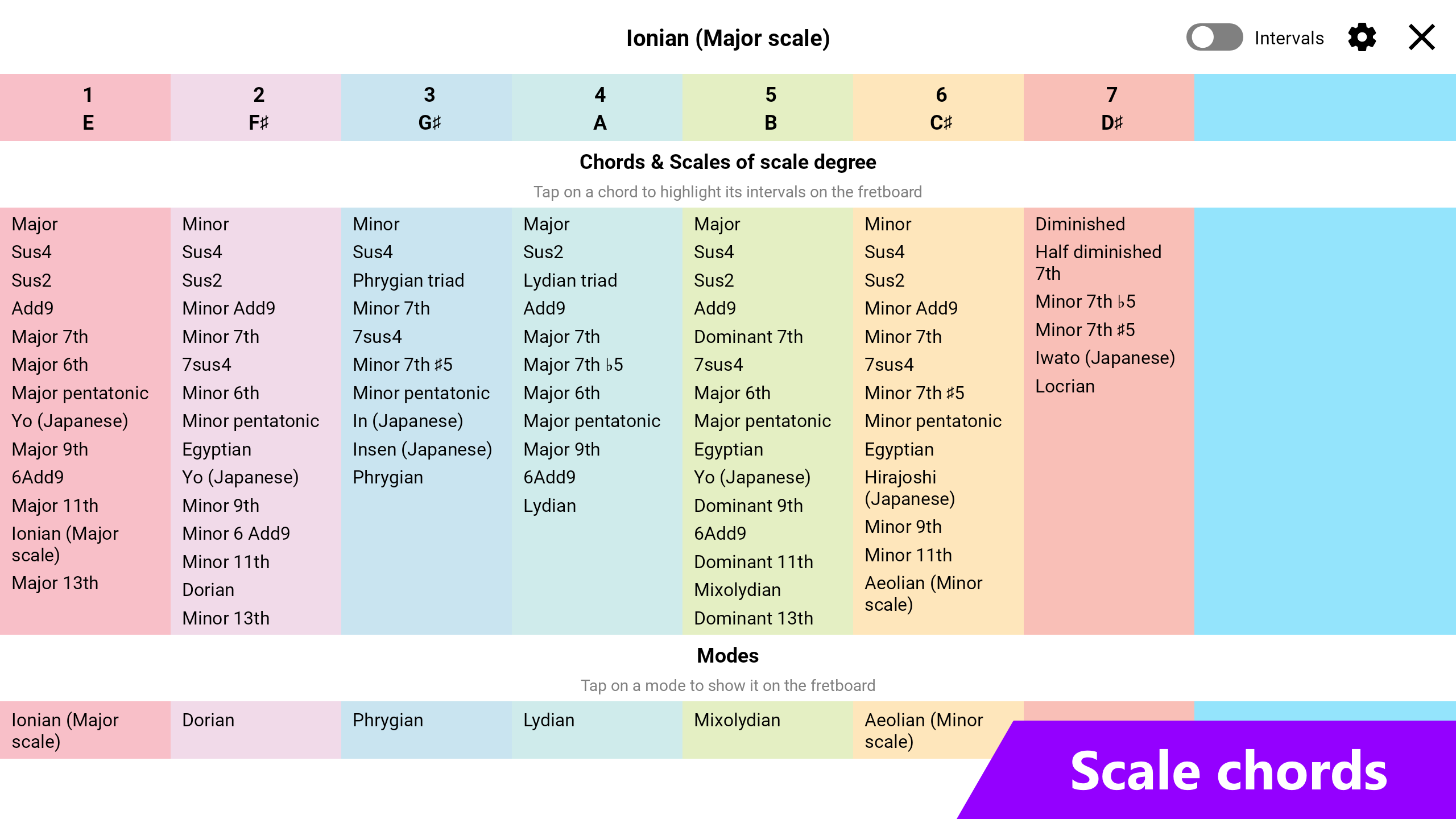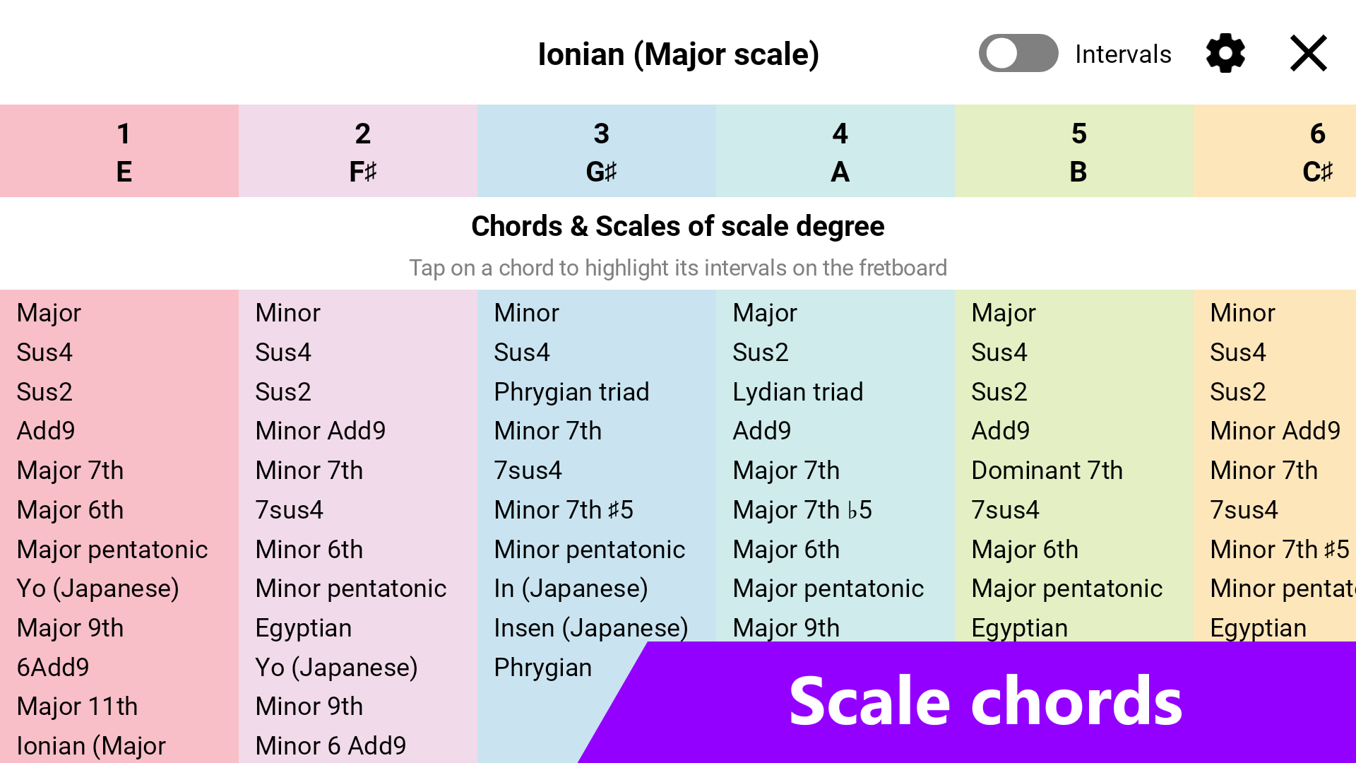 Die App ist mehr auf das Erlernen von Tonleitern als auf das Erlernen von Akkorden ausgerichtet, es sind jedoch auch Akkorde vorhanden und verfügen über Akkordformen für Hauptakkorde für 6/7-saitige Gitarre, 4/5-saitiger Bass und Ukulele.