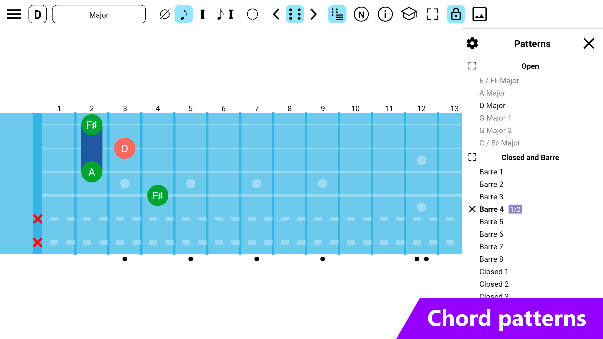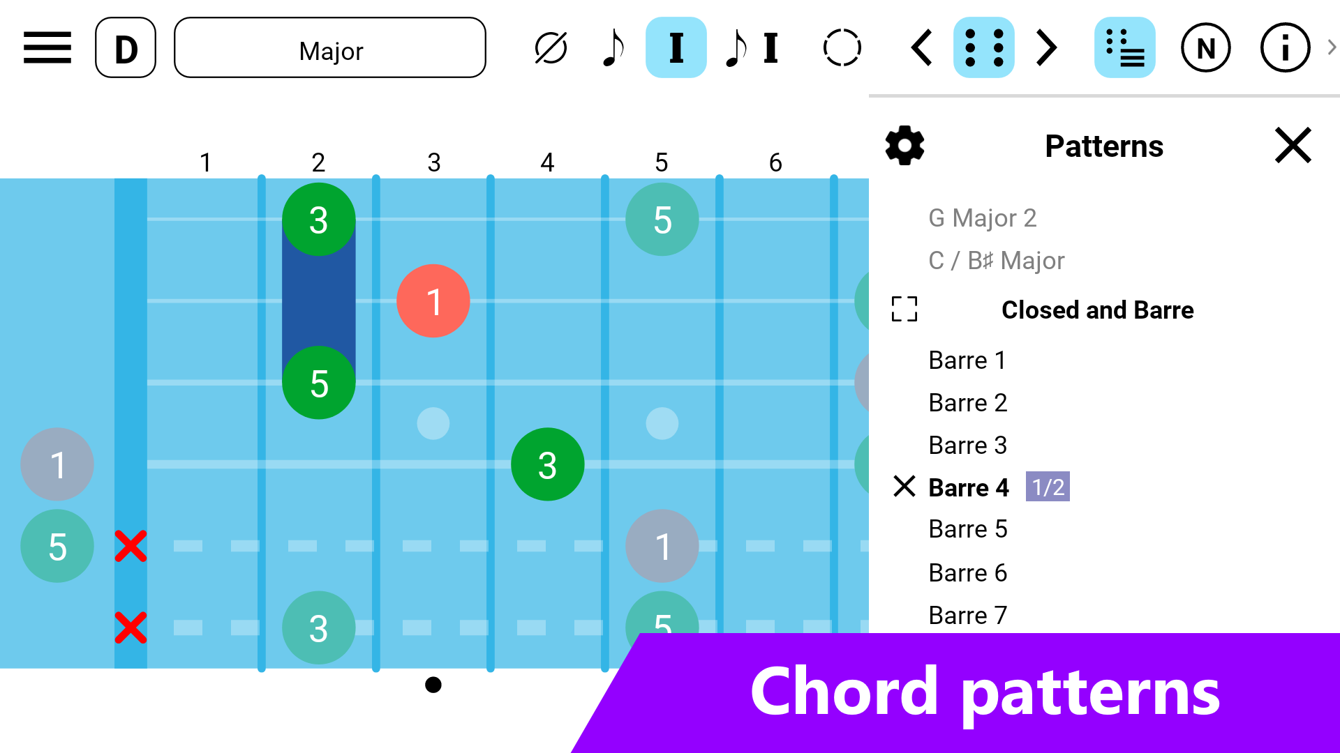 - Über 1600 Muster für Tonleitern (CAGED, 3 Noten pro Saite) und Formen für Akkorde (Dreiklänge, Barre, Offen, Geschlossen)