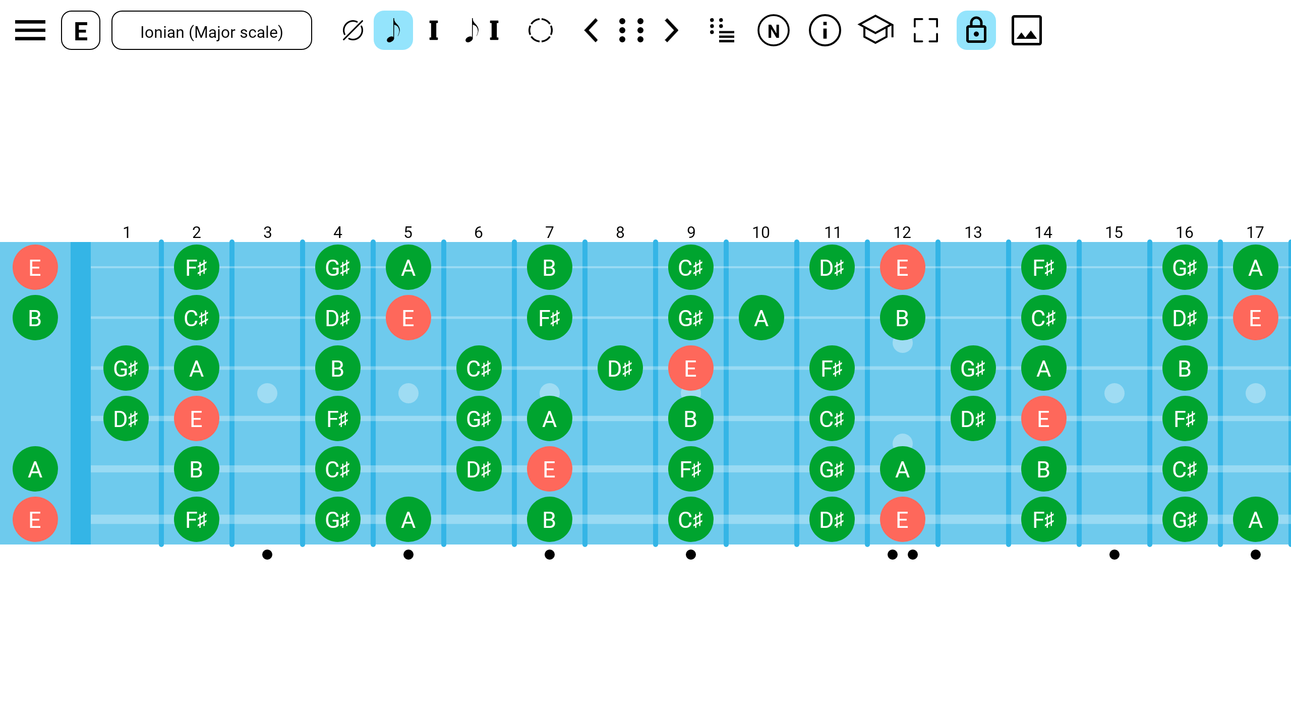 Die Gitarren-Griffbrett-App soll Ihnen dabei helfen, Tonleitern zu lernen, sich das Griffbrett einzuprägen und Ihr Gehör zu trainieren. Ermöglicht die individuelle Anpassung aller Aspekte der Anzeige einer Tonleiter oder der Noten/Intervalle eines Akkords auf einem Gitarrengriffbrett. Zeigt außerdem die Akkorde und Modi jeder Tonleiterstufe an und bietet die Möglichkeit, einen Akkord auf einer Tonleiter hervorzuheben.