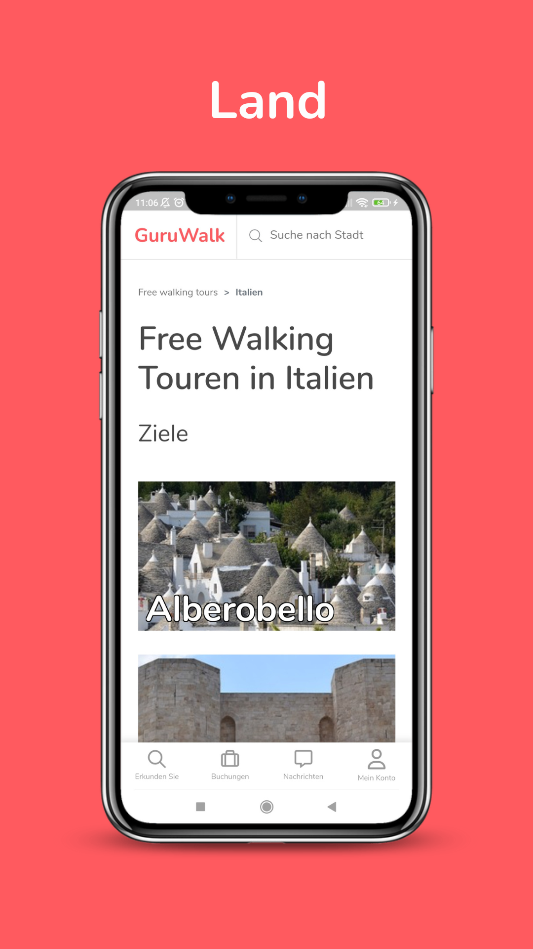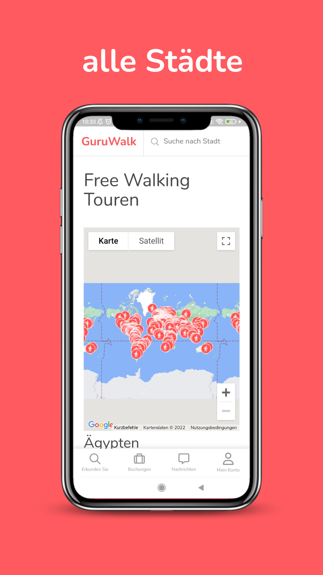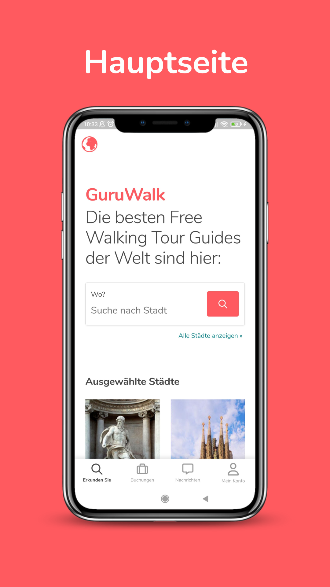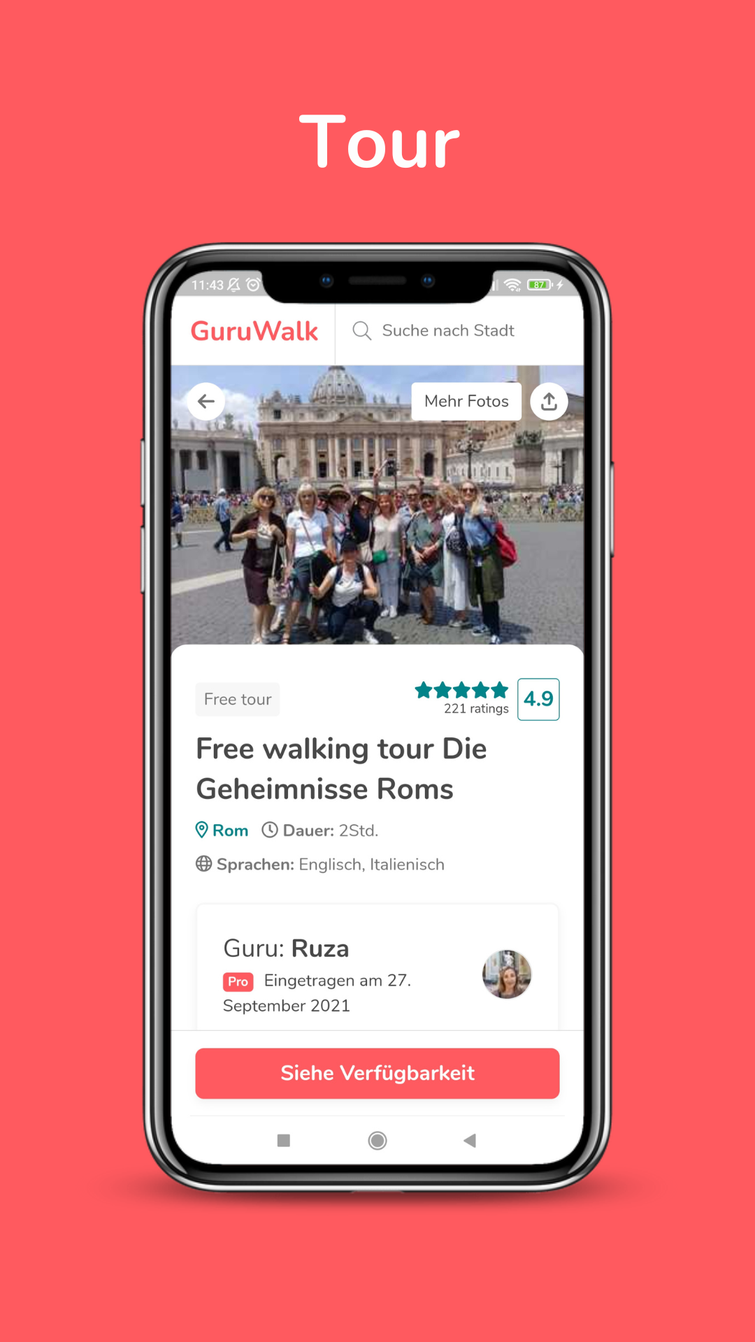 Hier finden Sie über 2300 Free Walking Tours auf Deutsch, Englisch, Italienisch, Spanisch und anderen Sprachen in mehr als 800 Städten auf der ganzen Welt. Lernen Sie durch unsere Free Walking Tours die Kultur, die Kuriositäten und den Lebensstil von Ihrem Ziel kennen. Die Tours werden von professionellen und einheimischen Reiseführern geleitet, die den Reisenden gerne die Kultur ihrer Heimat näher zu bringen. Man kann kostenlos unsere Free Walking Tours auf der App reservieren. Informationen die man auf GuruWalk finden kann Für jede Free Walking Tour kann man die folgenden Informationen finden: - Verfügbare Sprachen. - Startrzeiten, - thematische Suchfilter - Sehenswürdigkeite - Bewertungen und Kommentare von anderen GuruWalk-Benutzern (Wanderern). - Beschreibung des Reiseführers (Guru). - Treffpunkt des Tours Der Guru kann sich auch mit Ihnen in Verbindung setzen, um Sie über eventuelle Änderungen der Tour zu informieren. Zweck und Konzept von GuruWalk Das Ziel von GuruWalk ist es, das Bewusstsein für diese Alternative zu kostenpflichtigen Touren zu schärfen, indem es Reiseleiter (Gurus) und Touristen zusammenbringt und so die lokale Entwicklung und den nachhaltigen Tourismus fördert. Verbesserung oder Angleichung der Qualität herkömmlicher kostenpflichtigen Tours durch das Konzept von "Free walking tour", bei der jeder Tourist den Reiseleiter gemäß seiner Erfahrung bezahlt. GuruWalk Gemeinschaft Treten Sie der Gemeinschaft der Wanderer bei und teilen Sie Ihre Erfahrungen mit den verschiedenen Touren, die Sie unternommen haben. So können Sie anderen Wanderern helfen und den Guru empfehlen, mit dem Sie Ihre Reise noch mehr genießen konnten. Bei GuruWalk liegt uns Ihre Meinung am Herzen, denn wir möchten Sie mit den besten Gurus (Führern) der Stadt in Verbindung bringen. Deshalb haben wir einen Support-Service eingerichtet, bei dem Sie Ihre Zweifel und Vorschläge einreichen können. Finden Sie Ihren Guide in Echtzeit Unsere App verwendet die Funktionalität von Vordergrunddiensten, damit Guides und Reisende ihre Position sicher und effizient in Echtzeit teilen können. Dies ermöglicht: Echtzeit-Standort: Anzeige der Positionen des Reisenden und des Guides auf einer Karte während der Bewegung, um sicherzustellen, dass sie sich leicht finden können. Nahtlose Erfahrung: Die Funktionalität bleibt auch dann aktiv, wenn die App im Hintergrund läuft, um Unterbrechungen während der Tour zu vermeiden. Der Standort wird nur während der aktiven Tour und stets mit der ausdrücklichen Zustimmung des Nutzers geteilt. Diese Funktion ist entscheidend, um ein sicheres und bequemes Erlebnis zu bieten.