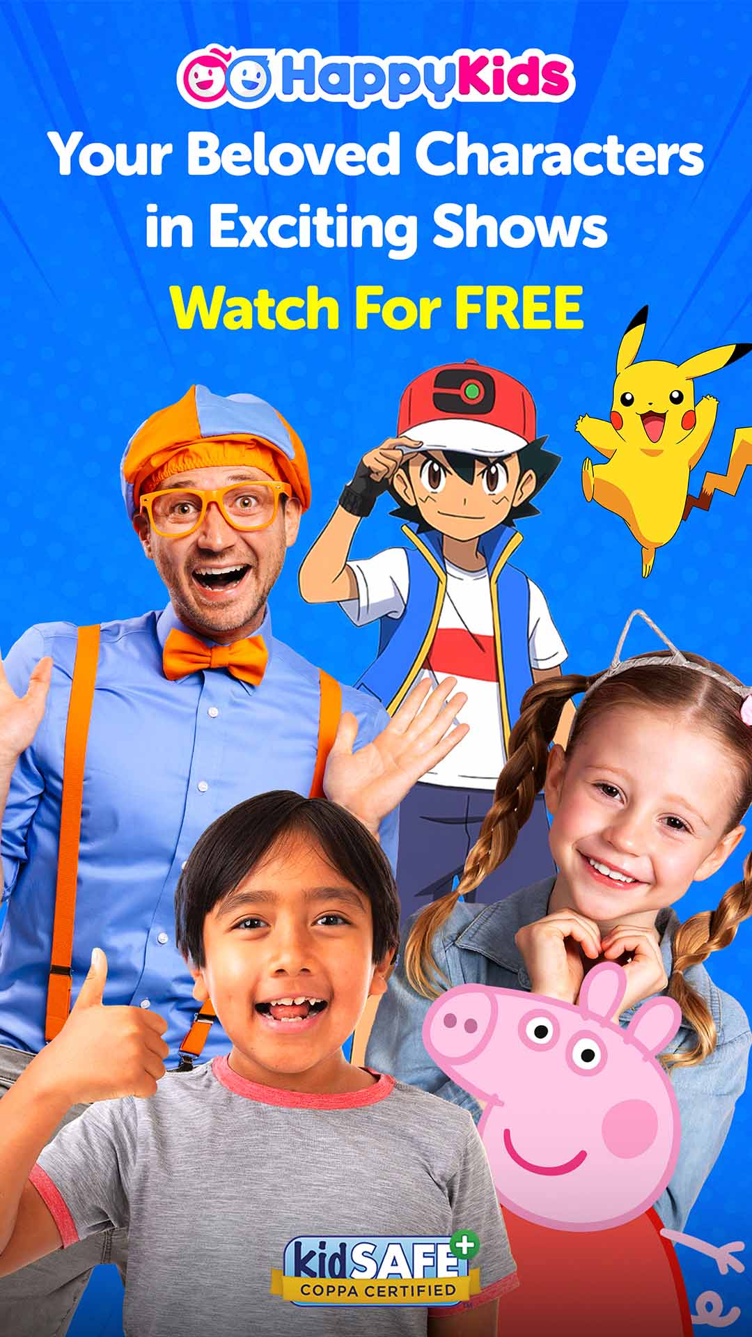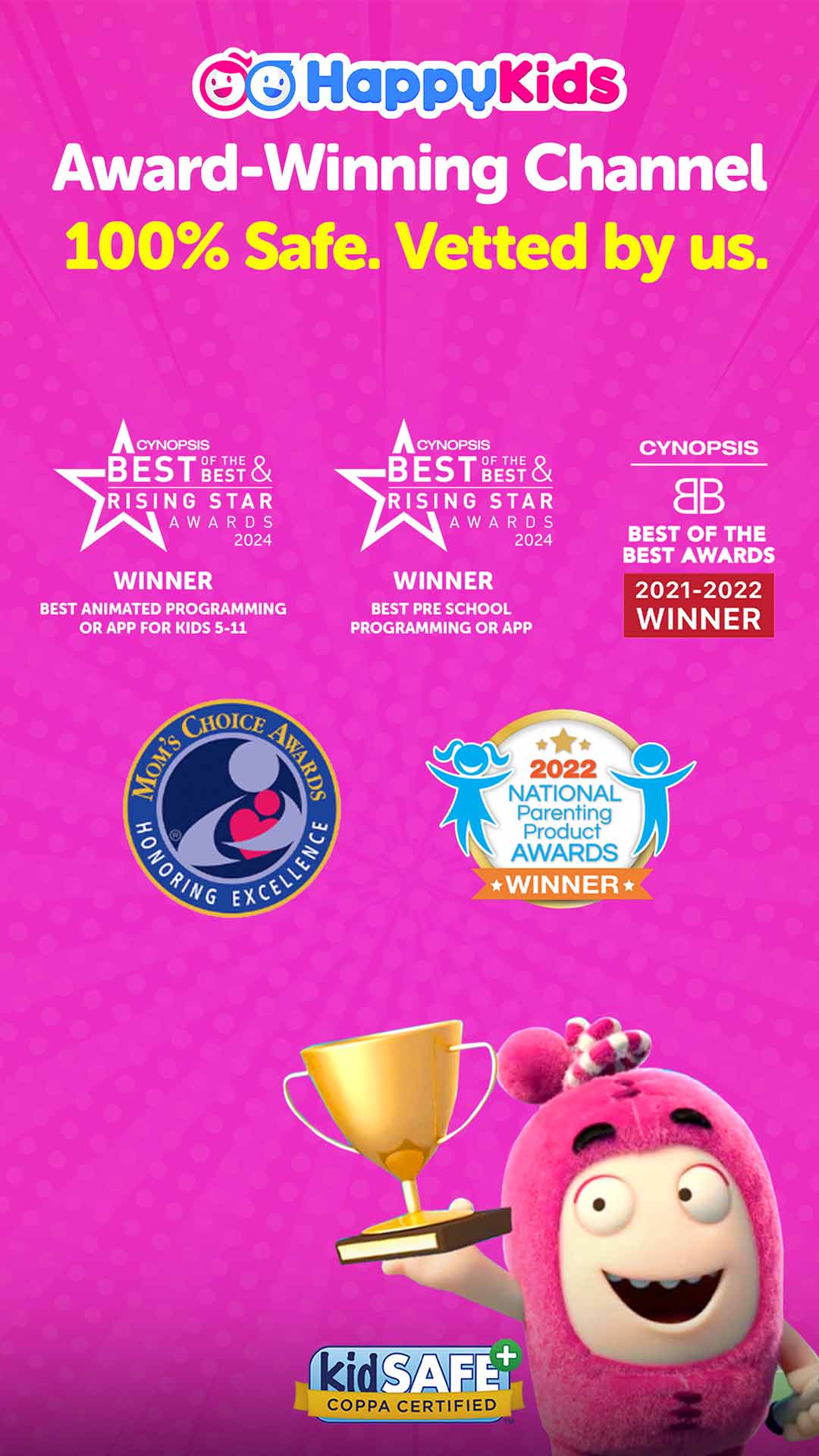 "Join over 16 million parents who trust HappyKids for safe, free streaming for kids of all ages! Explore 100,000+ family-friendly videos, featuring movies, cartoons, vlogs, gaming, and educational shows all 100% FREE.
