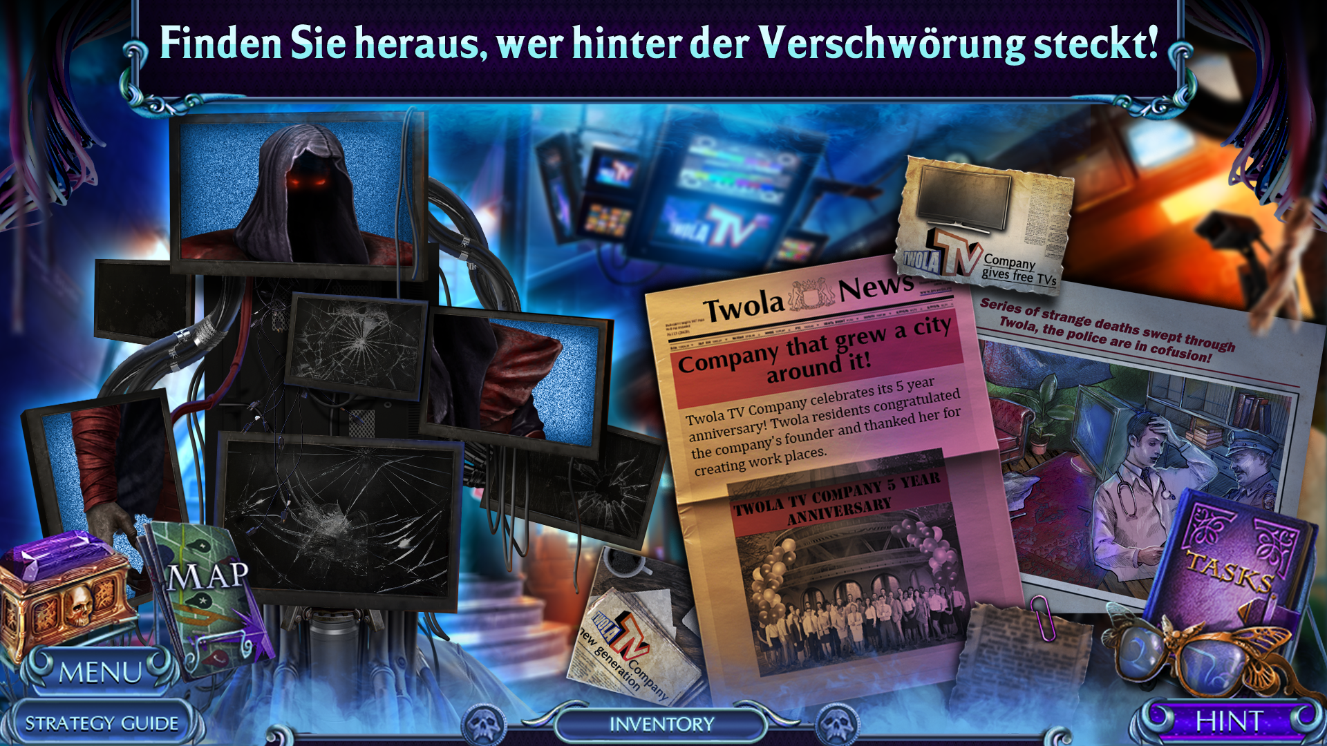 Twola war eine sterbende Kleinstadt, bis eine Fernsehgesellschaft kam und ihr neuen wirtschaftlichen Aufschwung brachte in diese Wimmelbild Spiele. Zu ihrem 10-jährigen Jubiläum verschenkt die Firma Twola TV nun Gratisfernseher an alle Bewohner. Aber als Leute vor dem Fernseher sterben, beginnen ein paar neugierige Wissenschaftler, Fragen zu stellen. Schließe Dich in diesem aufregenden Spiele Deiner Freundin Natalie an, um diesen seltsamen Fall zu lösen und Suchspiele finde Gegenstände, bevor Twola zu einer echten Geisterstadt wird!