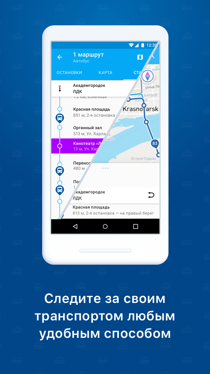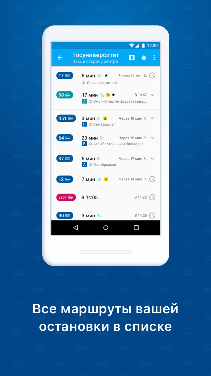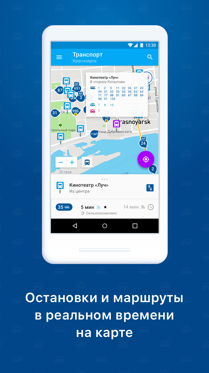 — отобразит онлайн городской транспорт, маршруты которого проходят остановку, и покажет точное время прибытия вашего автобуса;