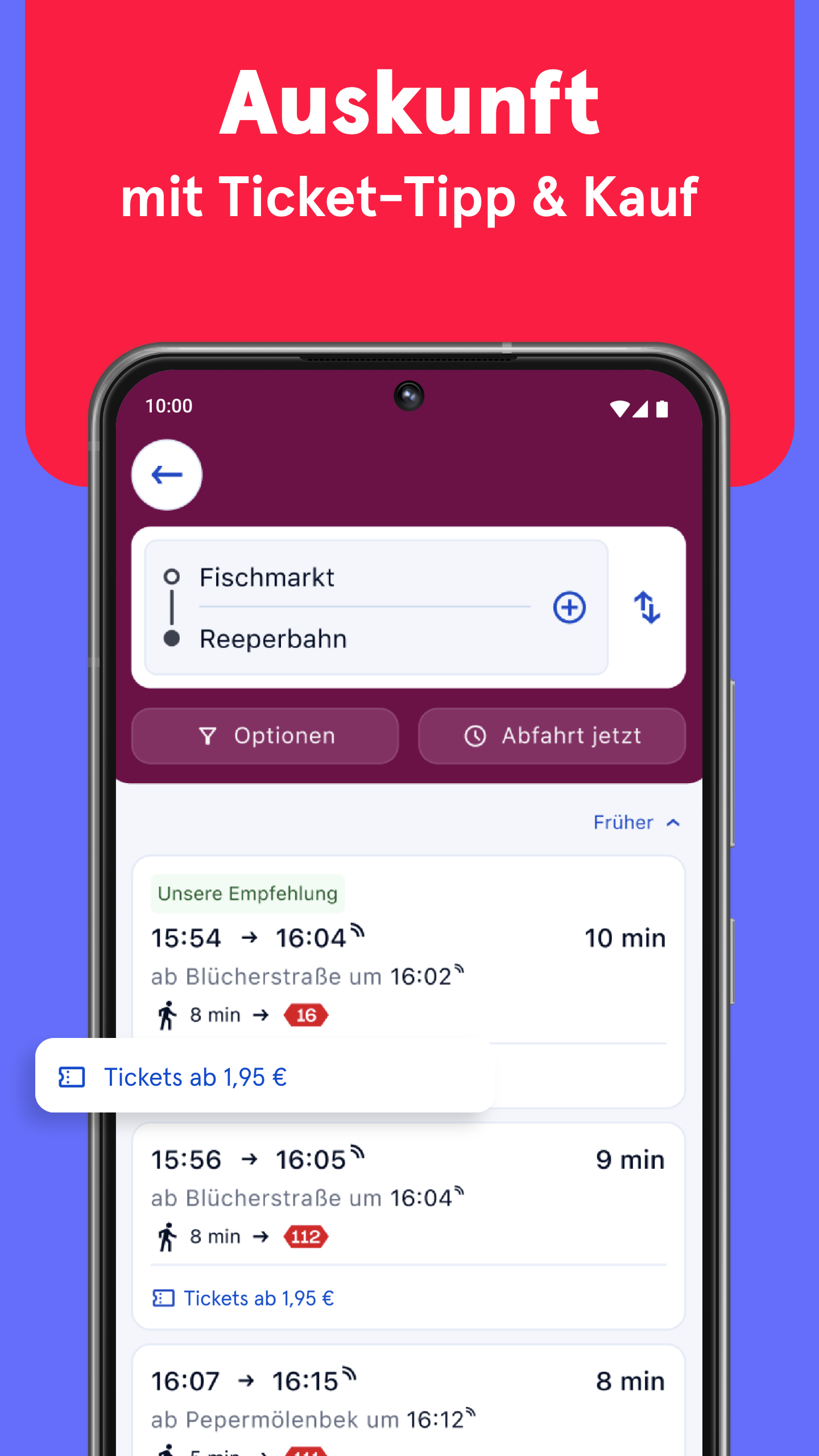 hvv switch (Paketname: de.hochbahn.hvvswitch) wird von Hamburger HOCHBAHN AG entwickelt und die neueste Version von hvv switch: ÖPNV & Sharing 2.1.0 wurde am 28. November 2025 aktualisiert. hvv switch: ÖPNV & Sharing liegt in der Kategorie von Reisen & Lokales. Sie können alle Apps von dem Entwickler der hvv switch: ÖPNV & Sharing durchsuchen und 113 alternative Apps zu hvv switch: ÖPNV & Sharing auf Android finden. Derzeit ist diese APP kostenlos. Diese App kann auf Android 10.0+ auf APKFab oder Google Play heruntergeladen werden. Alle APK/XAPK Dateien auf APKFab.com sind original und 100% sicher, schnell herunterzuladen.