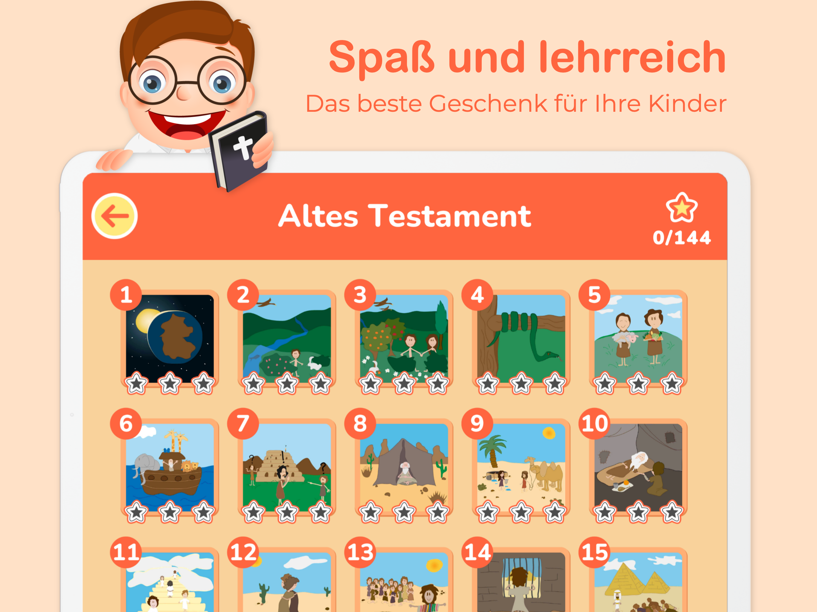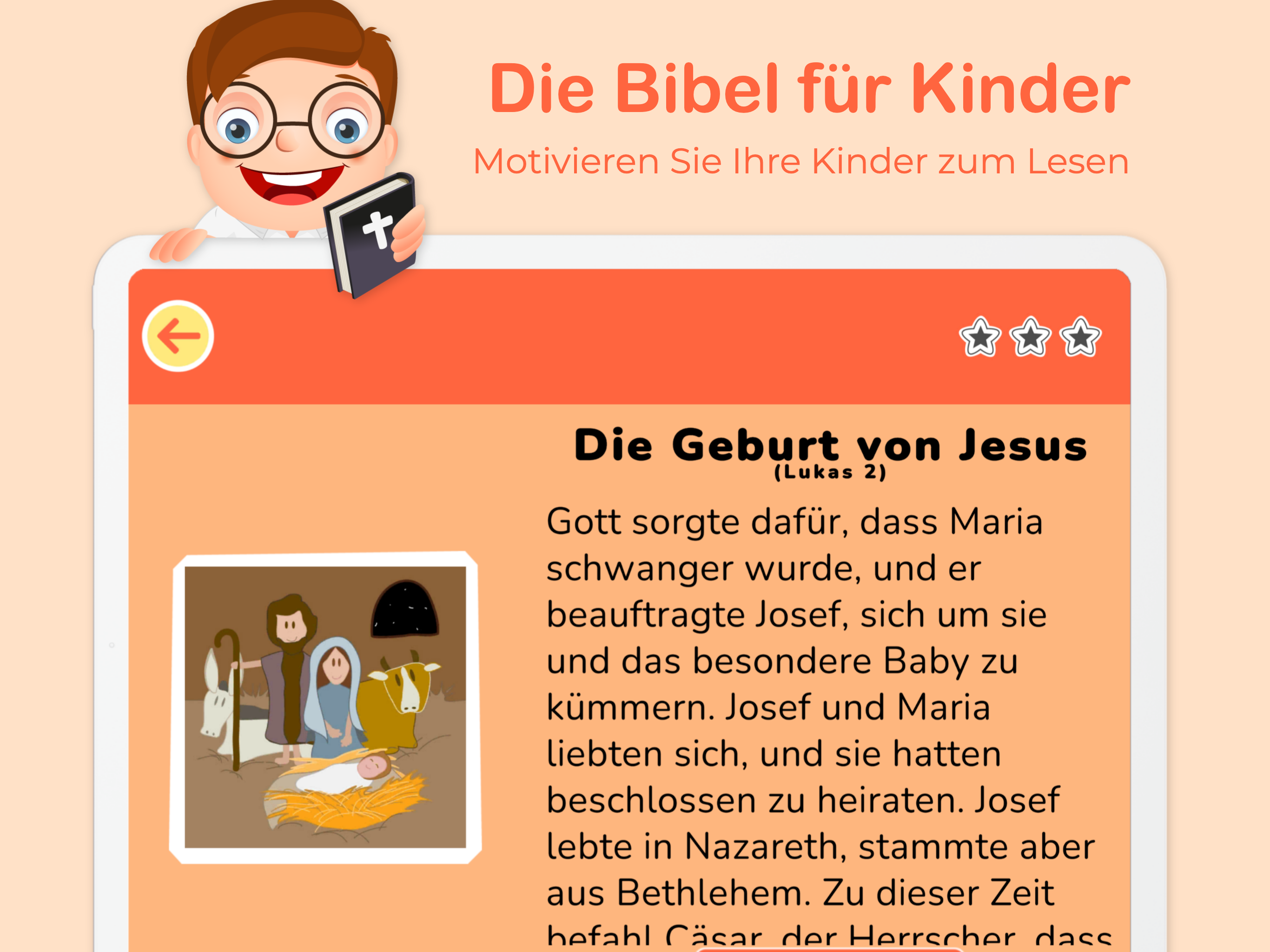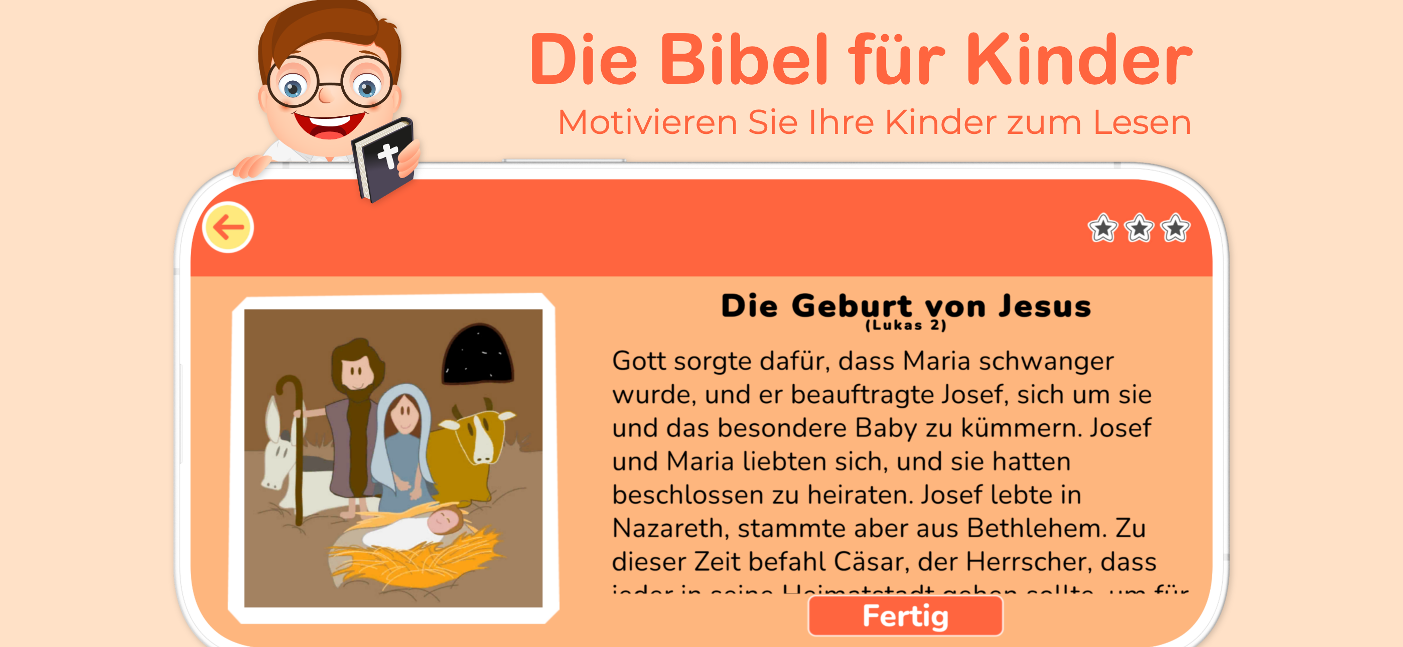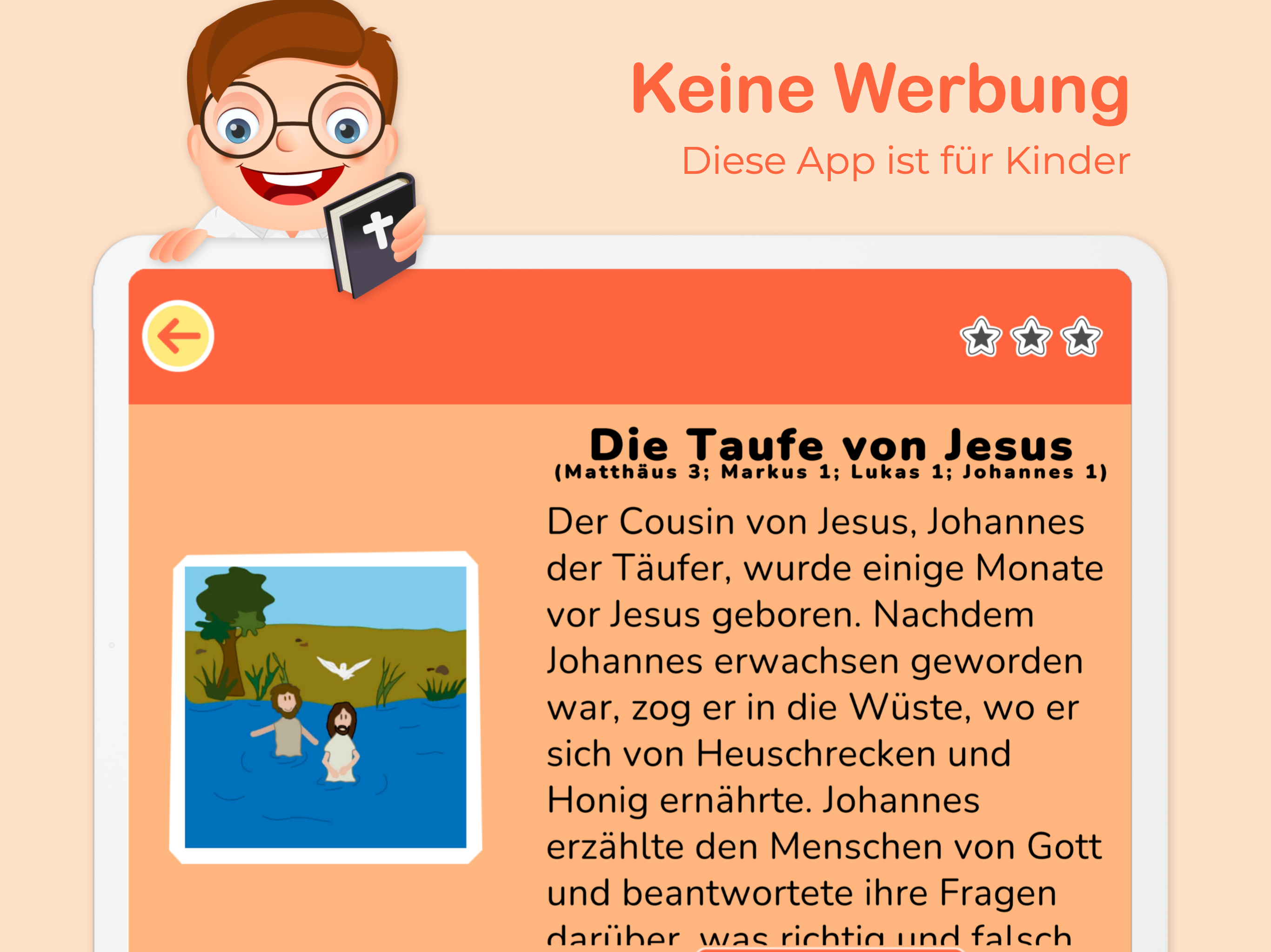 Nach jedem Bibeltext beantwortet das Kind ein paar Fragen zur Leseverständnis. Ein Sternesystem motiviert zusätzlich. Deine Kinder werden es lieben!