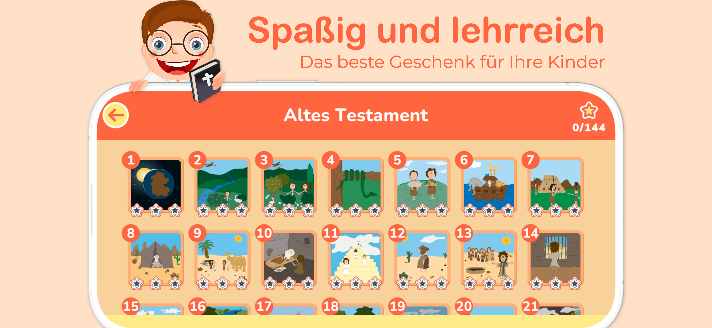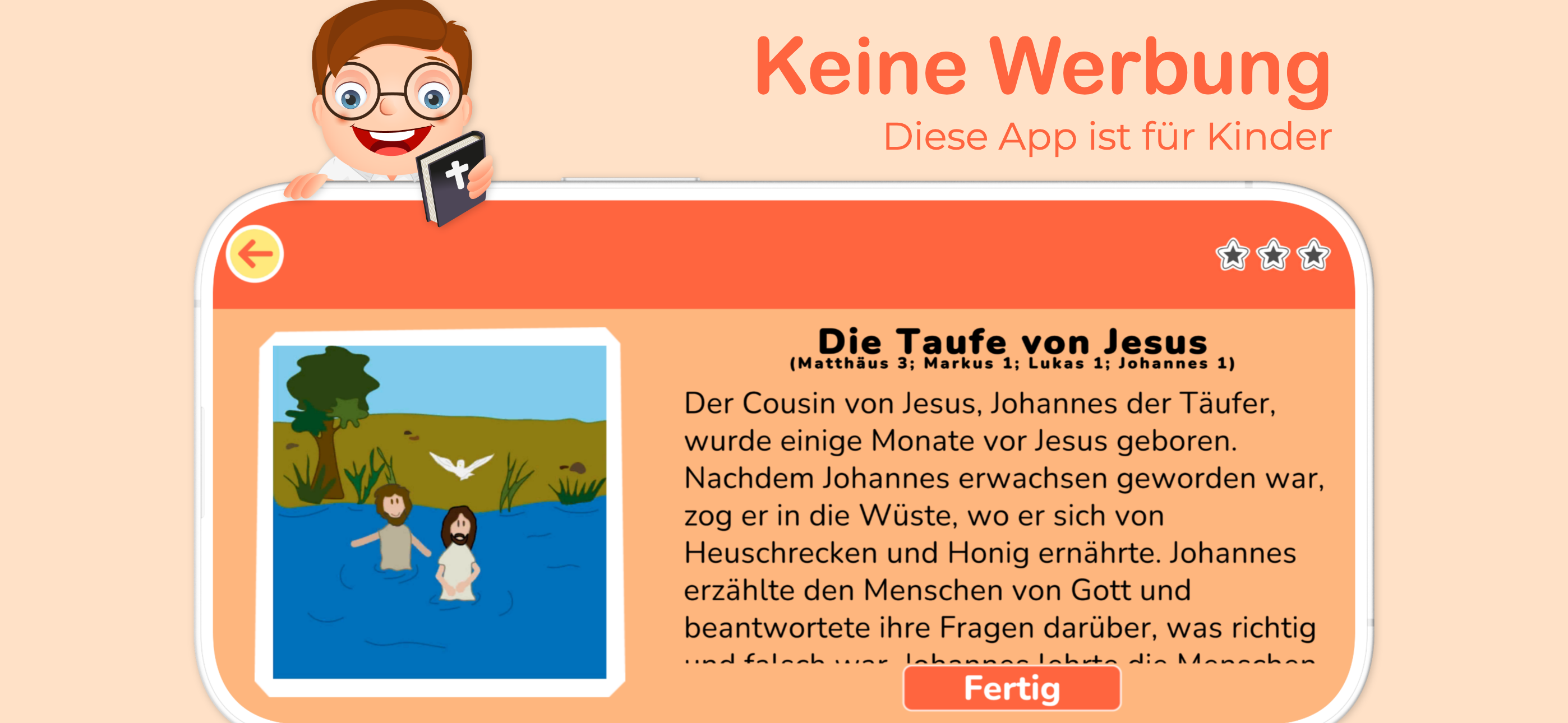 Die Bibel-App für Kinder! Von Genesis bis Offenbarung führt „Ich Lese – Die Bibel für Kinder“ Kinder auf eine spannende Reise durch biblische Geschichten in Form kurzer christlicher Erzählungen. Kein WLAN nötig.