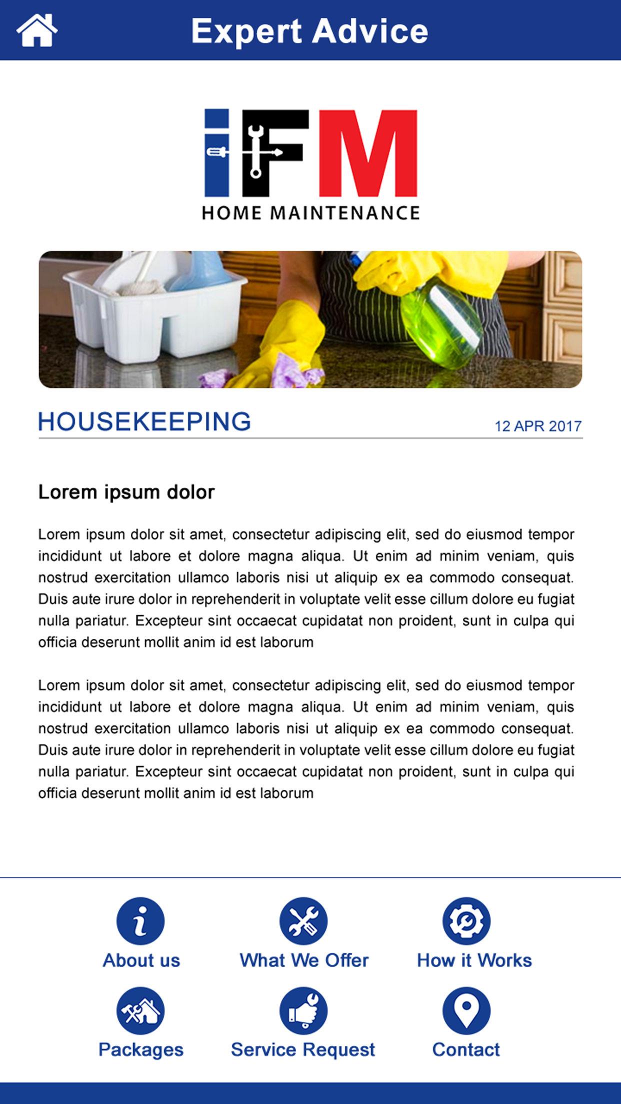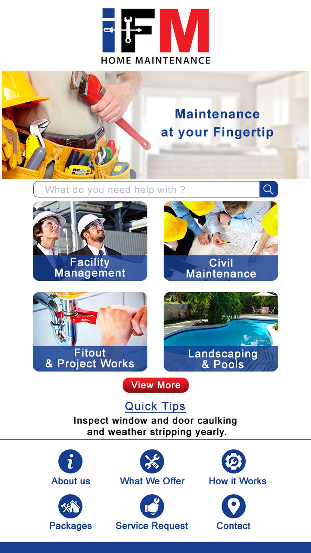 User-App und Web-Portal: • Landing Page mit einem Brief an IFM und seine Angebote • einfache und unkomplizierte Registrierung mit Facebook und Google als Alternativen auf die App zugreifen • Optionen zum Hinzufügen mehrerer Eigenschaften unter einer Registrierung • Heben Sie Tickets für jede Immobilie Getrennt • View Paketdetails (Usage & Ablauf) mit Upgrade-Paket • Mehrere Anruf Counts für jeden Dienst auf Package • Einen einfachen 5 Schritt Prozess Verwenden Sie eine Serviceanfrag mit dem Tippen eines Button Raise • Akzeptieren und Ablehnen Quote In-App • Zahlungen ausführen In-App • View Rechnung und Beleg In-App Erhalten • Vollständige Zusammenfassung des Ticket Raised • Überprüfen Ticket Status Update • Rückmeldung geben • View Zitate • Push-Benachrichtigungen / Warnungen für alle Tickets, Veranstaltungen • Empfangen von Mail-Benachrichtigungen über die eingetragene Adresse