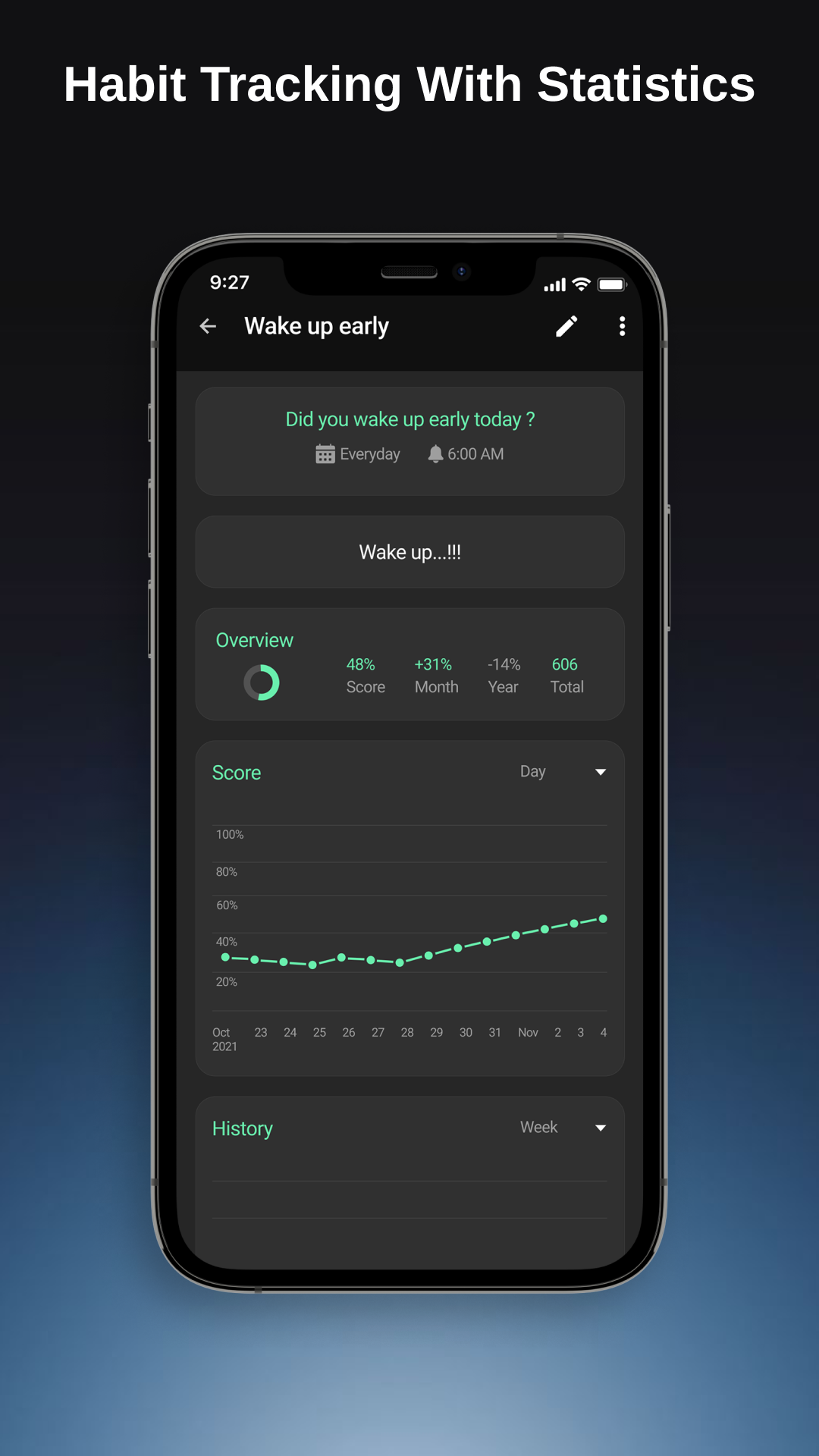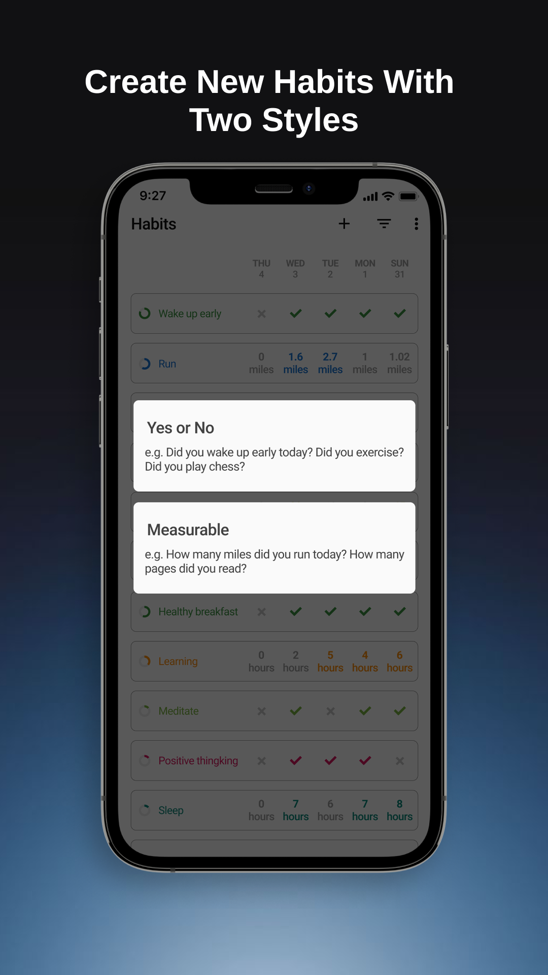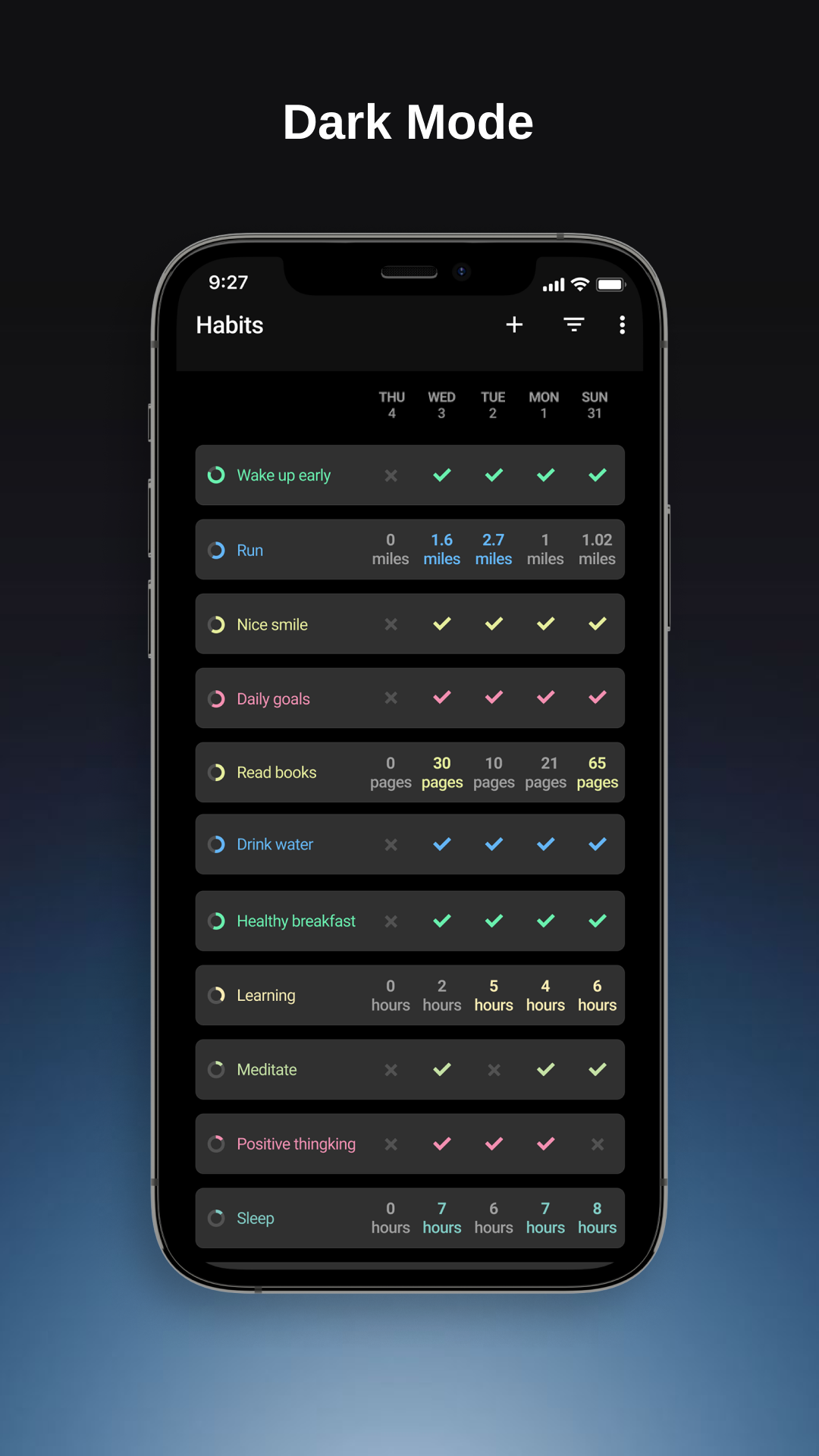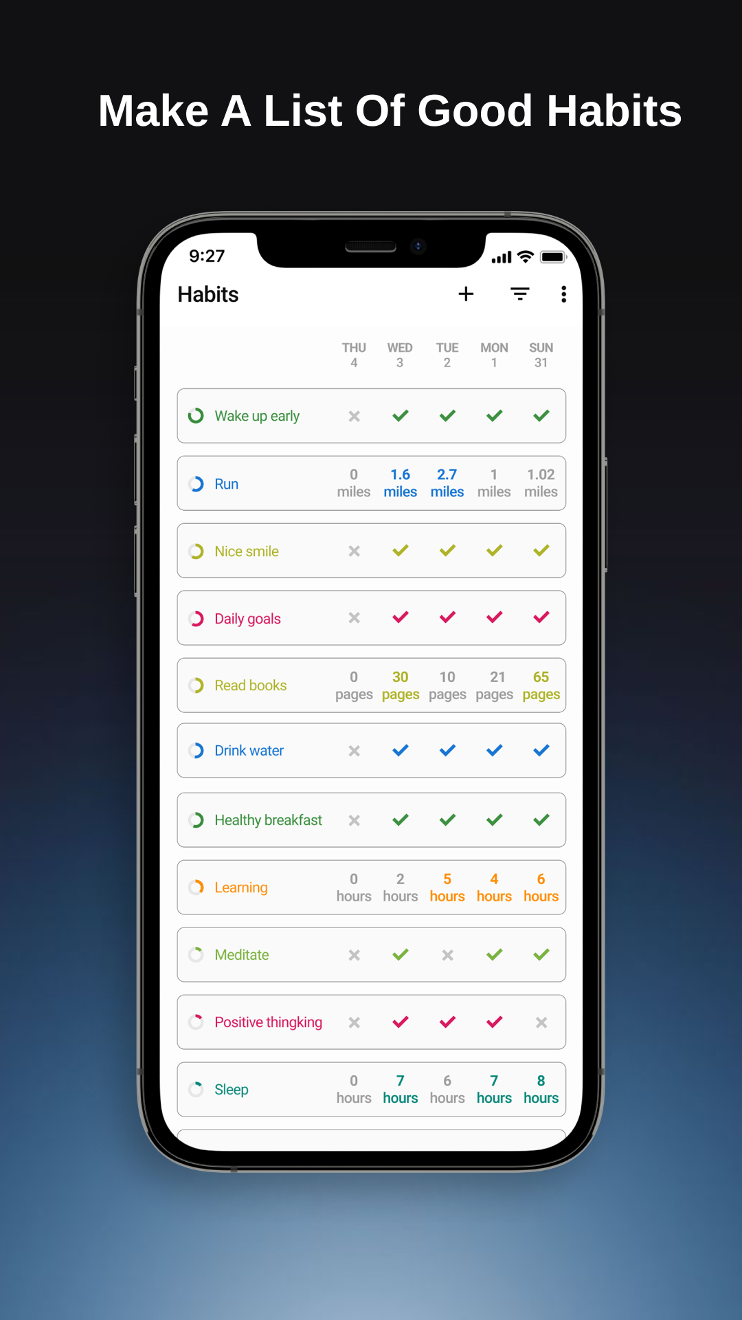 Die Gewohnheitstracker-App hilft Ihnen, gute Gewohnheiten aufzubauen, gesunde Gewohnheiten beizubehalten und Ihre Ziele zu erreichen. Die Gewohnheitstracker-App erinnert Sie bei Bedarf, verfolgt Gewohnheiten mit Statistiken und Notizen, analysiert Gewohnheiten mit Diagrammen und erreicht so Ihre Ziele mit Leichtigkeit. iHabit: Habit-Tracker-App Erstellen Sie persönliche Aufgabenlisten, verfolgen Sie Ihre Ziele und motivieren Sie sich, neue Höhen zu erreichen! Habit Tracker & Planner-App Konzentrieren Sie sich auf Ihre Routine und beginnen Sie mit dem Aufbau gesunder Gewohnheiten. Baue gute Gewohnheiten auf und breche schlechte. Baue gute Gewohnheiten auf, die Habit-Tracker-App hilft dir dabei, gute Gewohnheiten zu entwickeln und beizubehalten, um deine langfristigen Ziele zu erreichen. ------------ Nützliche Funktionen ------------ ✓ Schöne, minimalistische und leichte Benutzeroberfläche Die Habit Tracker-App hat eine elegante und minimalistische Benutzeroberfläche, die selbst für Erstbenutzer sehr einfach zu bedienen ist. Heller Modus und dunkler Modus. ✓ Verschiedene Arten von Gewohnheiten + Ja oder Nein: z.B. Bist du heute früh aufgewacht? Hast du trainiert? Hast du Schach gespielt? + Messbar z.B. Wie viele Kilometer bist du heute gelaufen? Wie viele Seiten hast du gelesen? ✓ Leistungsstarke Statistiken Verfolgen Sie Gewohnheiten mit Statistiken und Notizen, analysieren Sie Gewohnheiten mit Diagrammen und erreichen Sie so Ihre Ziele mit Leichtigkeit. ✓ Erinnerungen Die Habit Tracker App erstellt eine individuelle Erinnerung für jede Gewohnheit. Baue gute Gewohnheiten auf und breche schlechte. Sie können mehr als eine Erinnerung für jede Gewohnheit festlegen. ✓ Widgets Die Habit Tracker-App verfügt über bunte Widgets, mit denen Sie Ihre Gewohnheiten direkt von Ihrem Startbildschirm aus verfolgen können, ohne die App überhaupt öffnen zu müssen. ✓ Gewohnheitspunktzahl, Häufigkeit, Verlauf, Streifen und Ziel Die iHabit - Habit Tracker-App verfügt über eine fortschrittliche Formel zur Berechnung der Stärke Ihrer Gewohnheiten. ✓ Sicherung & Synchronisierung iHabit - Habit Tracker App ermöglicht es Ihnen, es in Tabellenkalkulationen (CSV) oder in eine Datenbankdatei (SQLite) zu exportieren. Die Gewohnheitstracker-App verfügt über Funktionen, die detaillierte Diagramme und Statistiken erstellen, die Ihnen zeigen, wie sich Ihre Gewohnheiten im Laufe der Zeit verbessert haben. Verfolgen Sie so viele Gewohnheiten, wie Sie möchten. iHabit - Habit Tracker App setzt keine künstlichen Grenzen, wie viele Gewohnheiten Sie haben können. Erstellen Sie neue gesunde Gewohnheiten, bauen Sie gute Gewohnheiten auf und erreichen Sie jetzt Ihre Ziele! Baue gute Gewohnheiten auf und breche schlechte. iHabit - Gewohnheits-Tracking-App hilft Ihnen dabei. Mit iHabit - Habit Tracker App wird es Ihre tägliche Routine vereinfachen, Ihren Geist klarer machen, Ihr Ziel erreichbar machen, Ihr Leben verbessern und Ihren Traum endlich wahr werden lassen. 👊 Jetzt herunterladen, du wirst es nicht bereuen.