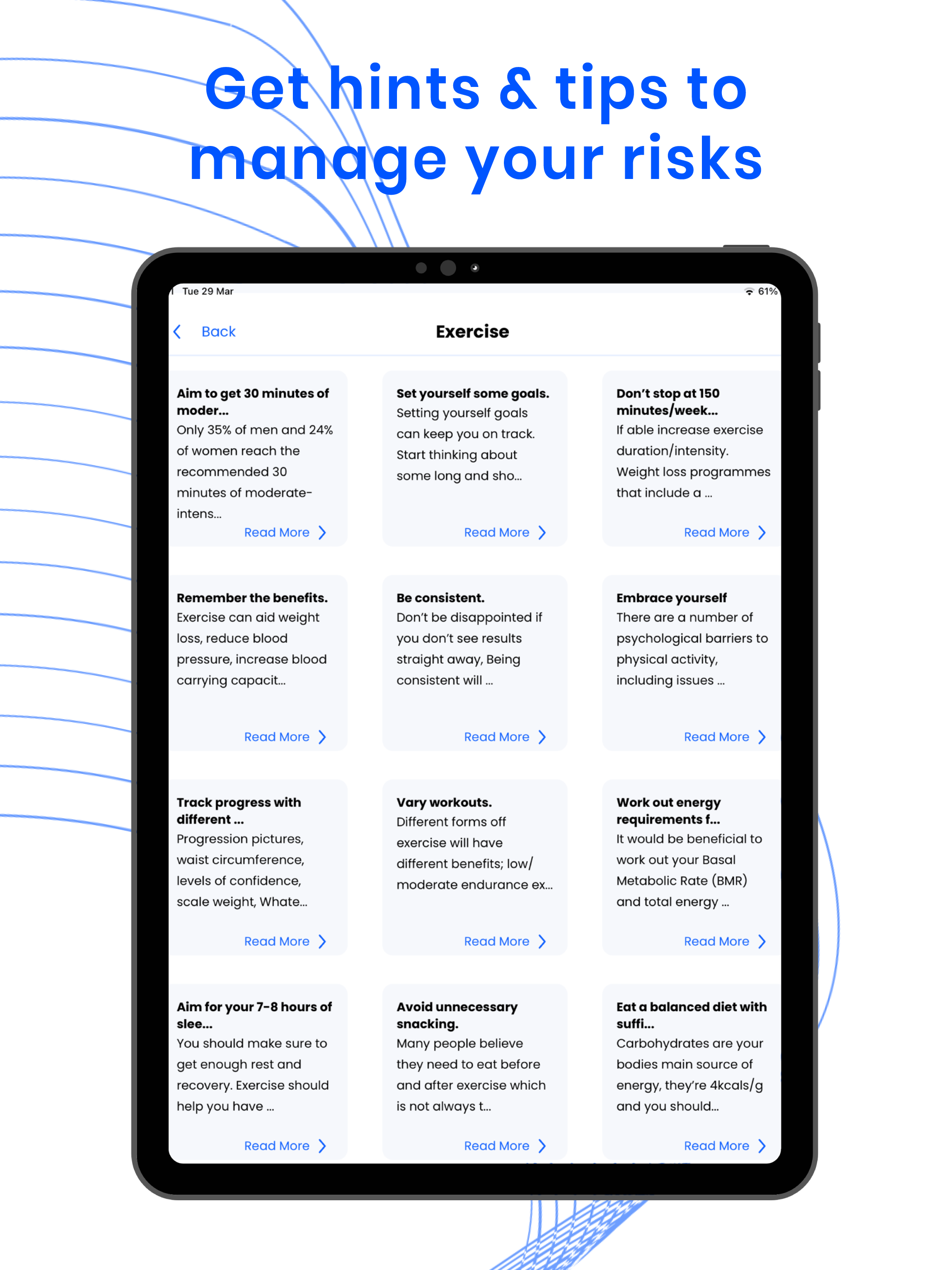 • Diabetes-Tracker: Erhalte Erinnerungen und Tipps, wie du auf deinen Blutdruck, Blutzucker, Ernährung, Bewegung, Füße, Augen, Nieren und kardiovaskuläre Risiken achten kannst