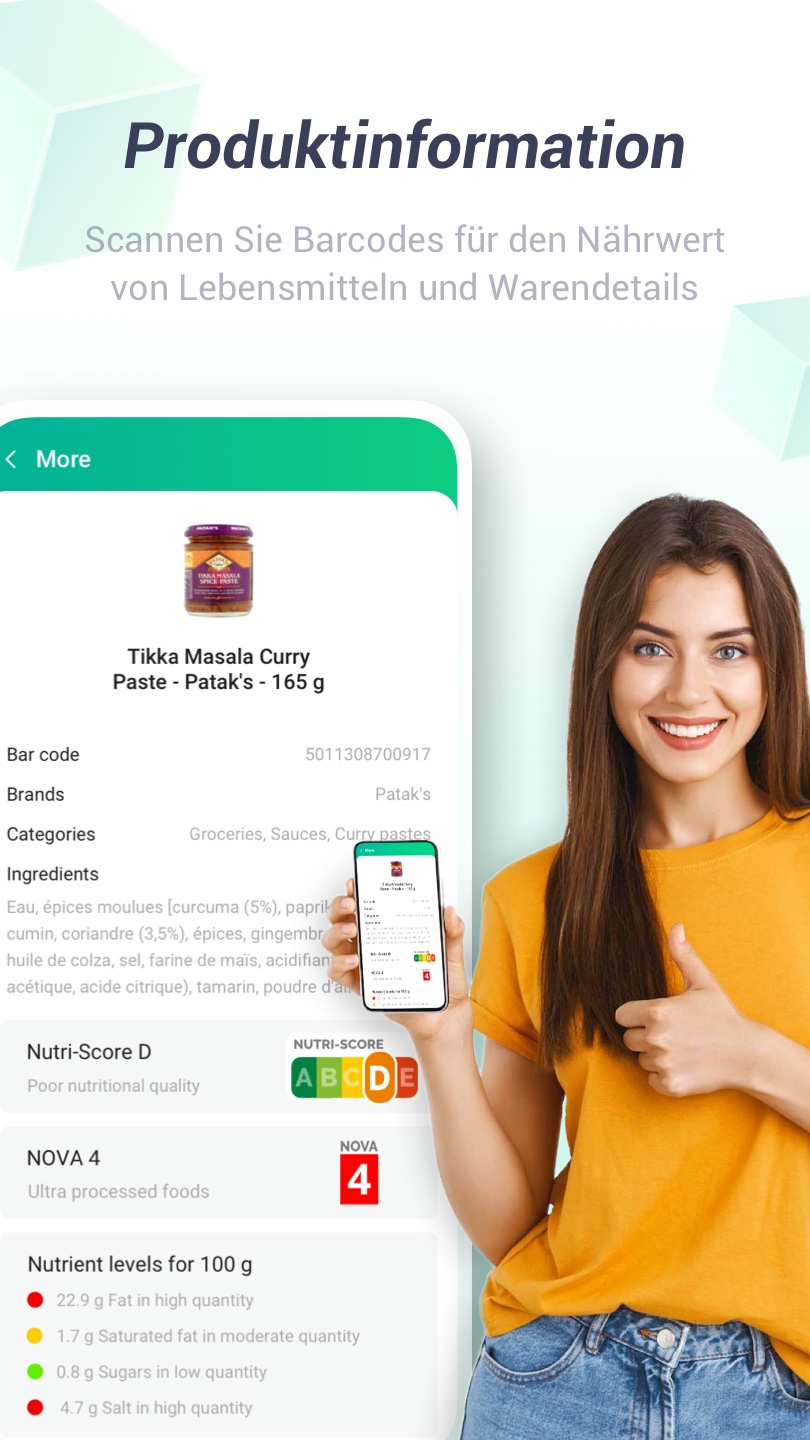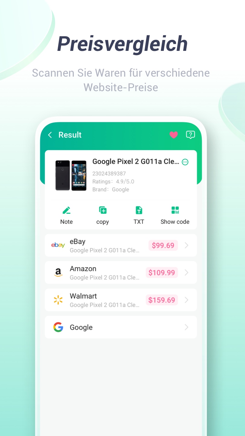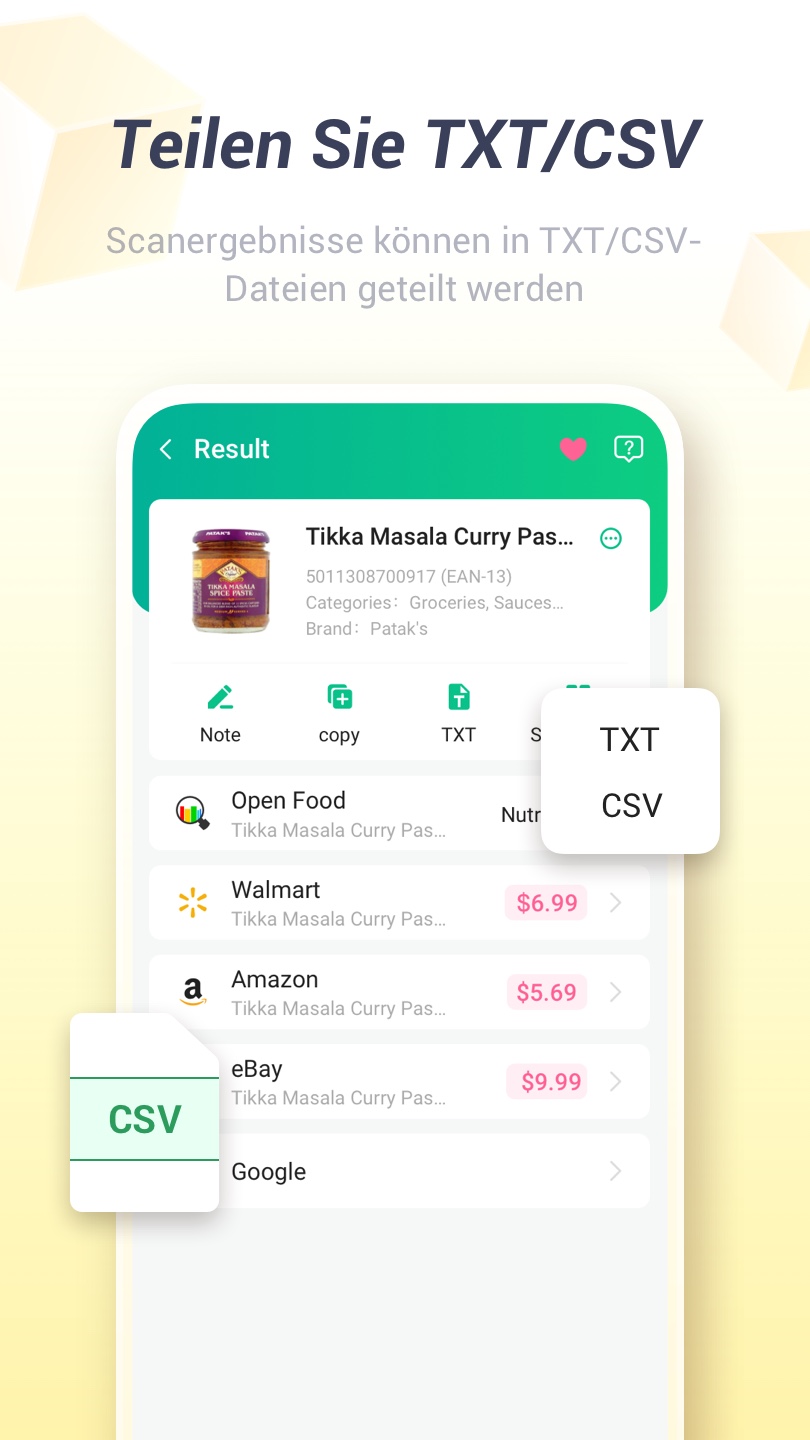 👍 iScanner ist ein vielseitiger und praktischer Scanner, der QR-Codes und Barcodes unterstützt. Sie können iScanner für weitere Informationen verwenden. Sie können Produkte online scannen und Preise vergleichen. Sie können auch Ihren eigenen QR-Code erstellen, der jederzeit angezeigt werden kann. Sie können iScanner auch als QR- und Barcode-Manager verwenden. Was kann iScanner scannen? 📰 Produktinformationen: Erhalten Sie schnell Produktname, Spezifikation, Kategorie, Produkt, Hersteller und andere Informationen; 💰 Preisvergleich: Vergleichen Sie Preise auf gängigen E-Commerce-Plattformen wie eBay, Amazon und Walmart, um Sorgen, Aufwand und Geld zu sparen. 📈 Historischer Preis: Ermitteln Sie ganz einfach den Preis des entsprechenden Produkts in verschiedenen Zeiträumen und erhalten Sie den niedrigsten Preis. 🔍 Produktsuche: Wechseln Sie schnell zu verschiedenen Websites, um die neuesten realen Preise zu erhalten. 🍗 Lebensmittelsicherheit: Scannen Sie den QR-Code, um die Zutatenliste, den Nährwert und die Inhaltsstoffanalyse des Lebensmittels zu erhalten. 📚 Buchinformationen: Identifizieren Sie ganz einfach den Autor, den Herausgeber, die Biografie, die Sprache und das Veröffentlichungsdatum des Buchs 📞 Soziale Medien: Erstellen Sie QR-Codes für gängige Social-Media-Konten wie Facebook, Instagram, Twitter, WhatsApp usw. 📧 E-Mail: Scannen Sie E-Mails, um sie mit einem Klick zu versenden, einfach und bequem. ☎️ Telefon: Sie können die Kontaktinformationen schnell abrufen, was Zeit und Mühe spart. 👍 Funktionen ✨ Produktpreis erhalten --Scannen Sie Produkte, erhalten Sie echte Preise, vergleichen Sie Produktpreise, wählen Sie den besten Preis, sparen Sie Geld und machen Sie sich Sorgen. 🔜 Einfach und bequem - Flexible und einfache Bedienung, QR-Code einfach ausrichten und weitere interessante Informationen entdecken. 😍 Unterstützt mehr als 36 QR-Code- und Barcode-Formate - Mit unserem eingebauten Lesegerät können Sie ganz einfach jeden QR-Code und Barcode scannen. 🔐 Schneller Zugriff auf WLAN - QR-Code scannen, um Anmeldeinformationen festzulegen und in Sekundenschnelle eine WLAN-Verbindung herzustellen. 🔦 Lichter und Galerien - Automatisches Zoomen und Scannen mit Licht in dunklen Umgebungen. - Sie können den QR-Code/Barcode aus der Galerie scannen. 📃 Einfacher Export - Ein-Klick-Export gescannter Inhalte in das CSV/TXT-Format 🏦 QR-Code- und Barcode-Manager - Der gesamte Scanverlauf wird jederzeit zur schnellen Überprüfung gespeichert. Sie können den QR-Code/Barcode in Ihrem Telefon speichern. - Sie können Kontakte in Ihrem Telefon speichern. - Sie können verschiedene Arten von Informationen erstellen und verwalten. 🔐 Sicher - iScanner benötigt nur eine Kameraerlaubnis, um Ihre Privatsphäre zu schützen. 💗💗💗 Laden Sie es herunter und probieren Sie es aus. iScanner lässt Sie nicht im Stich! Es wird zu Ihrer sorgenfreisten QR-Code-Haushälterin und bringt Ihnen ein bequemes und komfortables Leben!