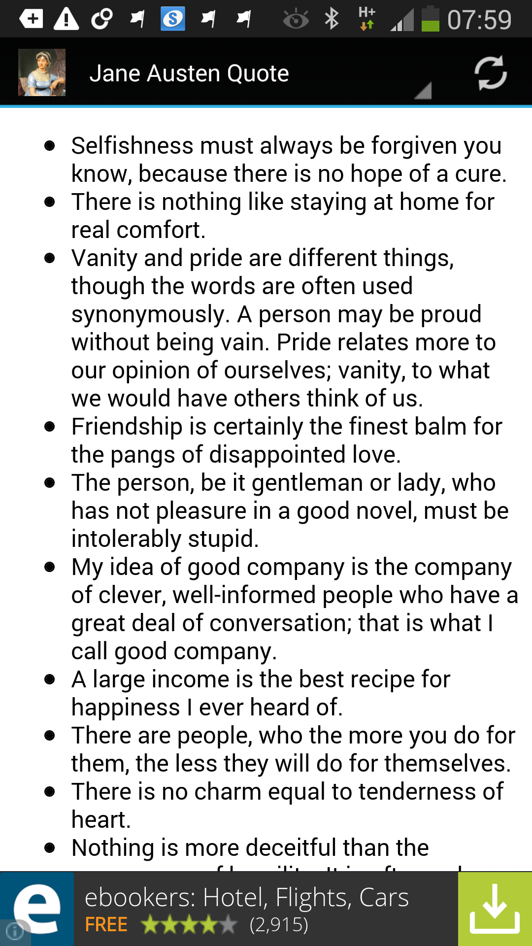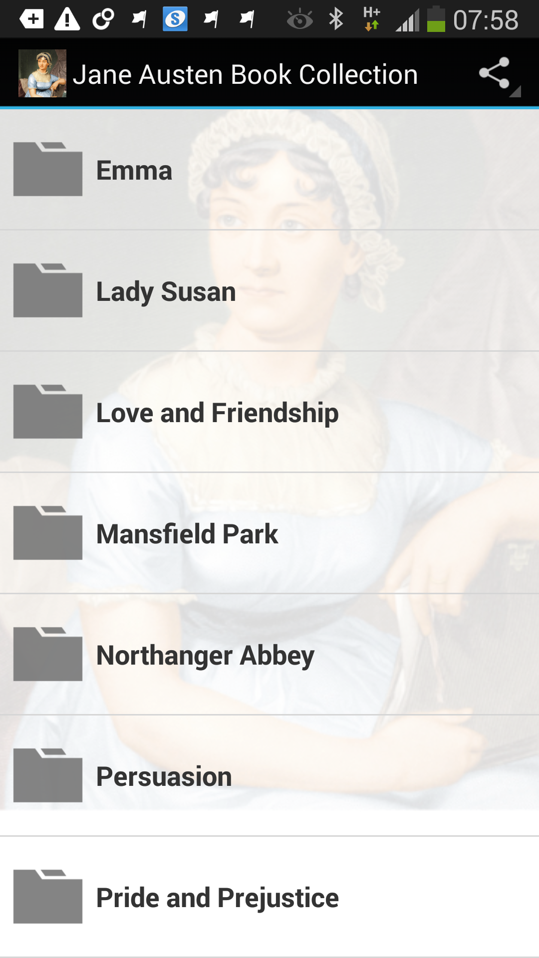 This App contains a total of 8 ebooks with all major works such as Emma, Mansfield Park, Persuasion, Pride and Prejustice, Sense and Sensibility. Just added: In addition to the collection of free ebooks, this app now also includes the free Jane Austen audio book collection. Most of them are "dramatic reading" versions. Enjoy! PLUS FREE Bonus Books: Jane Austen, Her Life and Letters Memoir of Jane Austen The Letters of Jane Austen Bonus 2: Jane Austen Quotes All Books are HTML Format. No ebook reader needed! This is an ad-supported free app, but without the annoying push ads! =========== DISCLAIMER =========== All Books and audio books are out of copyright and in public domain. All material in this app shall only be used for personal, non-commercial purposes.