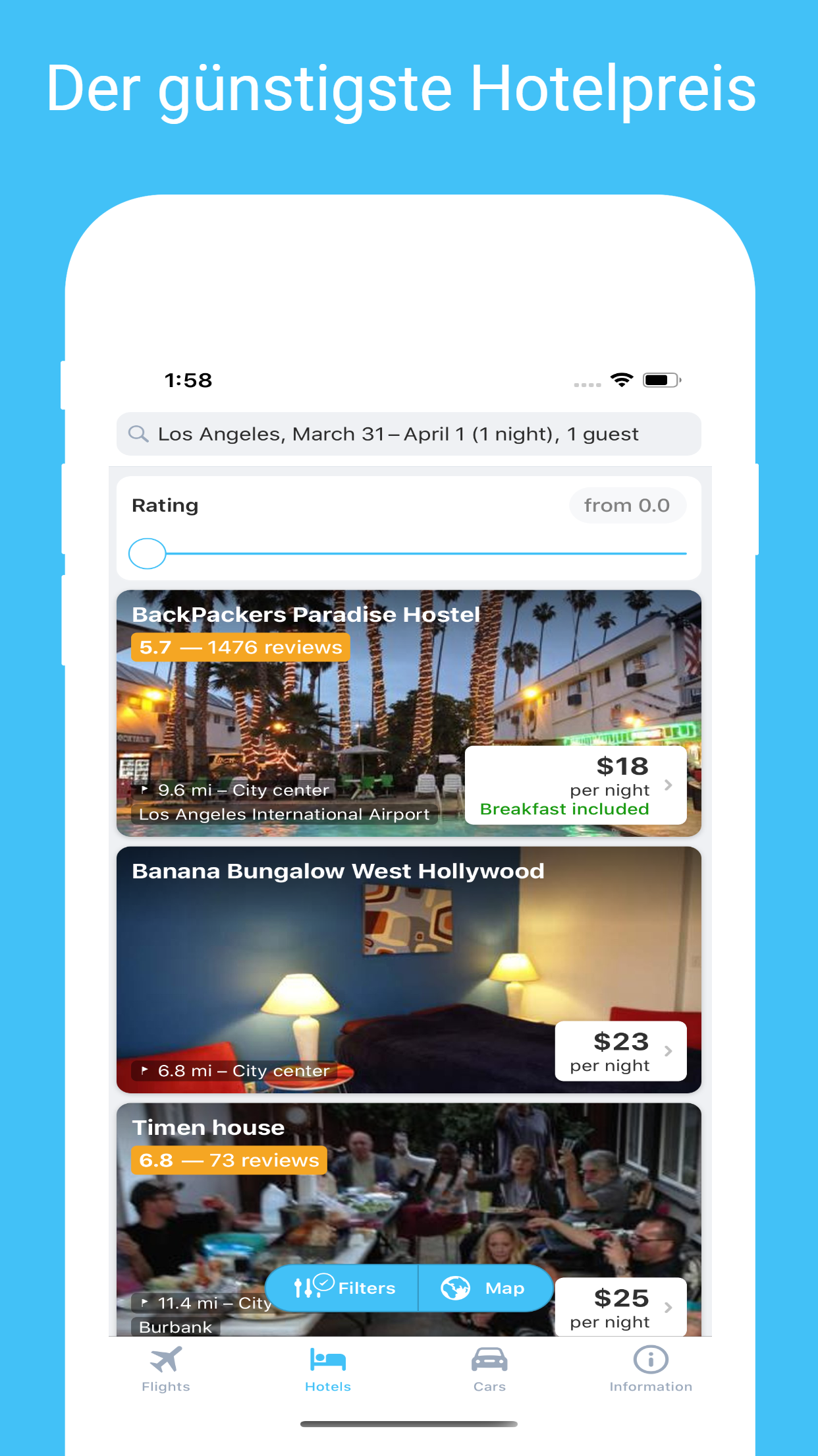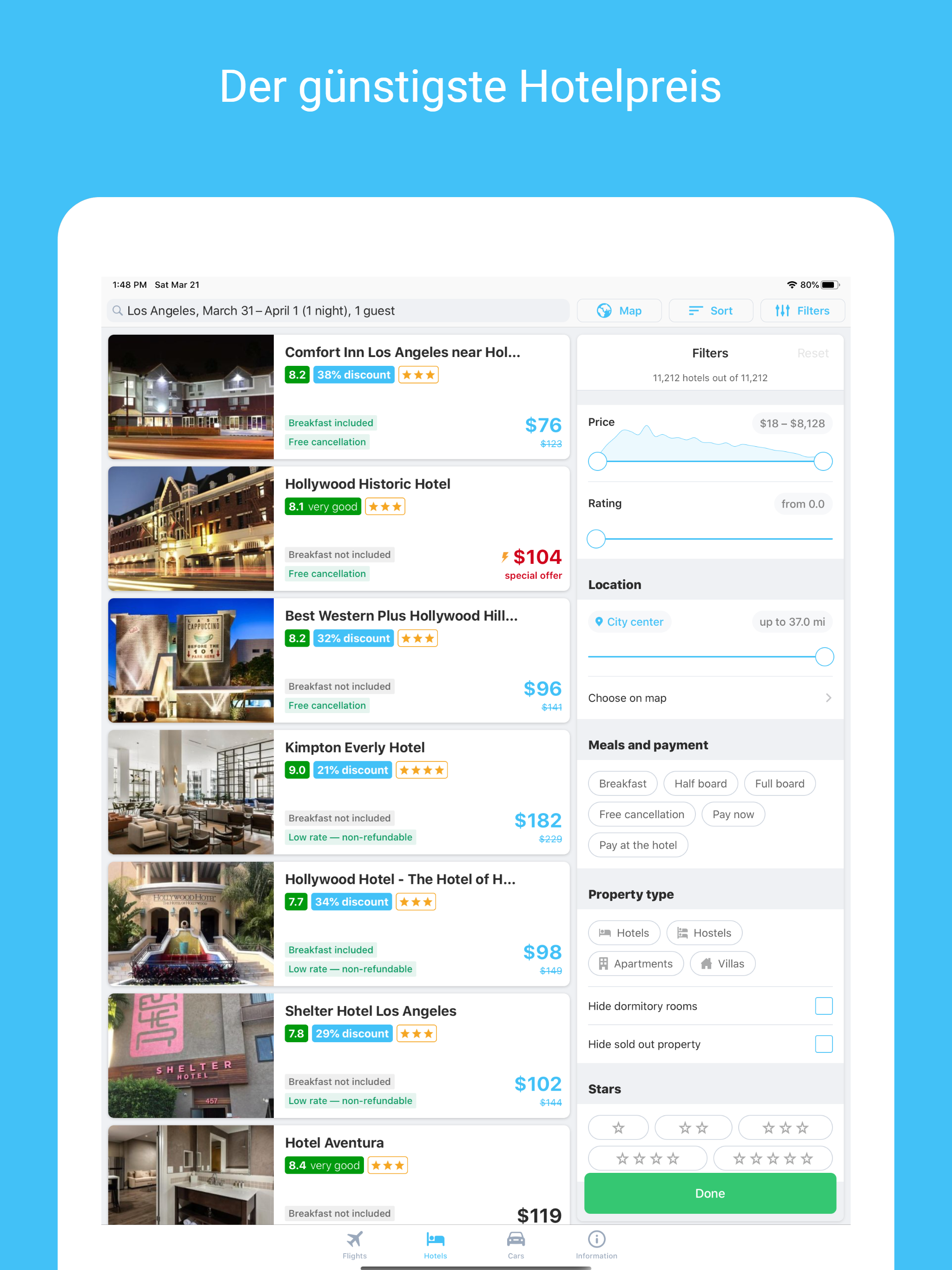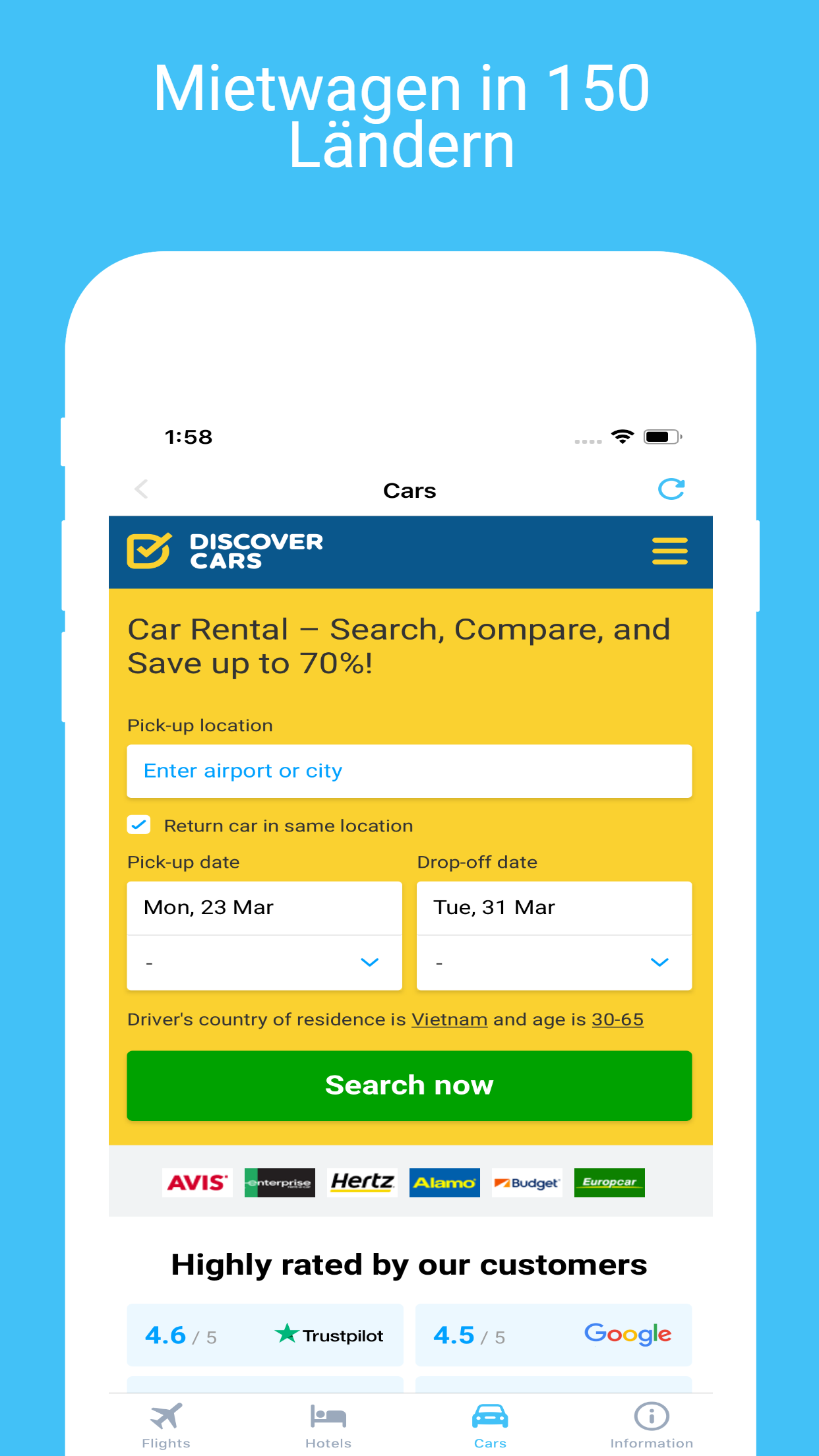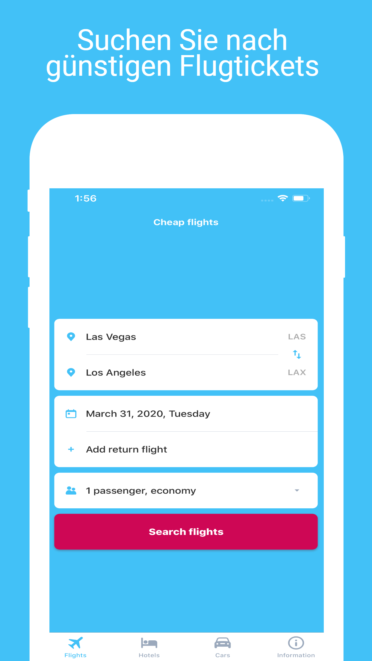 Jetgo ist eine Anwendung, mit der Sie nach günstigen Flugtickets von mehr als 1.000 Fluggesellschaften und Reisebüros suchen können. Wir verkaufen keine Tickets, wir helfen Ihnen, den besten Preis für Ihre Reise zu finden. * FINDEN SIE DEN BESTEN PREISFLUG Suchen und vergleichen Sie Tausende von Flügen an einem Ort. Sie müssen nur Ihre Reisedaten und Reiseziele eingeben, wir finden die günstigsten Flüge. Wenn Sie nicht bereit sind, ein Ticket zu buchen, können Sie sich auf den Ticketpreis beziehen und jederzeit zurückkehren. * WÄHLEN SIE DAS RICHTIGE HOTEL Wir helfen Ihnen nicht nur bei der Suche nach Flugtickets, sondern auch bei der Suche nach einer Unterkunft. Vergleichen Sie die Preise von Tausenden von Hotels, Resorts, Apartments und Motels weltweit. Oder suchen Sie sich ein Zimmer in der Nähe Ihres aktuellen Standorts und suchen Sie nach Last-Minute-Angeboten. * Selbstfahrende Autovermietung Wählen Sie die Zeit und den Ort, an dem Sie ein Auto mieten möchten, und wir helfen Ihnen bei der Suche nach Angeboten. Sie können nach Fahrzeugtyp, Kraftstofftyp und Funktionen suchen. Sie können ein Auto in mehr als 150 Ländern mieten. * * KEINE HINZUGEFÜGTEN GEBÜHREN Wir berechnen keine zusätzliche Gebühr von unserer App. Es ist kostenlos. Hinweis: Verwenden Sie Jetgo, um nach Flugtickets zu suchen und die Hotelpreise für Ihre Reisen zu vergleichen. Vergessen Sie nicht, die Anwendung zu bewerten und mit Ihren Freunden zu teilen.