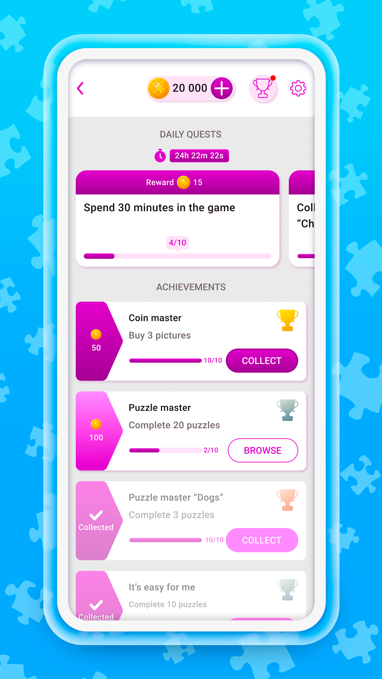 Wenn Sie ein Fan von Puzzle-Spielen sind, sollten Sie unbedingt Jigsaw Puzzle Masters ausprobieren. Dieses beliebte Puzzle-Spiel bietet mehr als 2000 bunte, hochwertige Bilder, die von den Spielern zusammengesetzt werden können, mit Kategorien wie süßen Kätzchen, malerischen Landschaften, abstrakter Kunst und mehr. Mit einer solch großen Auswahl gibt es für jeden etwas zu entdecken. Neben der Vielfalt an Puzzle-Kategorien bietet Jigsaw Puzzle Masters auch Mosaike unterschiedlicher Schwierigkeitsstufen. Ob Sie ein Anfänger sind, der einfache Puzzles mit nur 30 Teilen sucht, oder ein erfahrener Profi, der eine Herausforderung mit 500 Teilen oder mehr sucht, Sie werden etwas finden, das zu Ihren Fähigkeiten passt. Und mit täglich neuen Puzzle-Bildern gibt es immer wieder neue und aufregende Puzzles zum Lösen. Eines der großartigen Dinge an Jigsaw Puzzle Masters ist seine benutzerfreundliche Oberfläche. Egal, ob Sie auf einem Tablet oder einem anderen Gerät spielen, das Spiel ist für ein einfaches und intuitives Spielen optimiert. Das bedeutet, dass Sie stundenlang Puzzle-Spaß ohne die Frustration komplizierter Steuerelemente oder Menüs genießen können. Aber Jigsaw Puzzle Masters ist mehr als nur ein Puzzle-Spiel - es ist auch eine großartige Möglichkeit, nach einem langen Tag zu entspannen und zu beruhigen. Während Sie die bunten Bilder zusammensetzen, können Sie Ihre täglichen Sorgen vergessen und sich ganz auf die Aufgabe konzentrieren. Egal, ob Sie die Zeit vertreiben oder Ihre Problemlösungsfähigkeiten trainieren möchten, Jigsaw Puzzle Masters ist das perfekte Spiel für Sie. Erleben Sie das ultimative Gehirntraining mit unseren magischen Puzzles und Intelligenzspielen. Nutzen Sie unsere Gedächtnisspiele für Gedächtnistraining kostenlos und erleben Sie den Spaß an kniffligen Rätseln. Perfekt für Langeweile-Spiele und ideal als Puzzle kostenlos für Erwachsene in Deutsch. Eigenschaften: – Über 2000 Puzzle-Spiele kostenlos in HD-Qualität – Kategorien wie süße Kätzchen, Landschaften, abstrakte Kunst und mehr – Unterschiedliche Schwierigkeitsgrade: von einfachen 30-teiligen – Puzzles bis hin zu 500-teiligen Herausforderungen – Tägliche neue Puzzle-Bilder – Benutzerfreundliche Oberfläche für einfaches und intuitives Spielen – Perfekt für Gedächtnistraining und Gehirntraining Tauchen Sie ein in die Welt der Rätselspiele kostenlos und lassen Sie sich von Jigsaw Puzzle Masters begeistern. Ideal für Puzzle-Spiele kostenlos Deutsch für Erwachsene und für alle, die Spiele gegen Langeweile suchen.