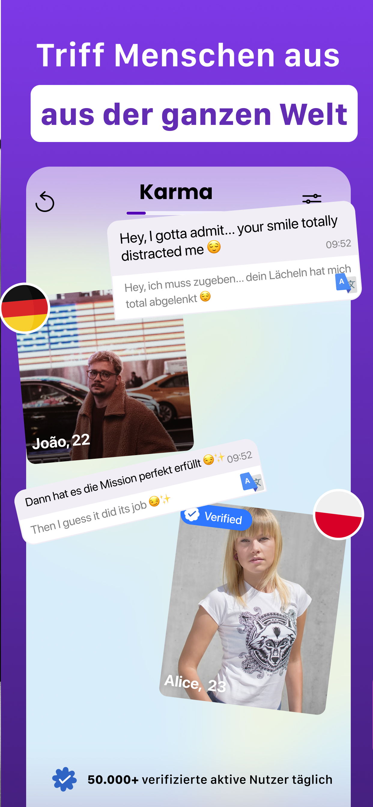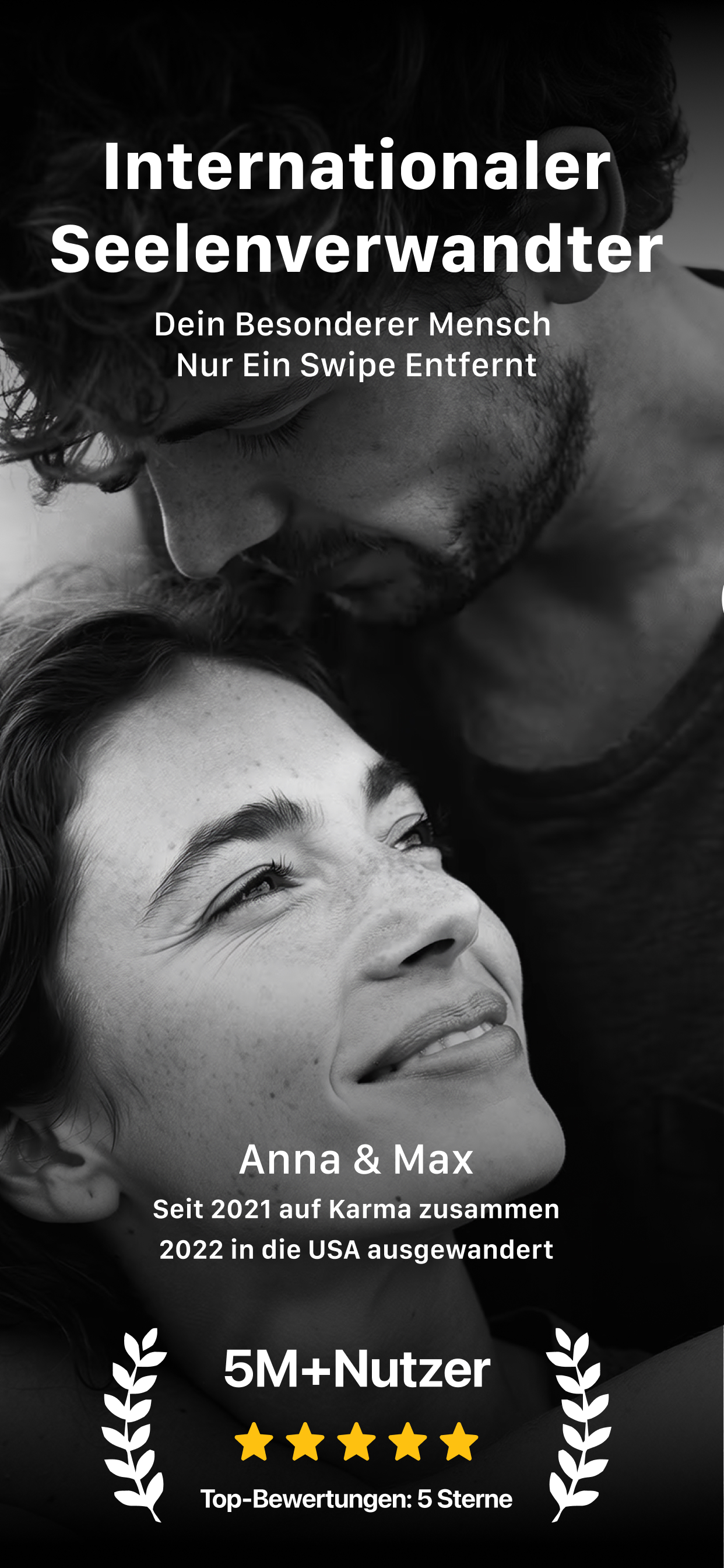 Lerne Singles aus aller Welt kennen, die eine Ehe suchen. Karma ist eine internationale Dating-App, die dir hilft, Menschen aus verschiedenen Ländern und Kulturen kennenzulernen. Egal, ob du nach Liebe, Freundschaft oder bedeutungsvollen Gesprächen suchst, Karma macht es einfach, Singles weltweit an einem sicheren und übersichtlichen Ort zu treffen. Erweitere deinen Dating-Horizont und entdecke neue Verbindungen über Ländergrenzen hinweg. Chatte frei, lerne andere Kulturen kennen und baue echte Beziehungen zu Menschen auf, die deine Interessen teilen, egal wo sie leben. Karma bringt Menschen zusammen und macht internationales Dating zu einem angenehmen Erlebnis. Karma wurde für echte Verbindungen entwickelt. Unser intelligentes Matching-System hilft dir, international kompatible Menschen zu entdecken, sodass jede Übereinstimmung relevanter und jedes Gespräch bedeutungsvoller wird. Warum Karma wählen? • Chatten und Singles aus verschiedenen Ländern kennenlernen • Neue Kulturen durch echte Gespräche entdecken • Sinnvolle internationale Verbindungen aufbauen • Einfache, schnelle und sichere Dating-Erfahrung Karma ist kostenlos herunterzuladen und einfach zu nutzen. Beginne sofort zu chatten, entdecke internationale Matches und bringe dein Dating-Leben auf ein globales Niveau. Premium-Funktionen stehen für Nutzer zur Verfügung, die unbegrenzte Matches, längere Chats und erweiterte Entdeckungstools wünschen. Lade Karma noch heute herunter und lerne Singles weltweit kennen. Privacy Policy [https://gokarma.app/gizlilik-sozlesmesi.html](https://gokarma.app/gizlilik-sozlesmesi.html) Terms of Use [https://gokarma.app/kullanim-kosullari.html](https://gokarma.app/kullanim-kosullari.html)