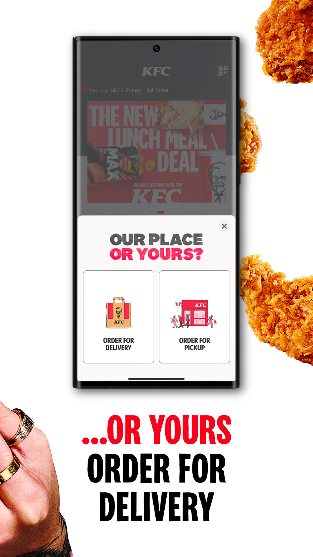 Das Bestellen Ihres Lieblings-KFC war noch nie so einfach wie mit der KFC-App. Nachdem Sie sich entschieden haben, was Sie bestellen möchten, entscheiden Sie, wie Sie es abholen möchten – direkt vor Ort, zum Mitnehmen, im Drive-in oder am Tisch, oder noch besser, lassen Sie es sich an Ihre Haustür liefern.
