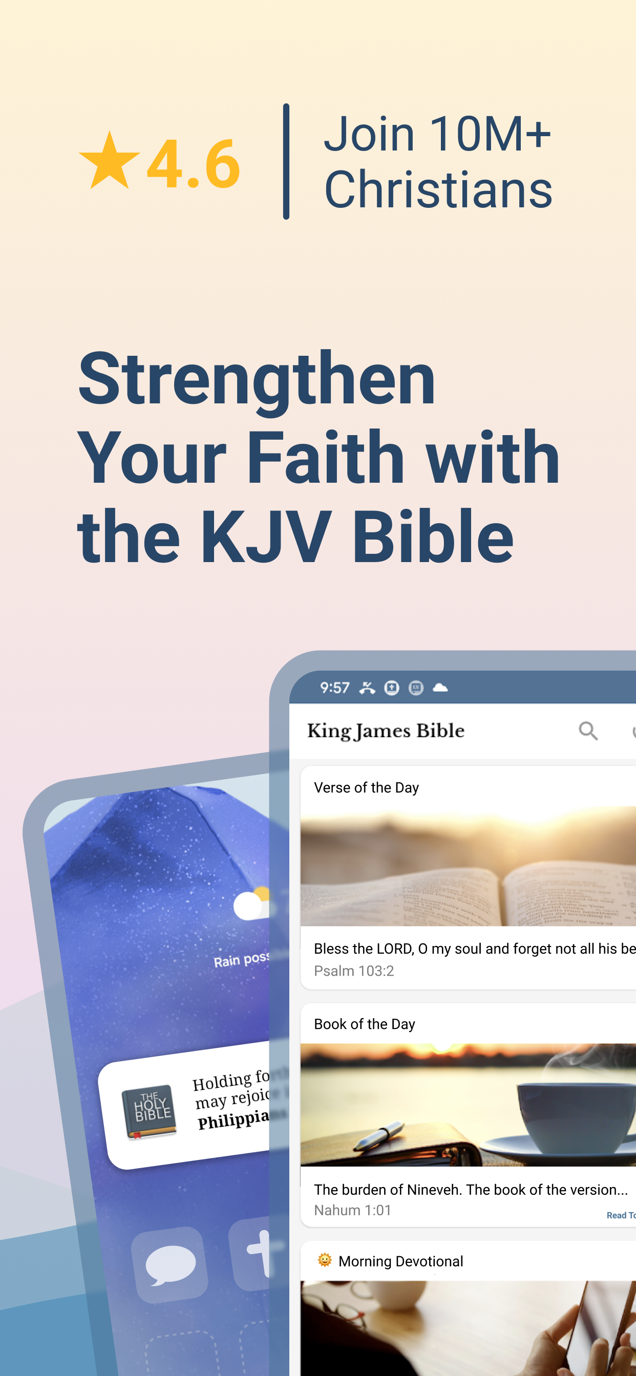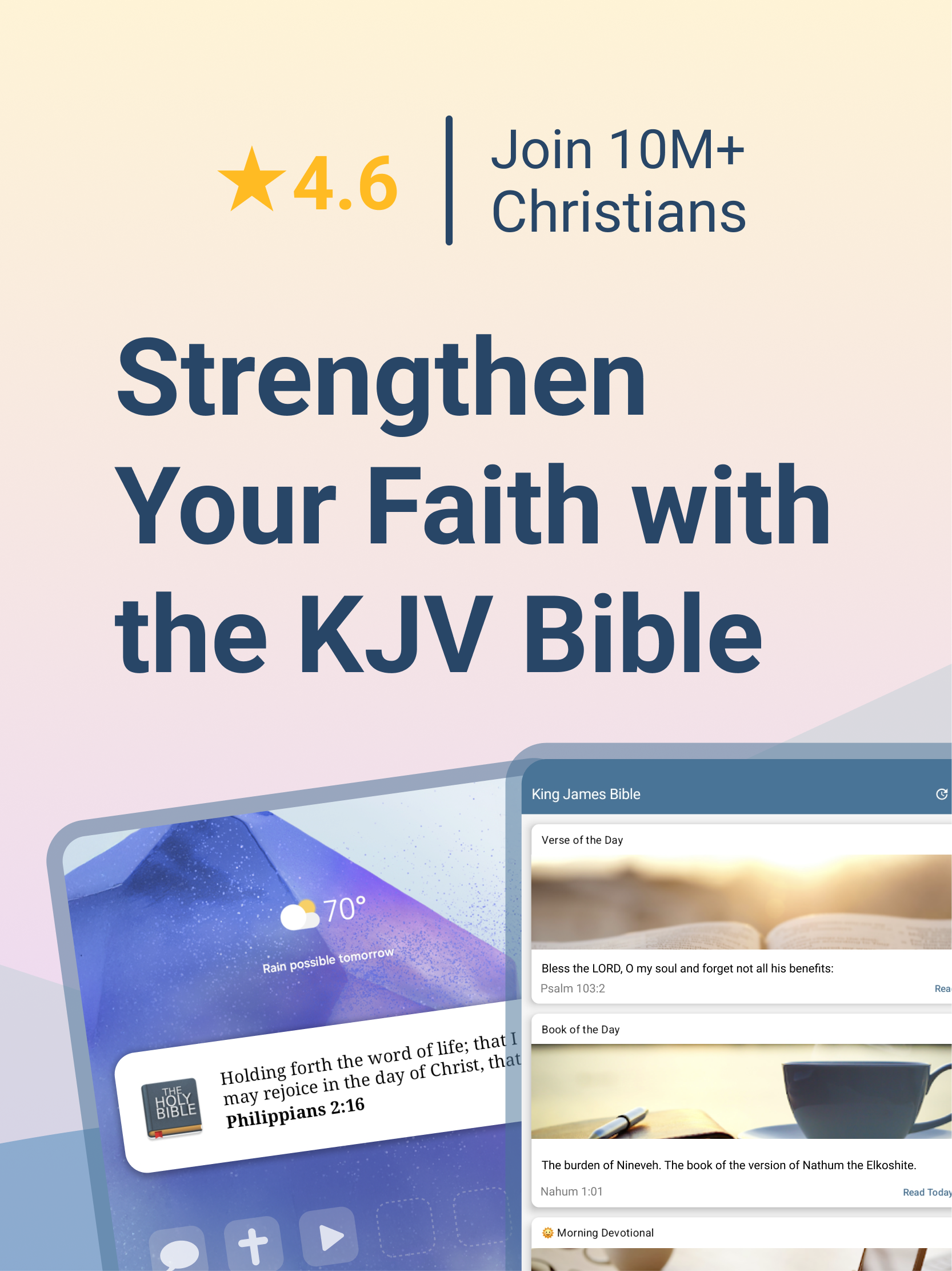 Bible KJV (Paketname: com.hmobile.biblekjv) wird von Salem Media Group entwickelt und die neueste Version von King James Bible Study KJV 4.4.16 wurde am 29. Januar 2026 aktualisiert. King James Bible Study KJV liegt in der Kategorie von Bücher & Nachschlagewerke mit der Funktion von Subscriptions. Sie können alle Apps von dem Entwickler der King James Bible Study KJV durchsuchen und 200 alternative Apps zu King James Bible Study KJV auf Android finden. Derzeit ist diese APP kostenlos. Diese App kann auf Android 8.0+ auf APKFab oder Google Play heruntergeladen werden. Alle APK/XAPK Dateien auf APKFab.com sind original und 100% sicher, schnell herunterzuladen.