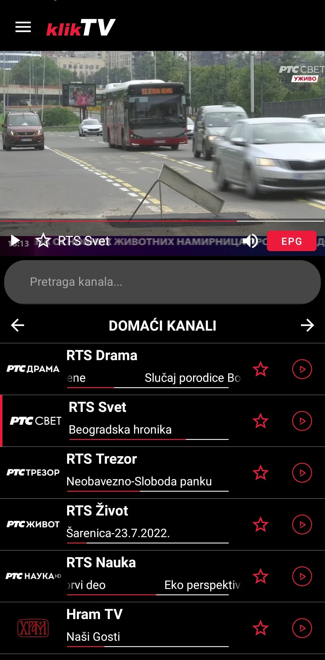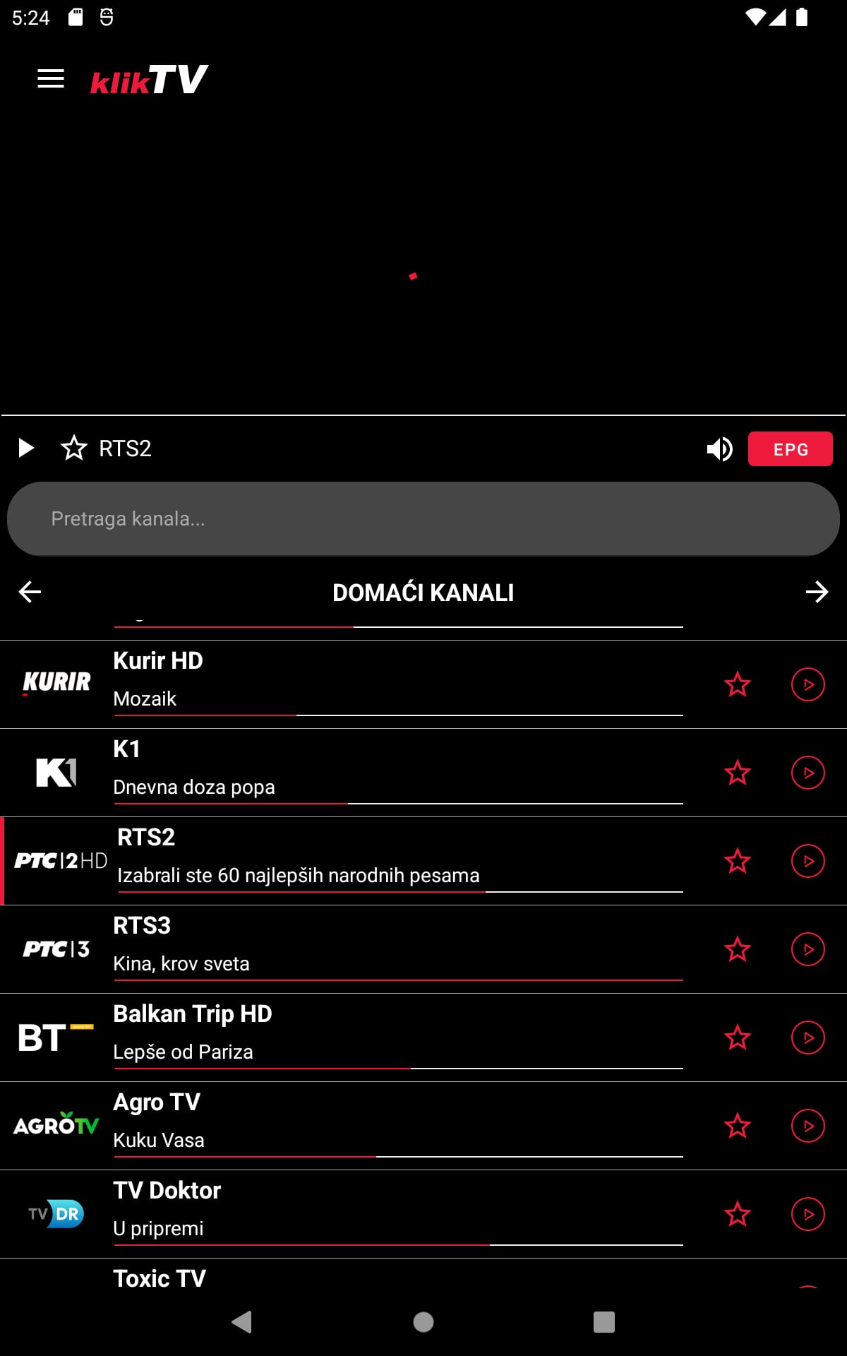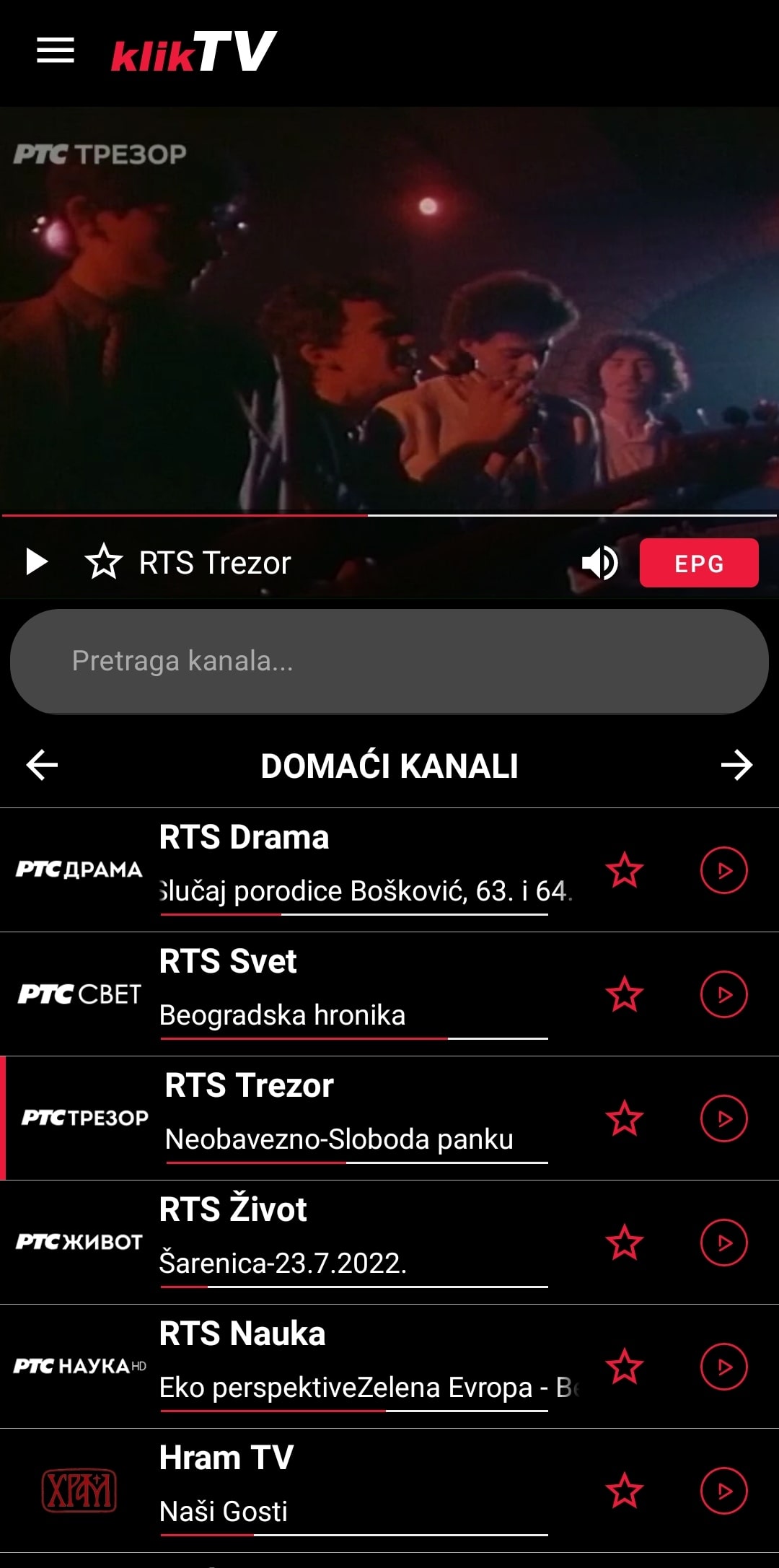 Sehen Sie sich Ihre Lieblingssendungen live über die Klik TV-Anwendung an. Sehen Sie sich Live-Pink-Kanäle, Zadruga-Kanäle sowie die neuesten Hollywood-Blockbuster an! Über 100 in- und ausländische Fernsehsender, die Sie über die KlikTV-Anwendung verfolgen können. Sie können KlikTV überall nutzen, egal ob Sie ein Handy, Tablet oder einen Computer zur Hand haben! Die einfache Bedienung ermöglicht es Ihnen, aufregende und beliebte Unterhaltungssendungen in Echtzeit zu sehen, 24 Stunden am Tag, 7 Tage die Woche. Die große Auswahl an Inhalten, die Klik TV bietet, ist ganz auf die Bedürfnisse der Nutzer abgestimmt und garantiert gute Unterhaltung für die ganze Familie!