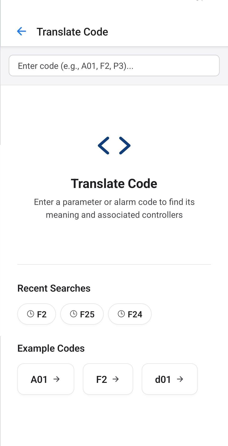 Laden Sie diese App herunter, um ein einfaches Offline-Tool zu erhalten, mit dem Sie schnell Alarm-, Fehler-, Status- und Parametercodes nachschauen können, ohne dass Sie ein Handbuch oder einen Laptop bei sich tragen müssen.